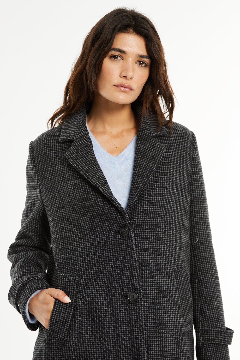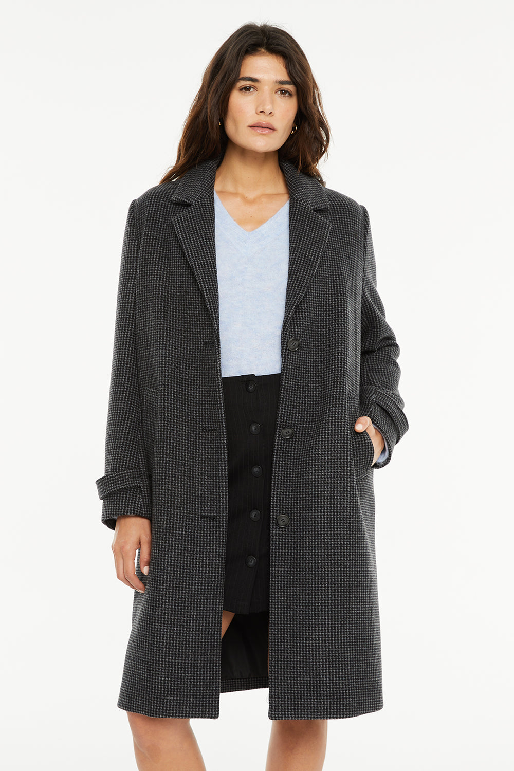 Abrigo de mujer con tejido de fantasía, cuello con solapa, cierre con botones y bolsillos en la parte delantera.