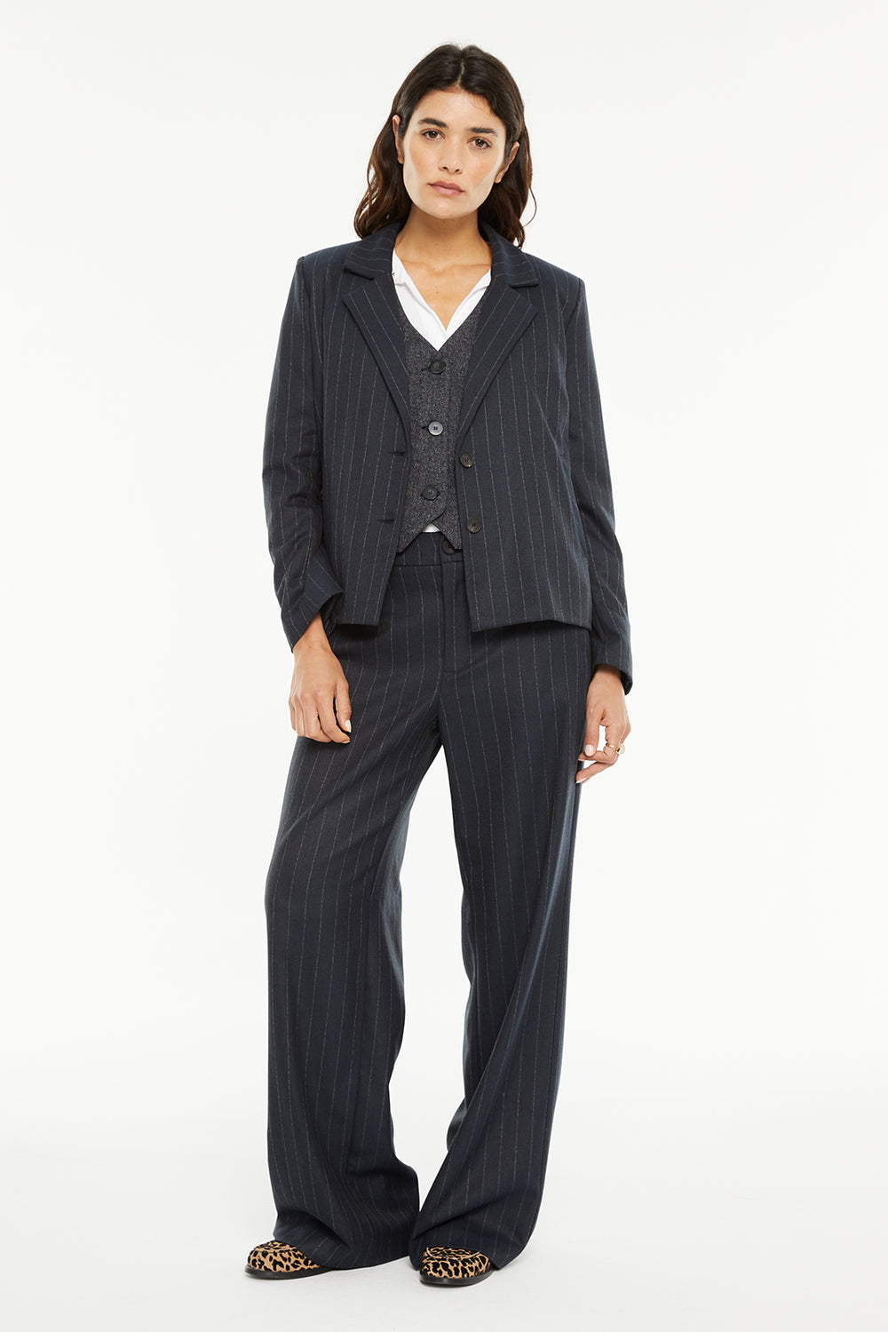 Americana de mujer con raya diplomática, escote con solapa y cierre con botones.