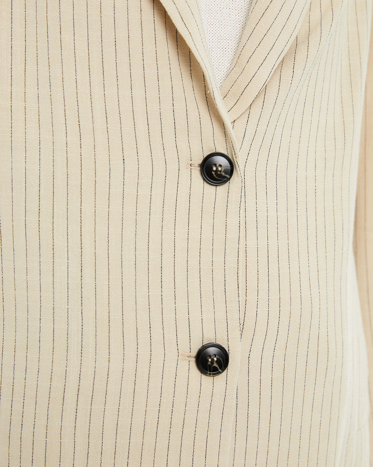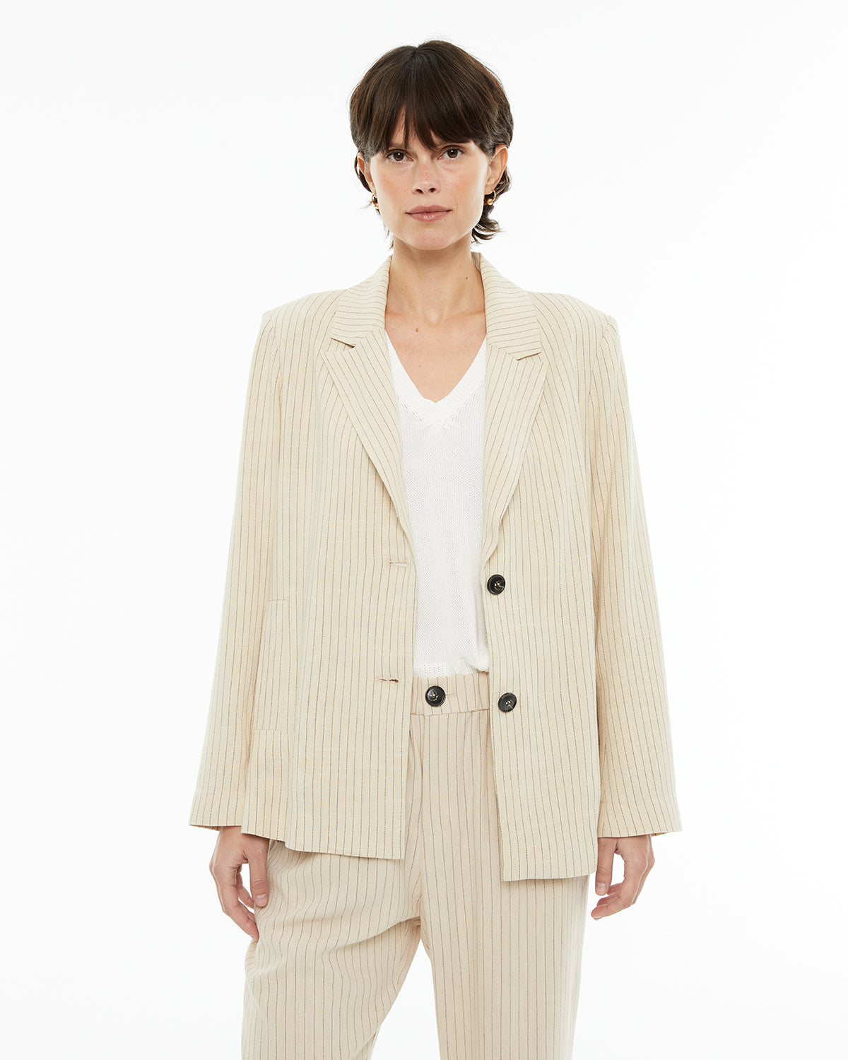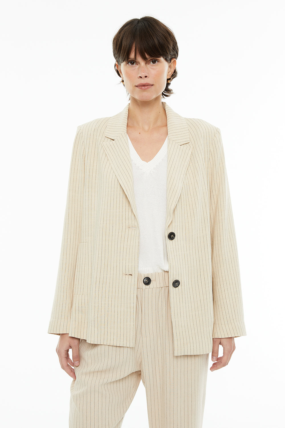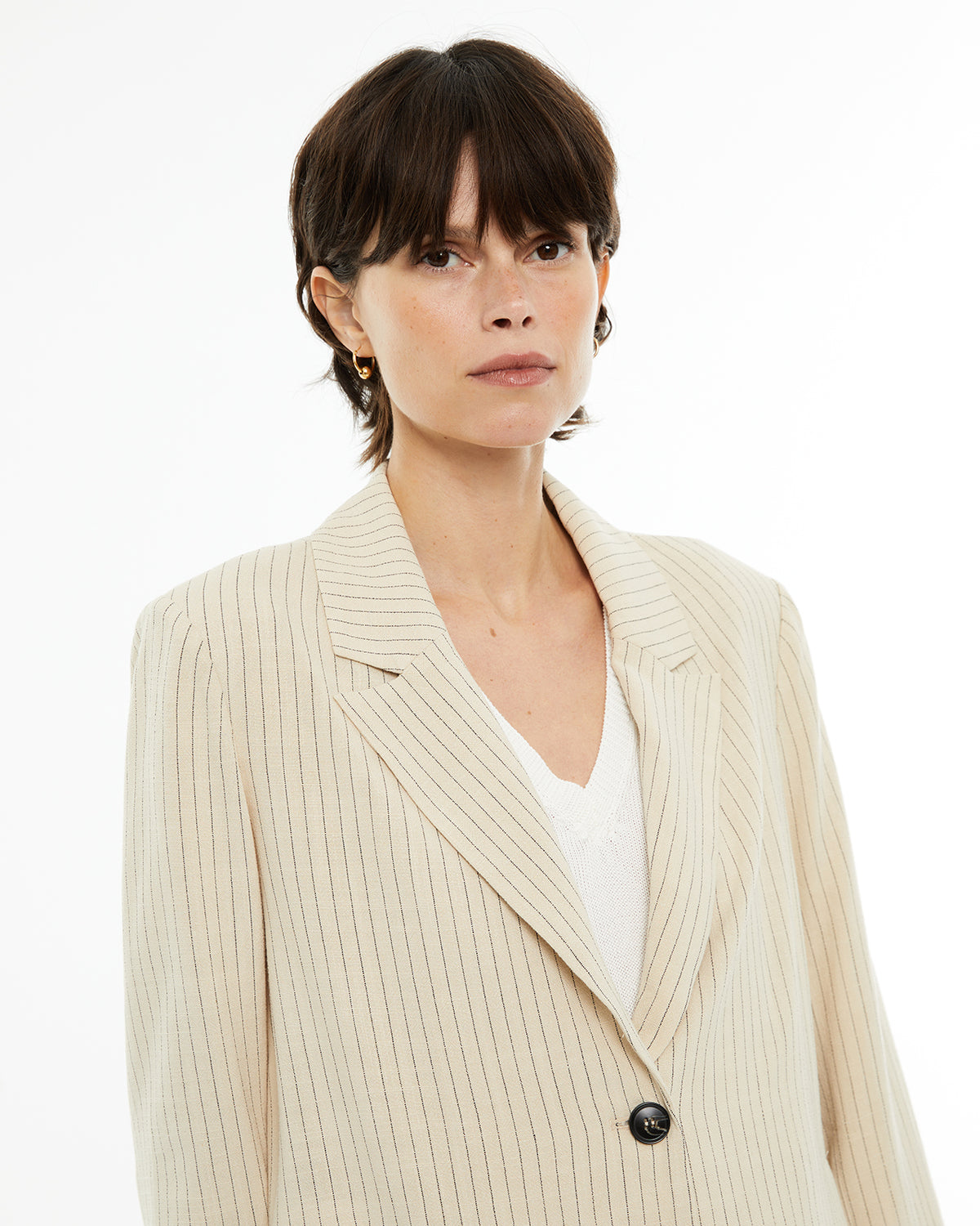 Americana recta de mujer, raya diplomática con cuello solapa y manga larga con hombreras, bolsillos delanteros de vivo, aberturas laterales y cierre frontal cruzado con botones.