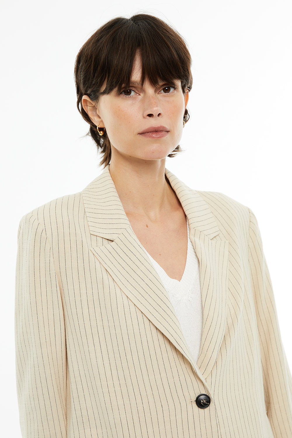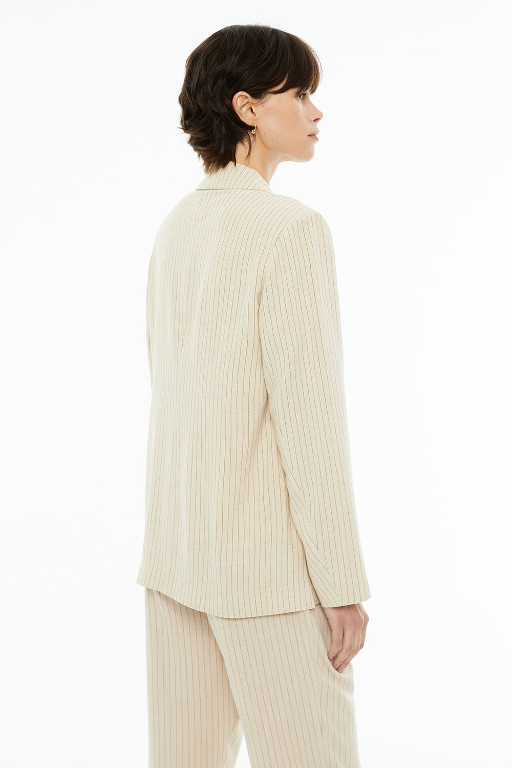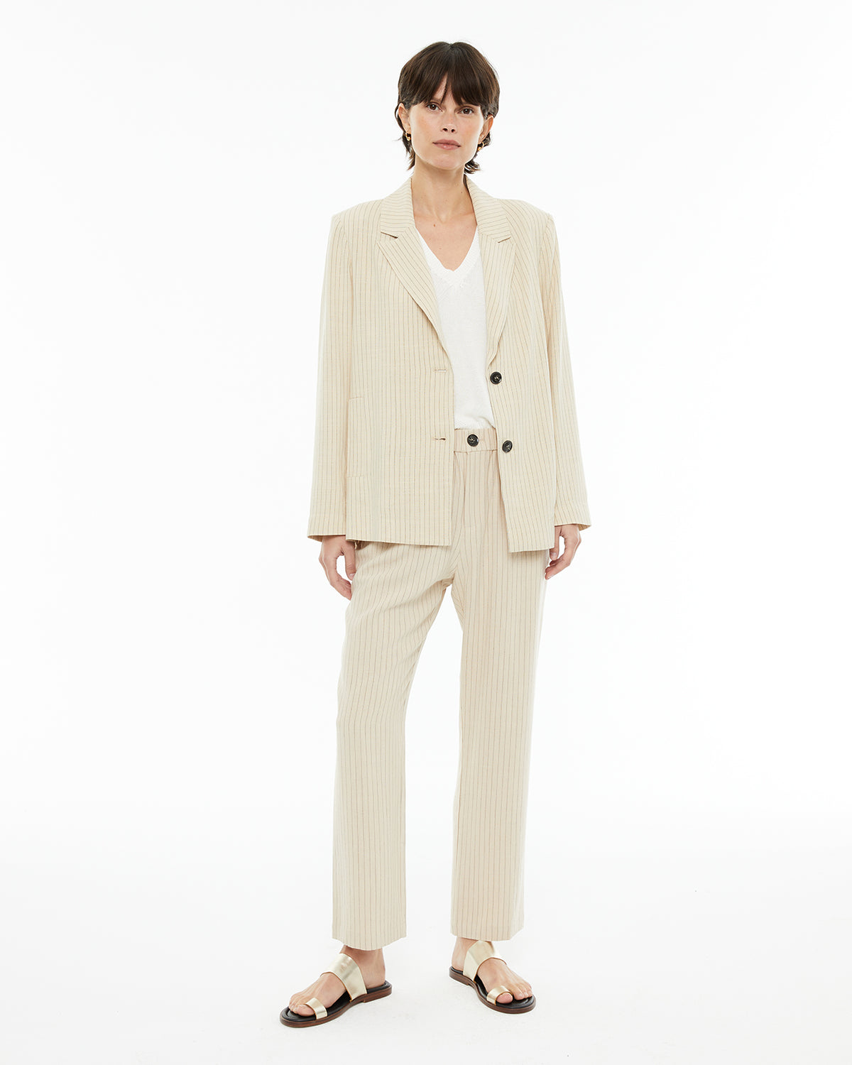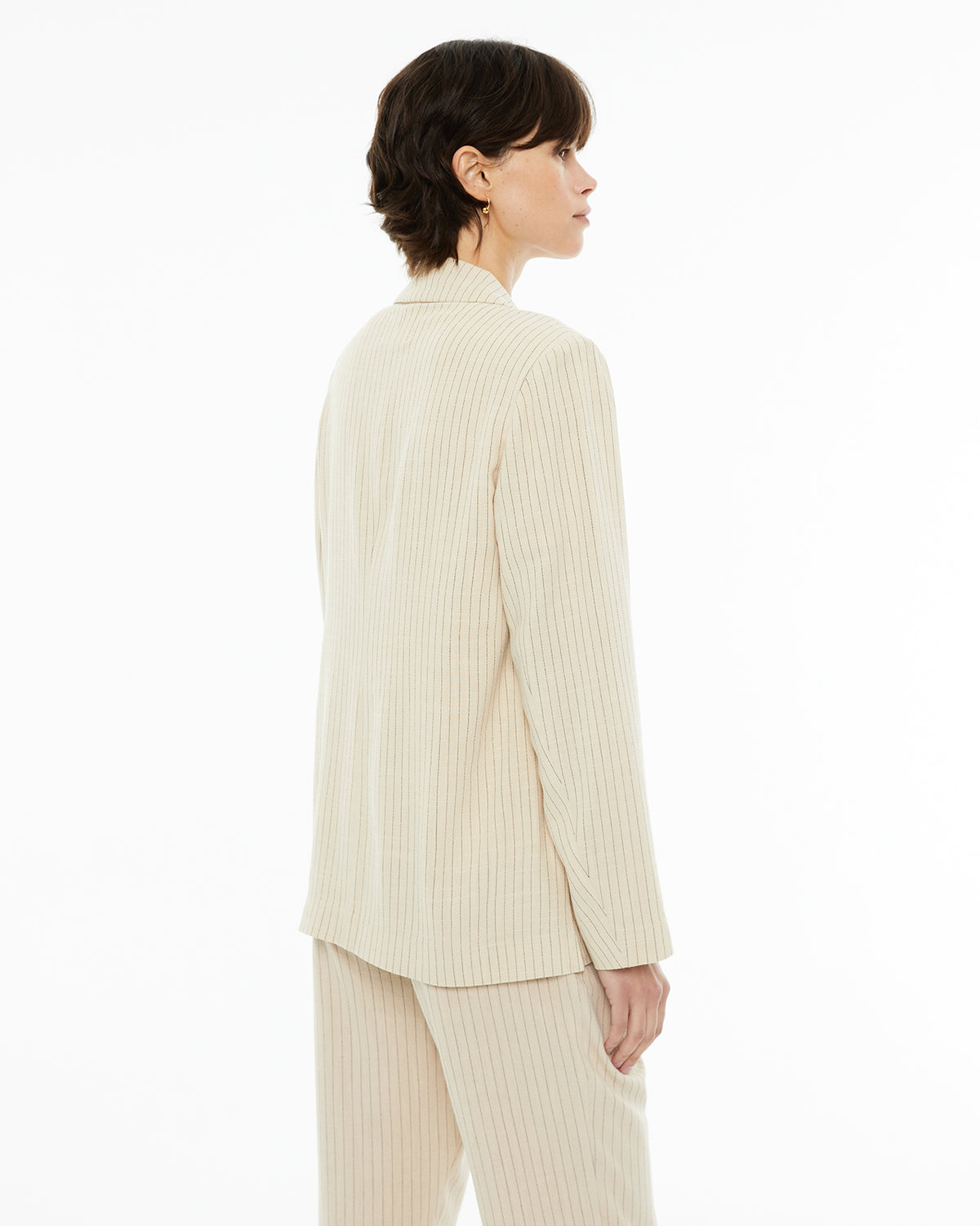 Americana recta de mujer, raya diplomática con cuello solapa y manga larga con hombreras, bolsillos delanteros de vivo, aberturas laterales y cierre frontal cruzado con botones.