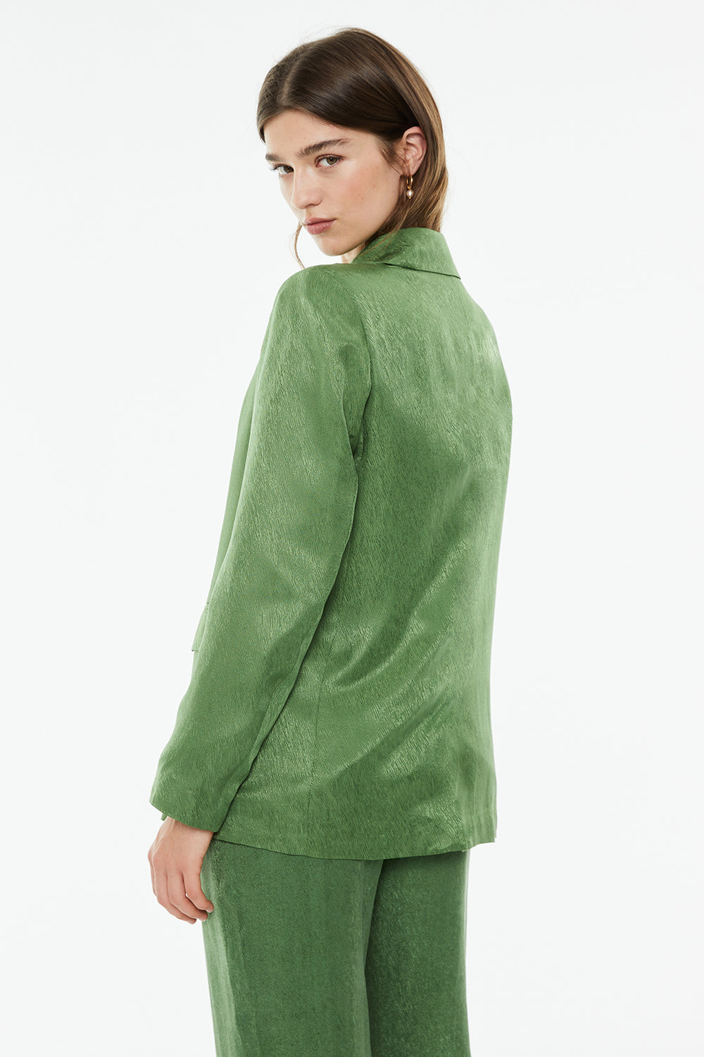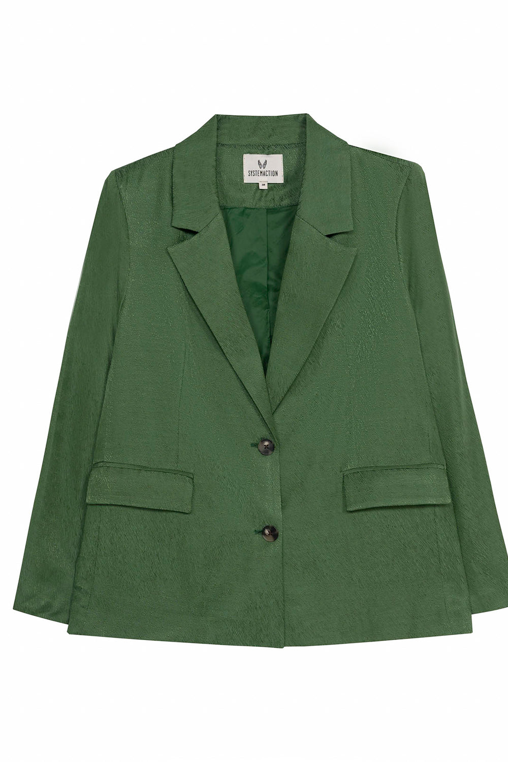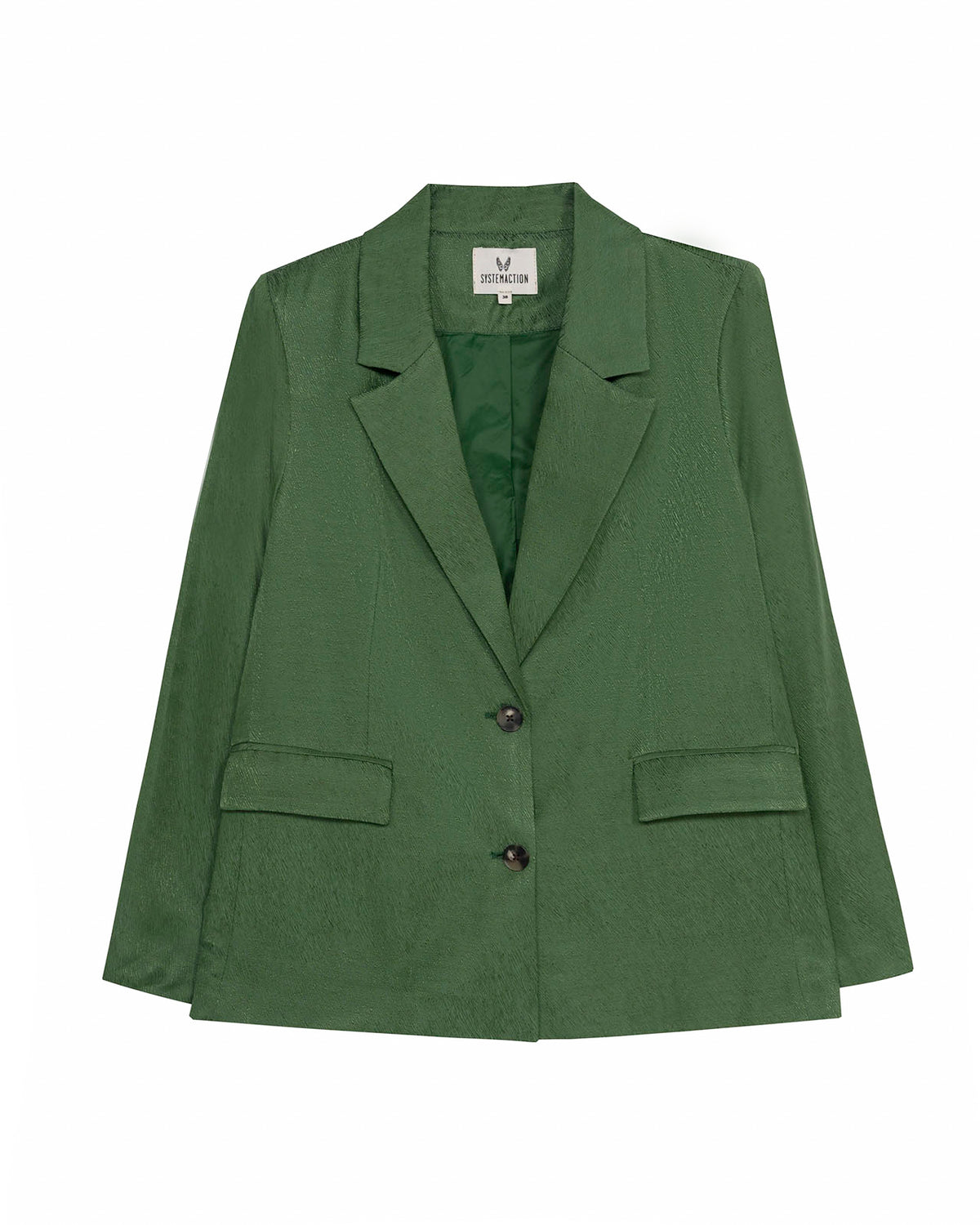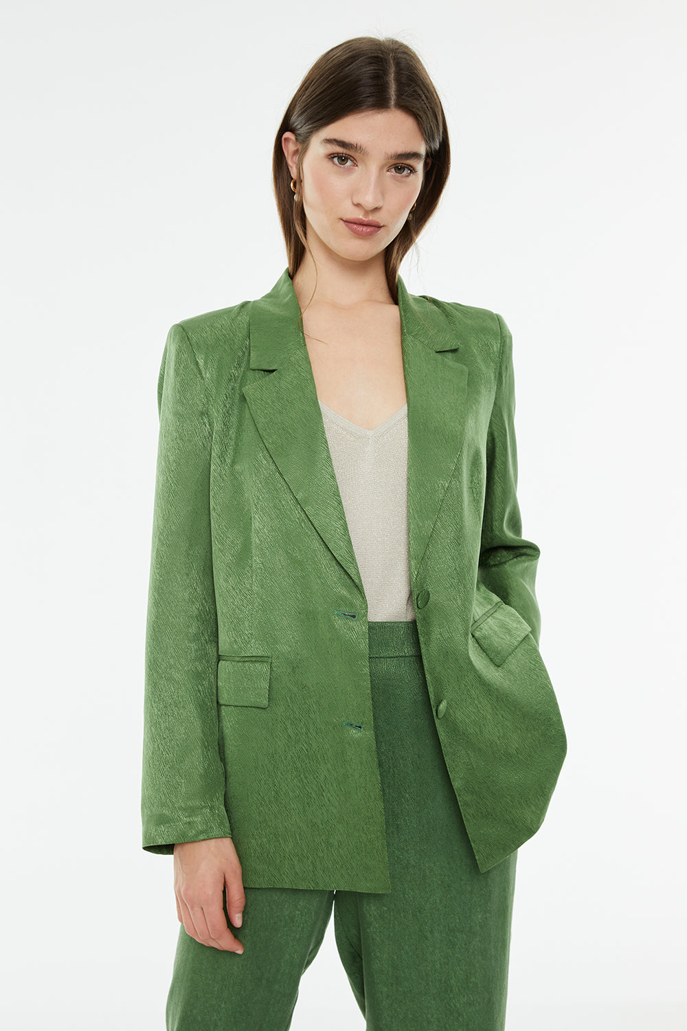 Americana recta de mujer con cuello solapa y manga larga con hombreras, bolsillos delanteros tipo vivo y cierre frontal con dos botones. Tejido de Jacquard.