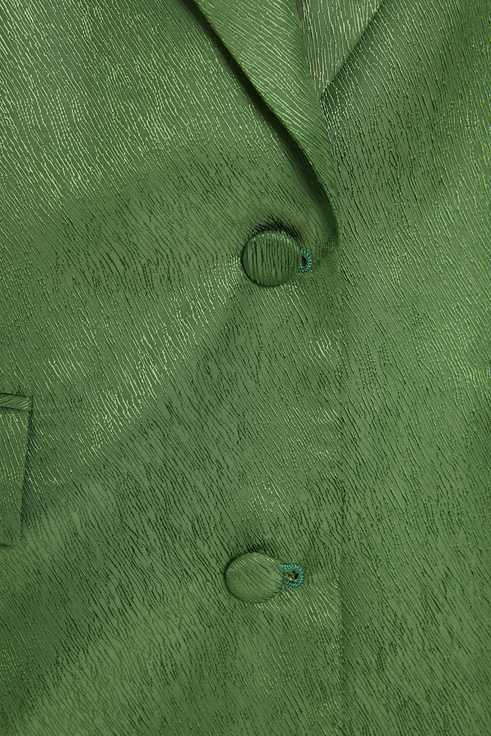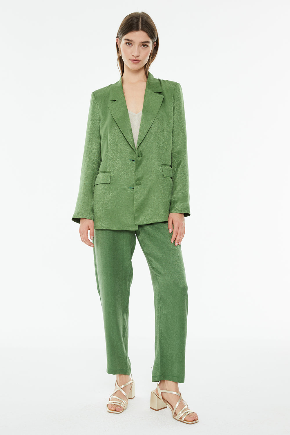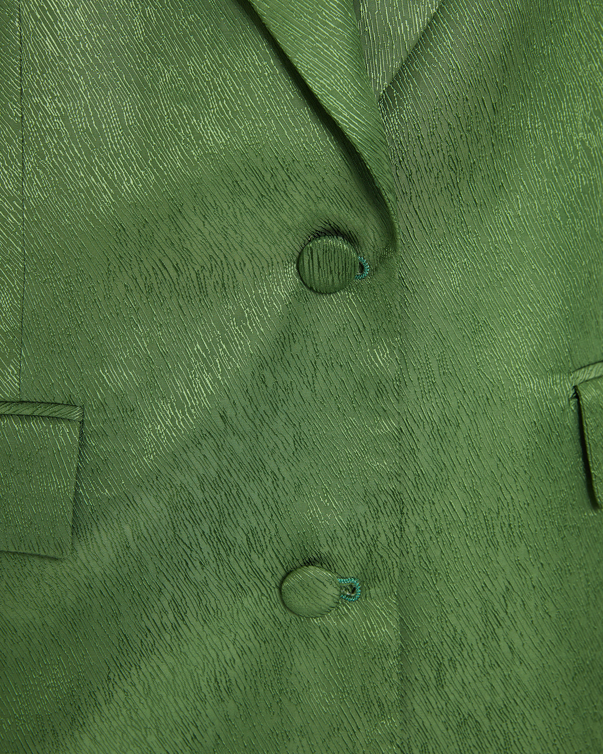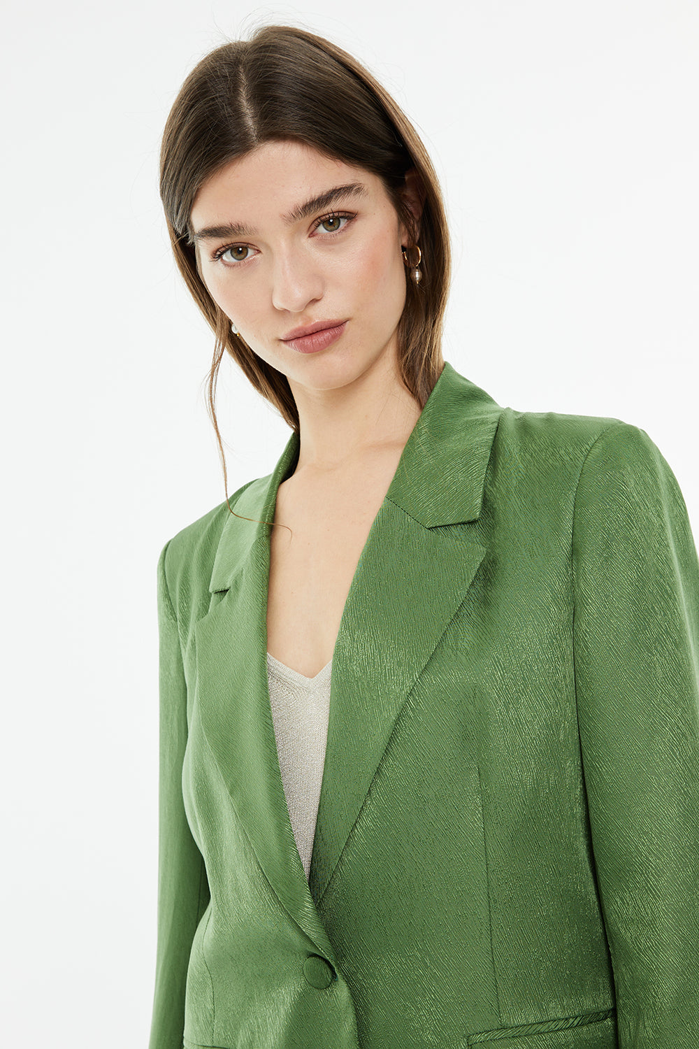 Americana recta de mujer con cuello solapa y manga larga con hombreras, bolsillos delanteros tipo vivo y cierre frontal con dos botones. Tejido de Jacquard.