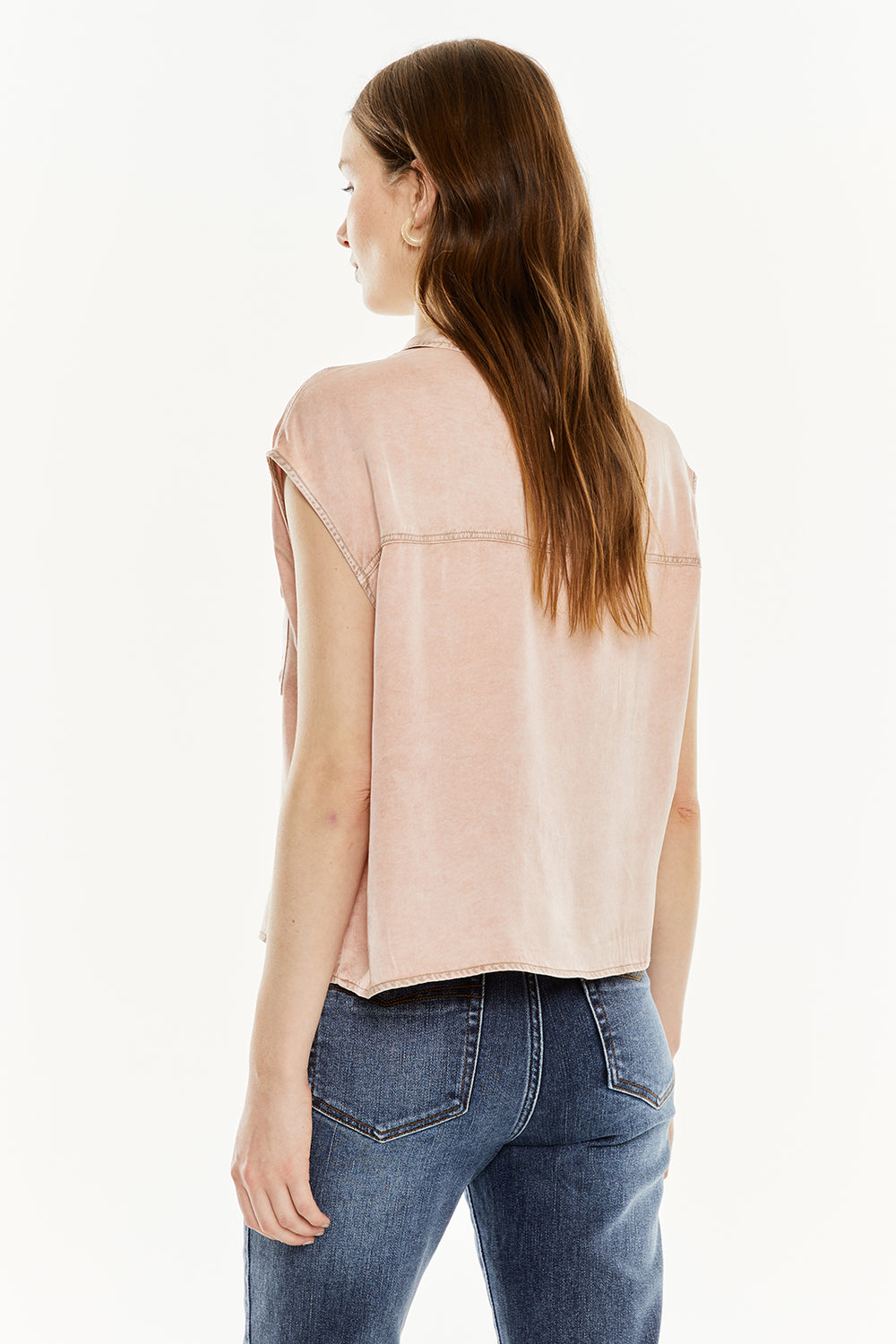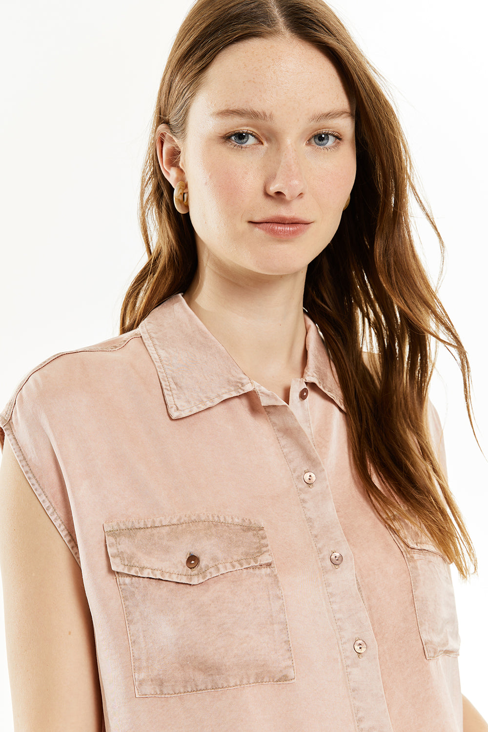 Camisa de mujer sin mangas, con cuello camisero, bolsillos plastrón en el delantero, cierre con botones y tintura en corrosivos. Prenda sostenible.