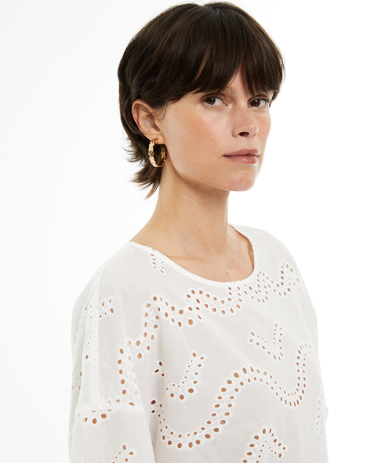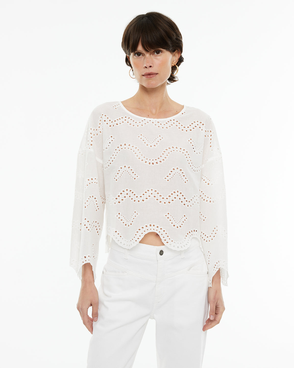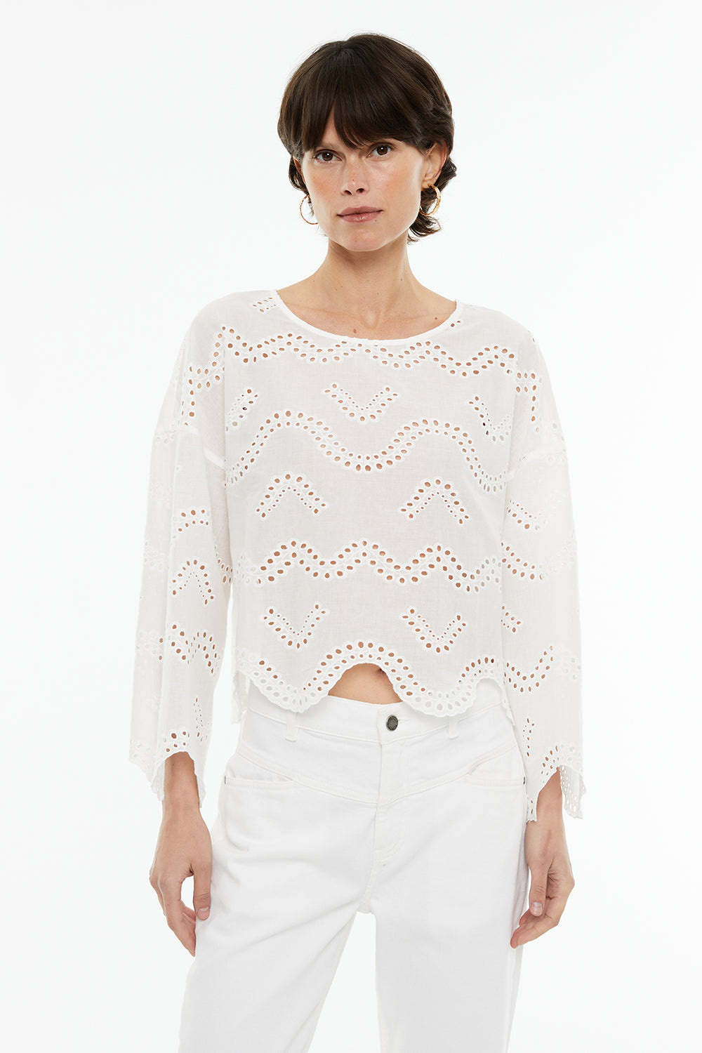 Camisa de mujer de bordado suizo, manga larga y cuello redondo.
