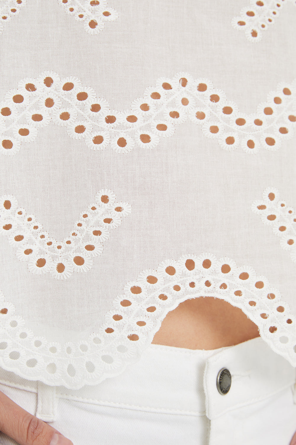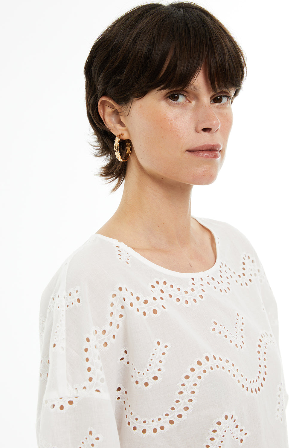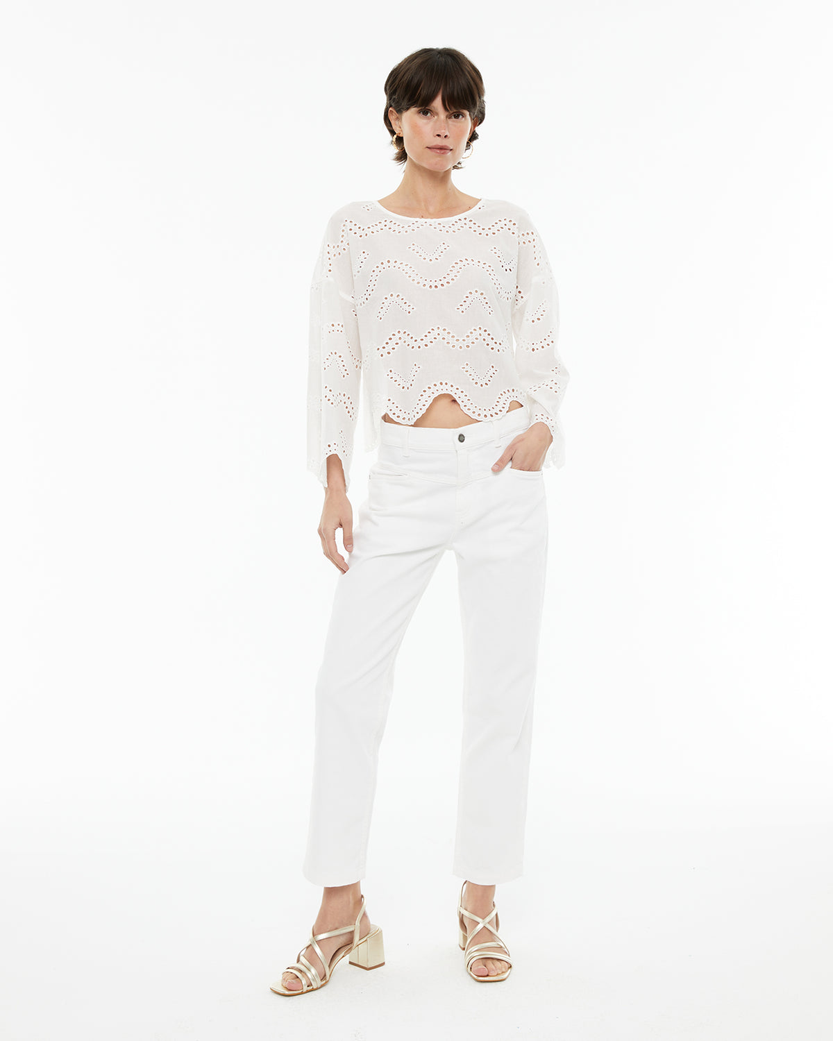 Camisa de mujer de bordado suizo, manga larga y cuello redondo.