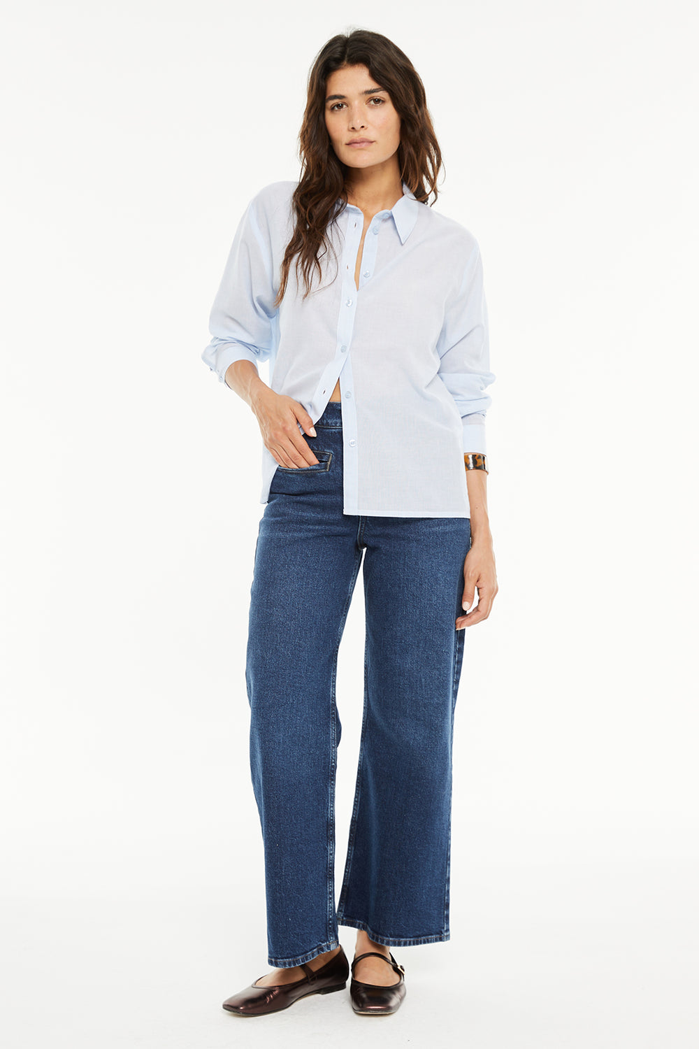 Camisa de hilo para mujer, con escote camisero, manga larga y cierre de botones en el delantero. Prenda sostenible.