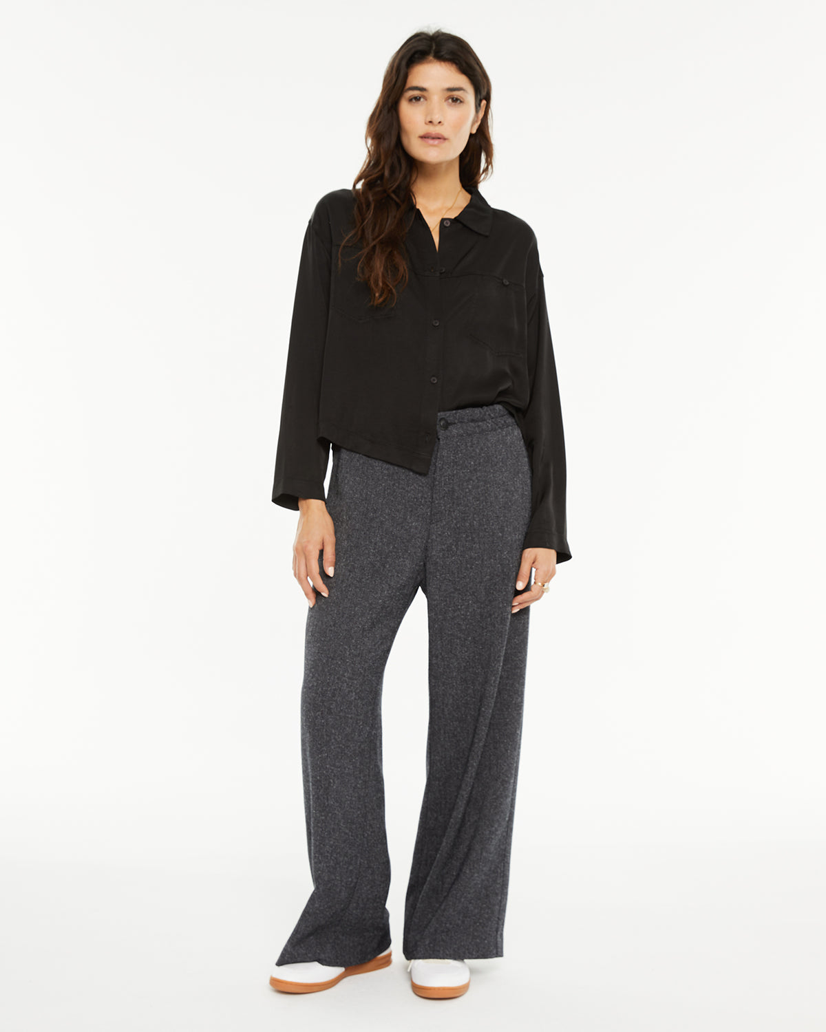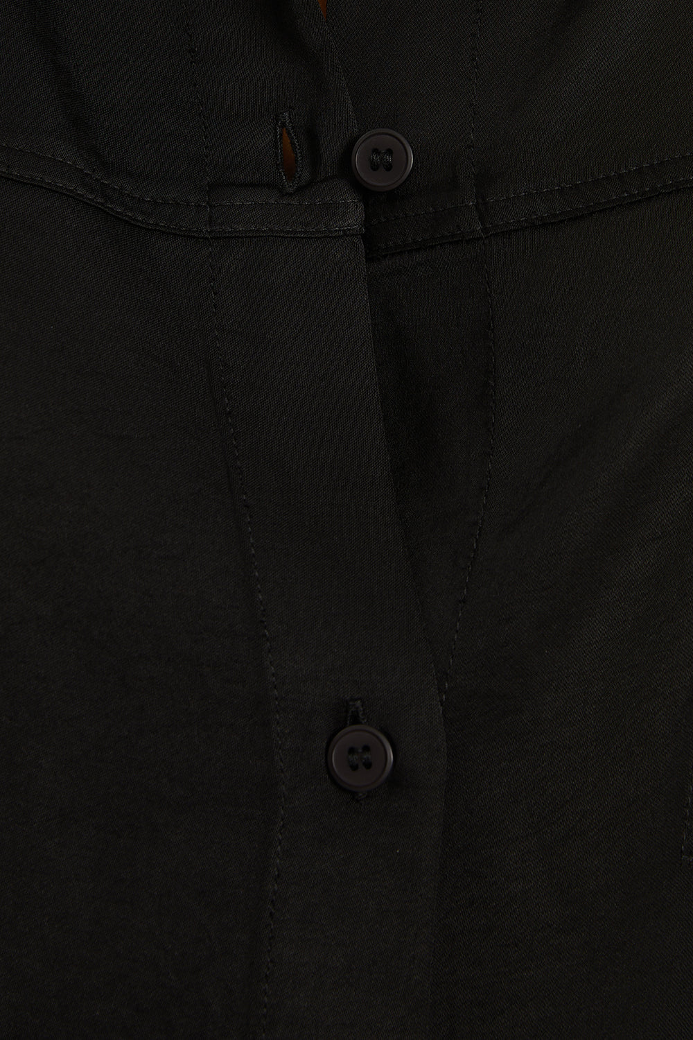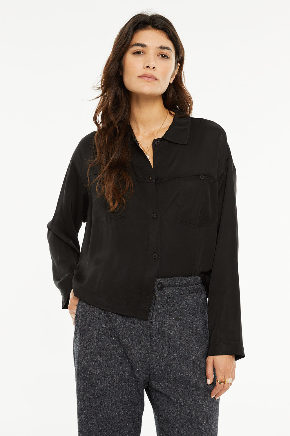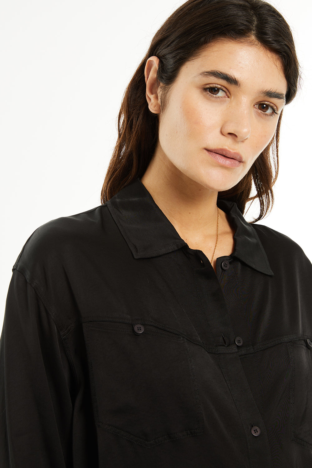 Camisa fluida de mujer, con escote camisero, detalles de bolsillos en la parte delantera y cierre con botones. Prenda sostenible.