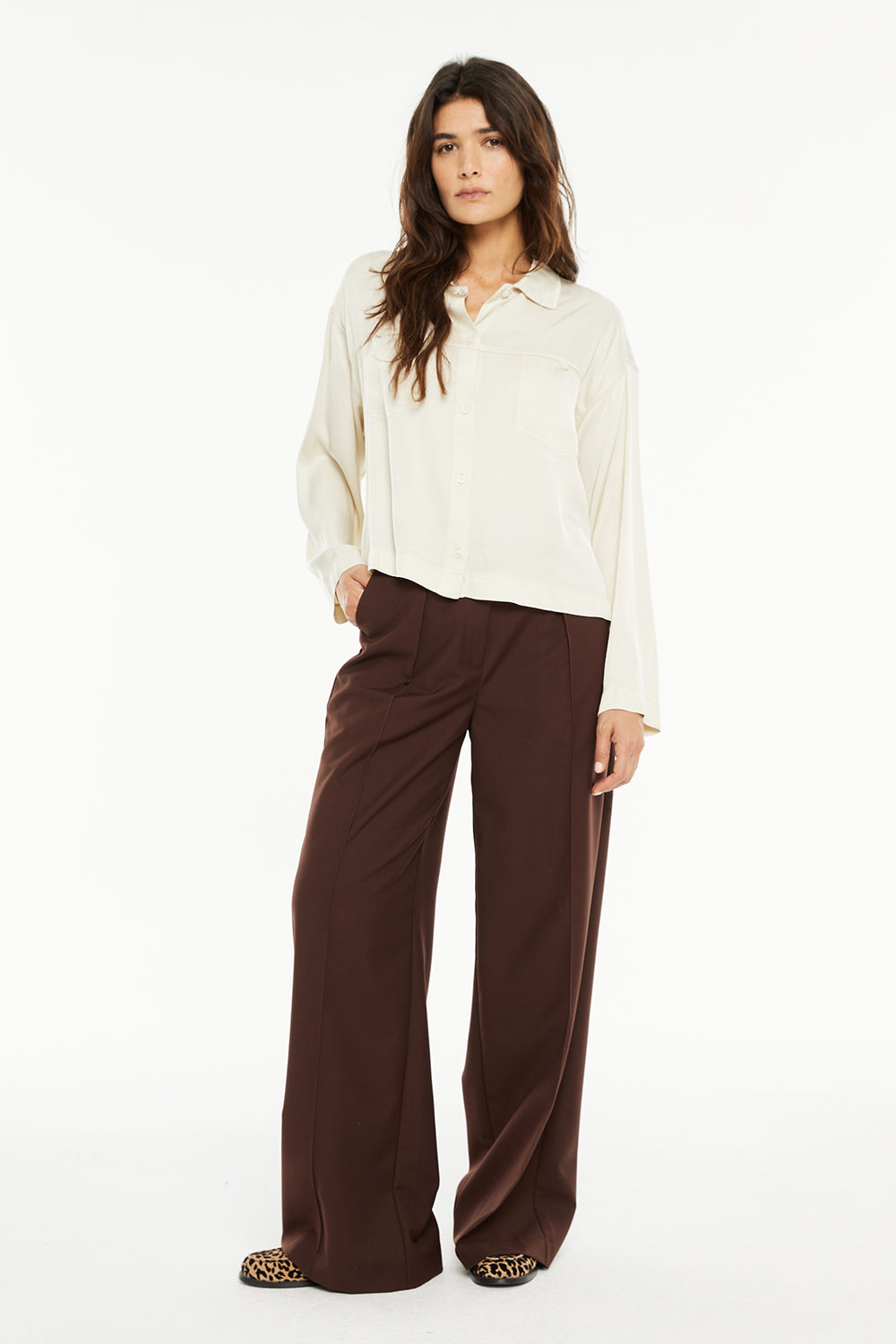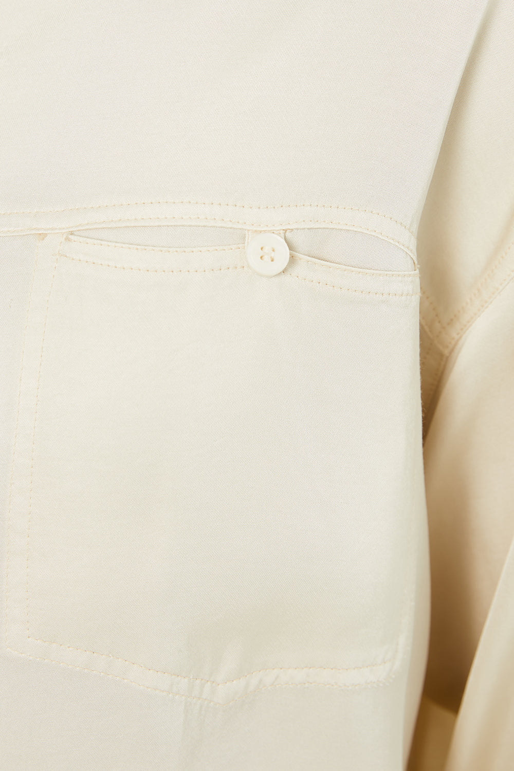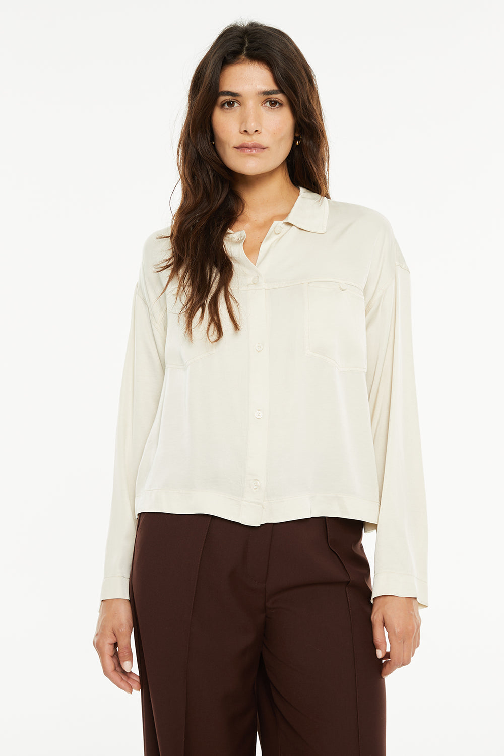 Camisa fluida de mujer, con escote camisero, detalles de bolsillos en la parte delantera y cierre con botones. Prenda sostenible.