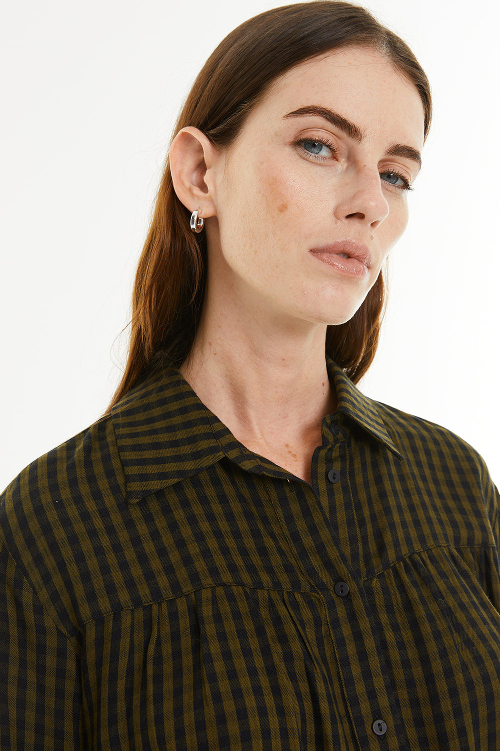 Camisa de mujer con tejido de cuadros, escote camisero y cierre con botones. Prenda sostenible.