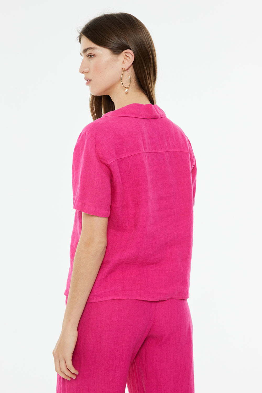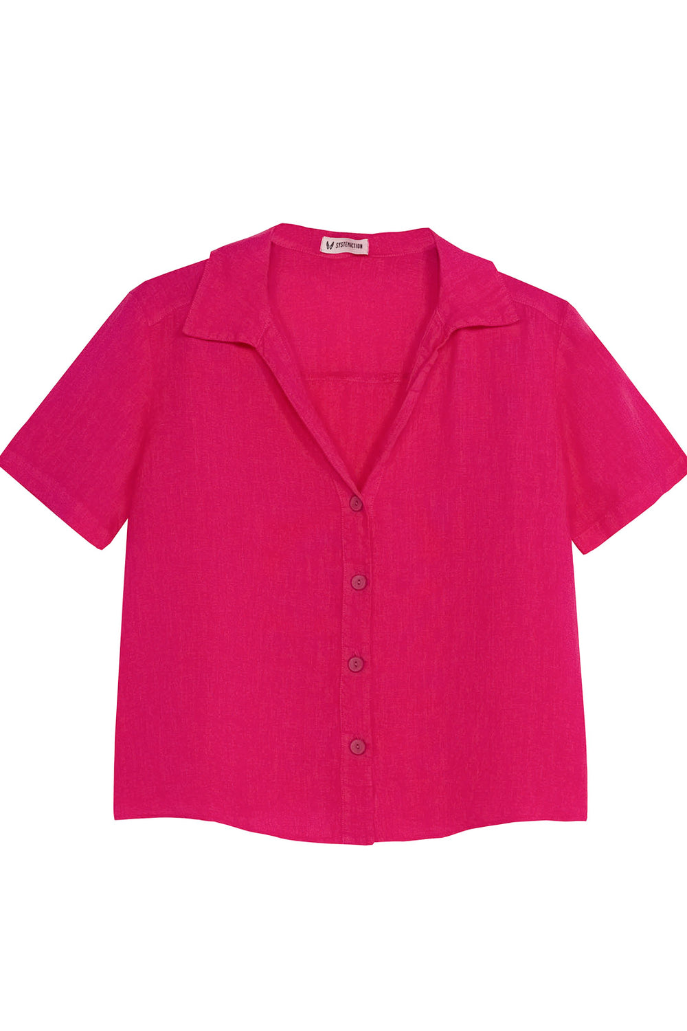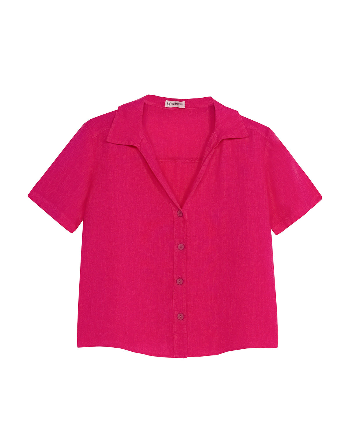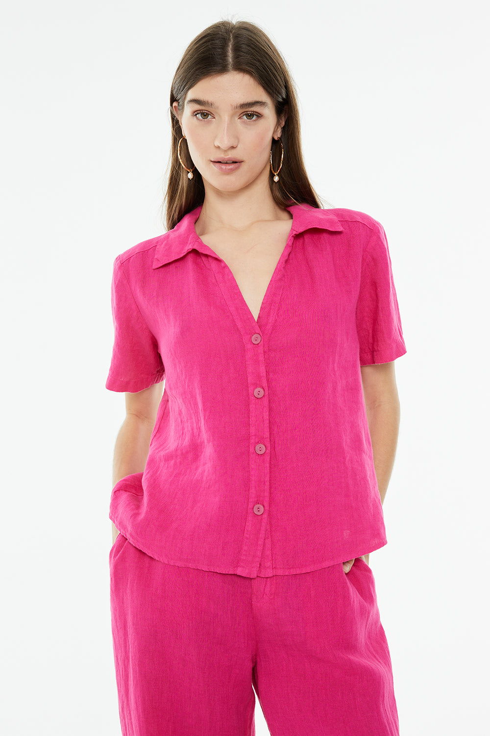 Camisa de mujer de manga corta con escote camisero y cierre frontal con botones. Fit regular. Prenda sostenible.
