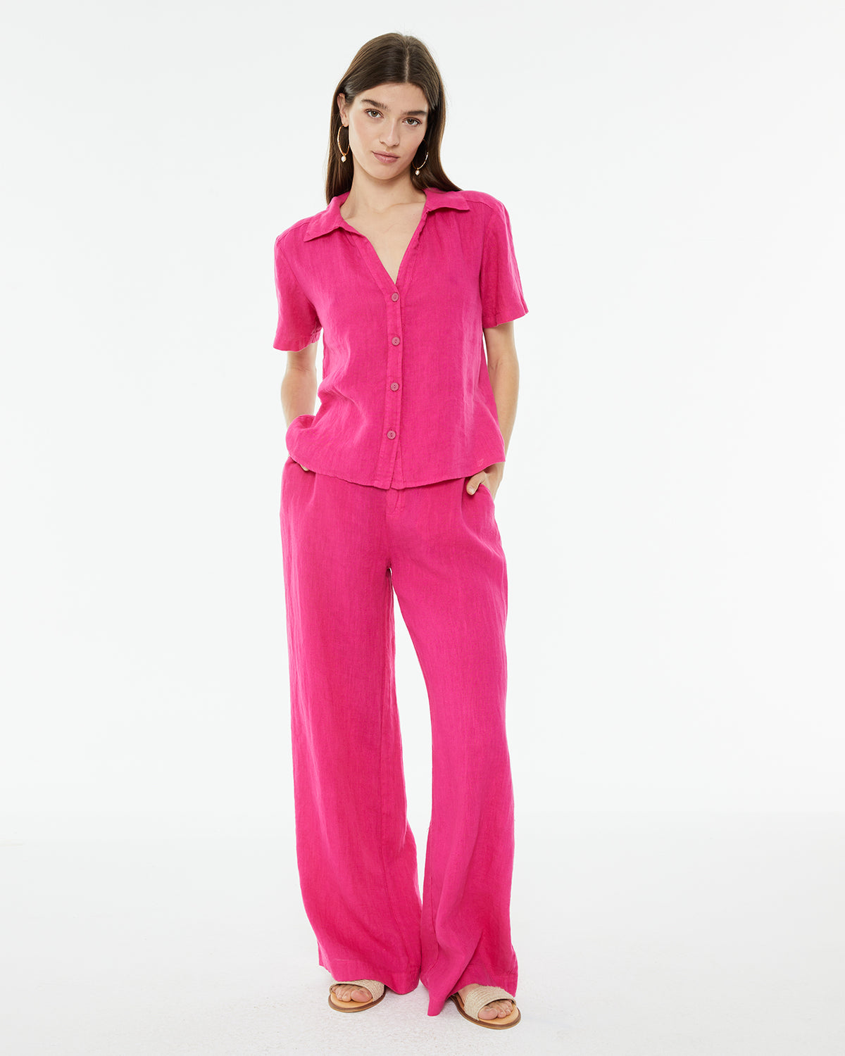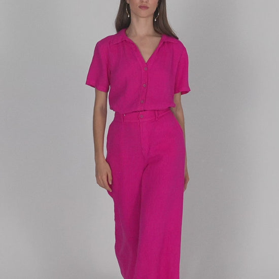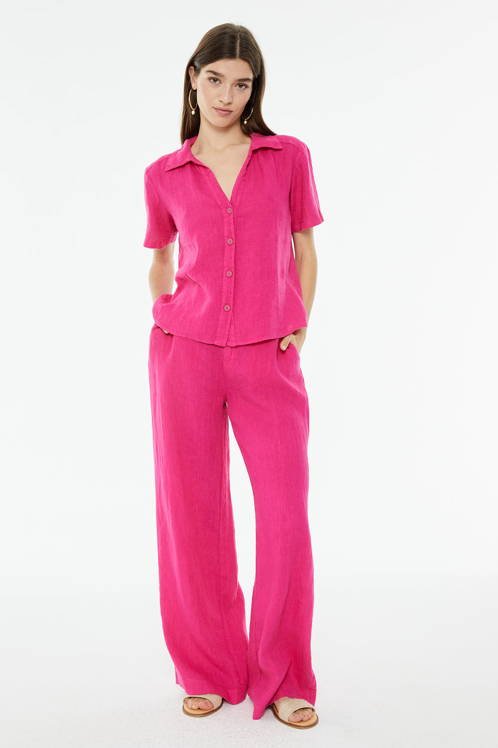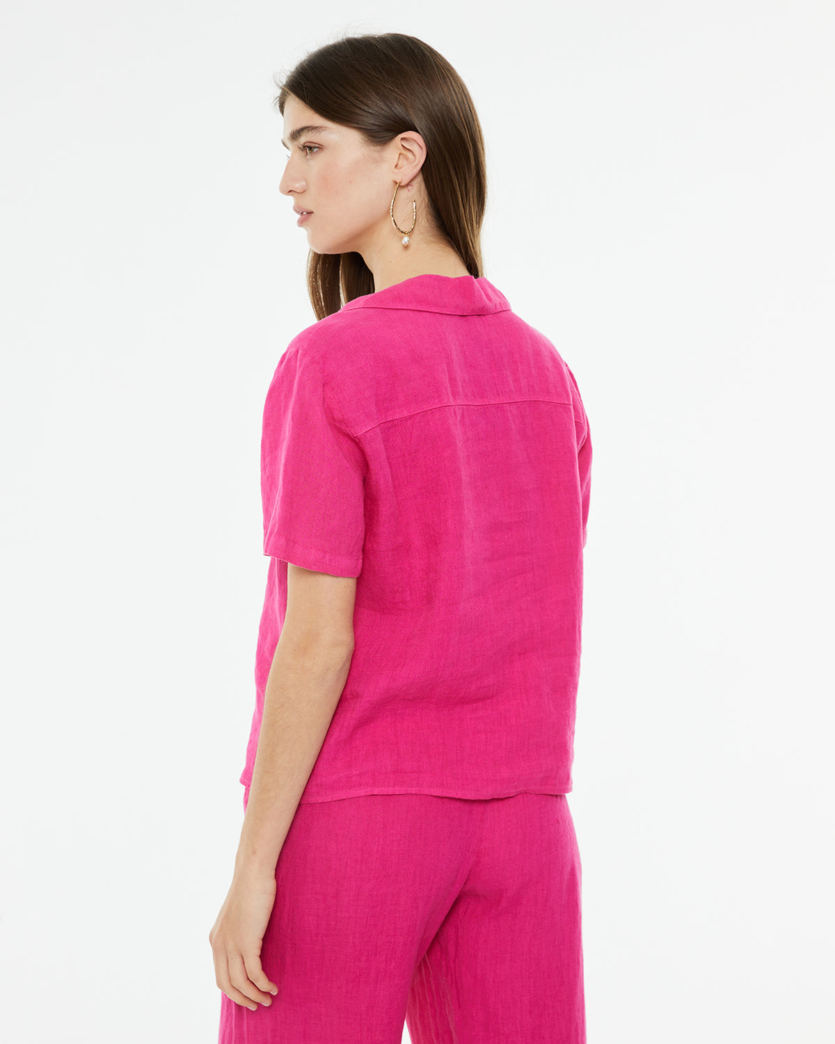 Camisa de mujer de manga corta con escote camisero y cierre frontal con botones. Fit regular. Prenda sostenible.