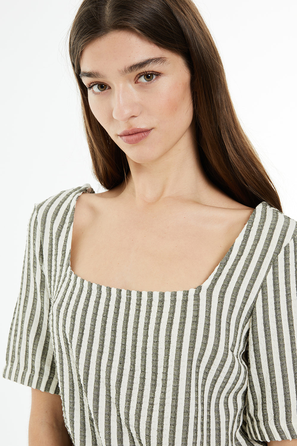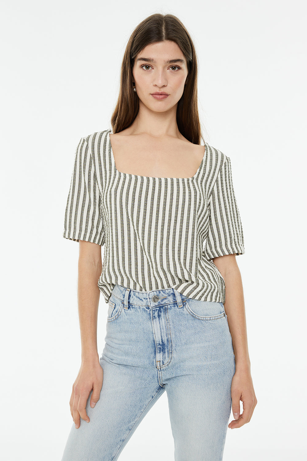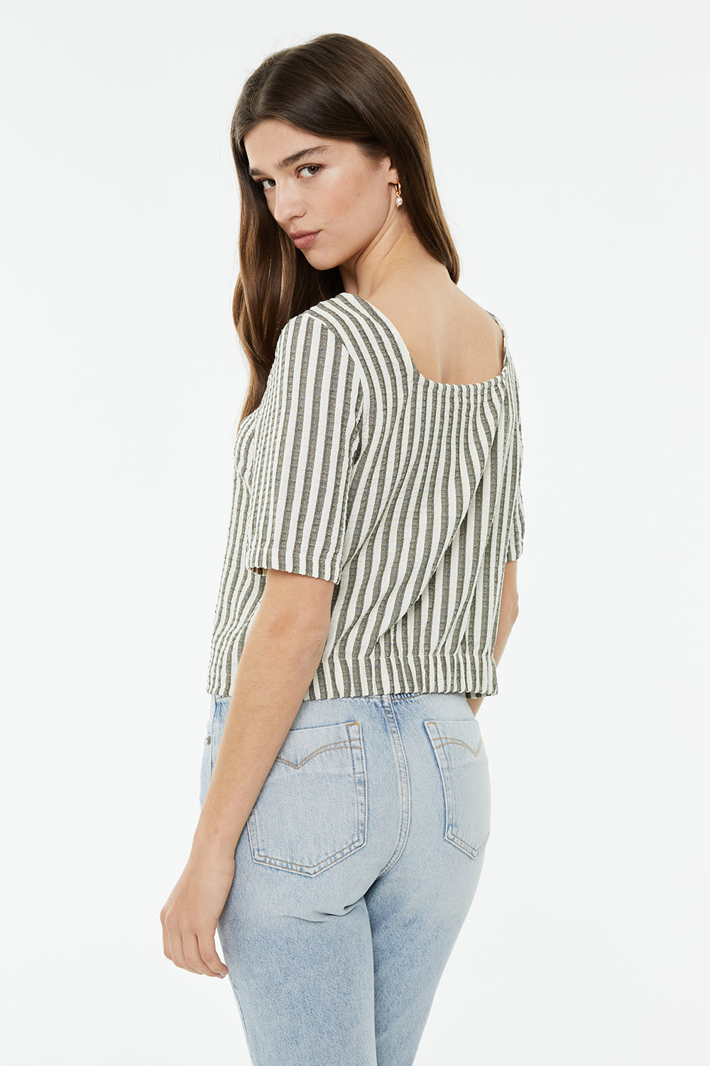 Camisa de rayas manga tres cuartos abullonada y escote cuadrado