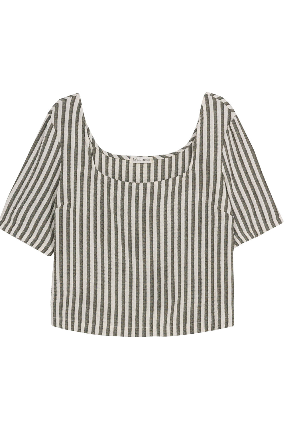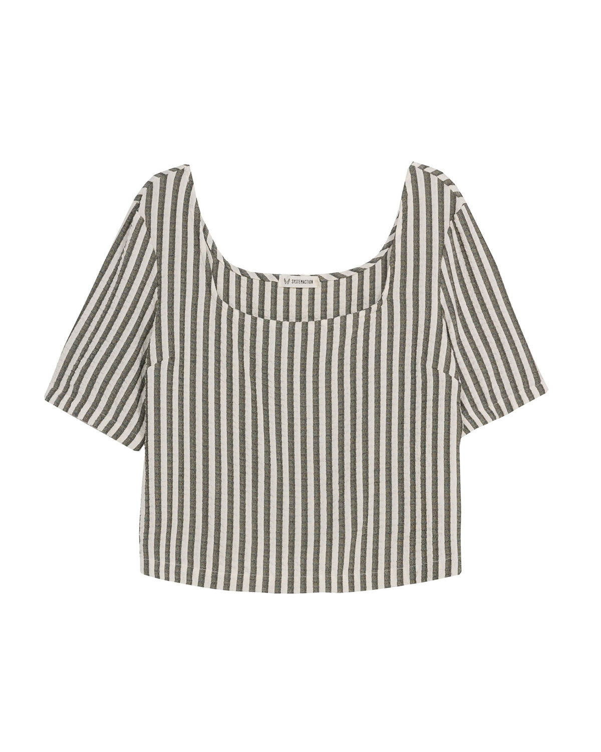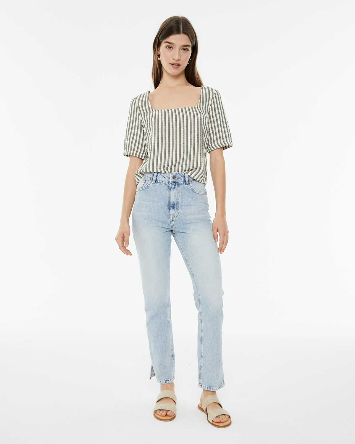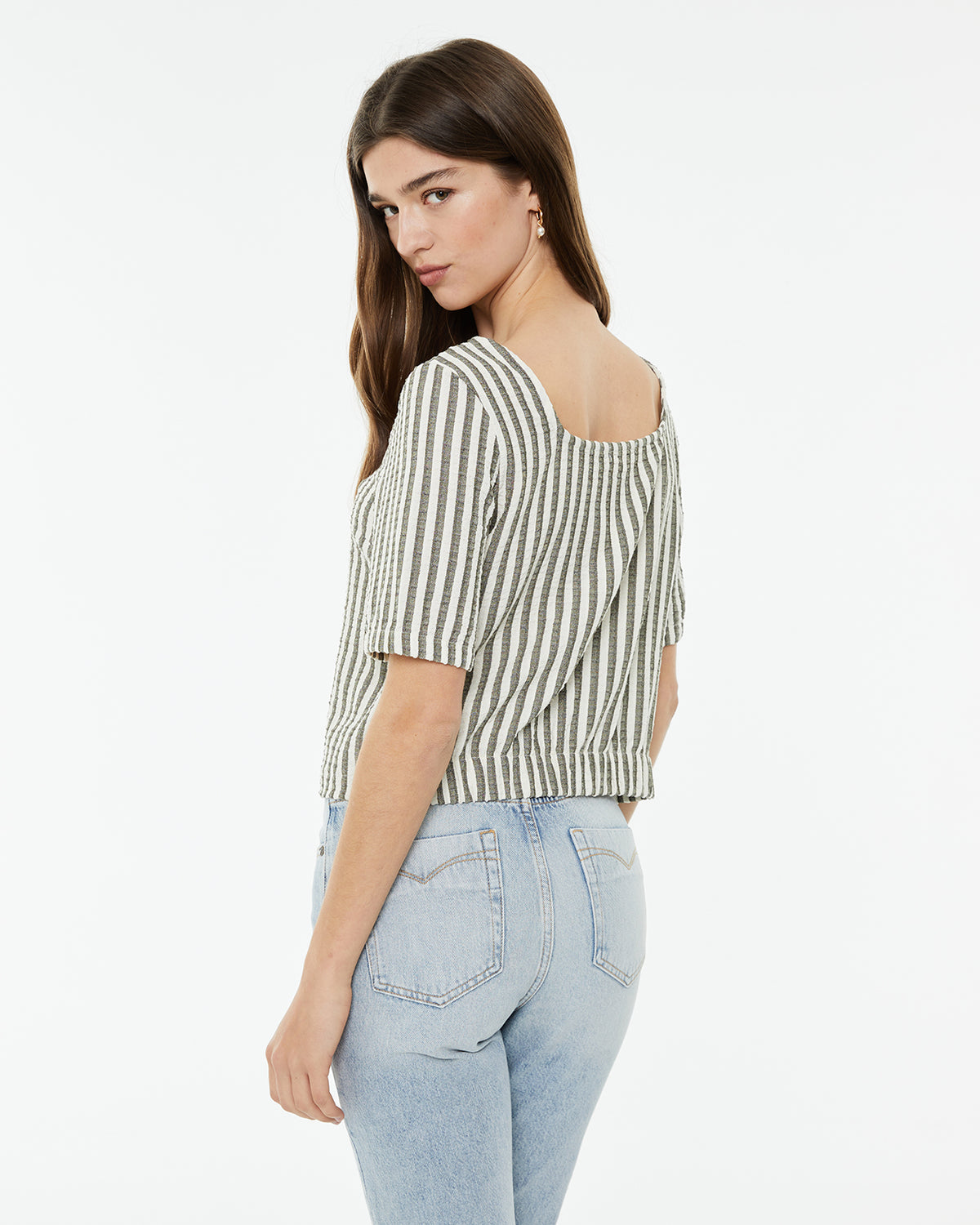 Camisa de mujer de rayas, manga tres cuartos abullonada y cuello cuadrado.