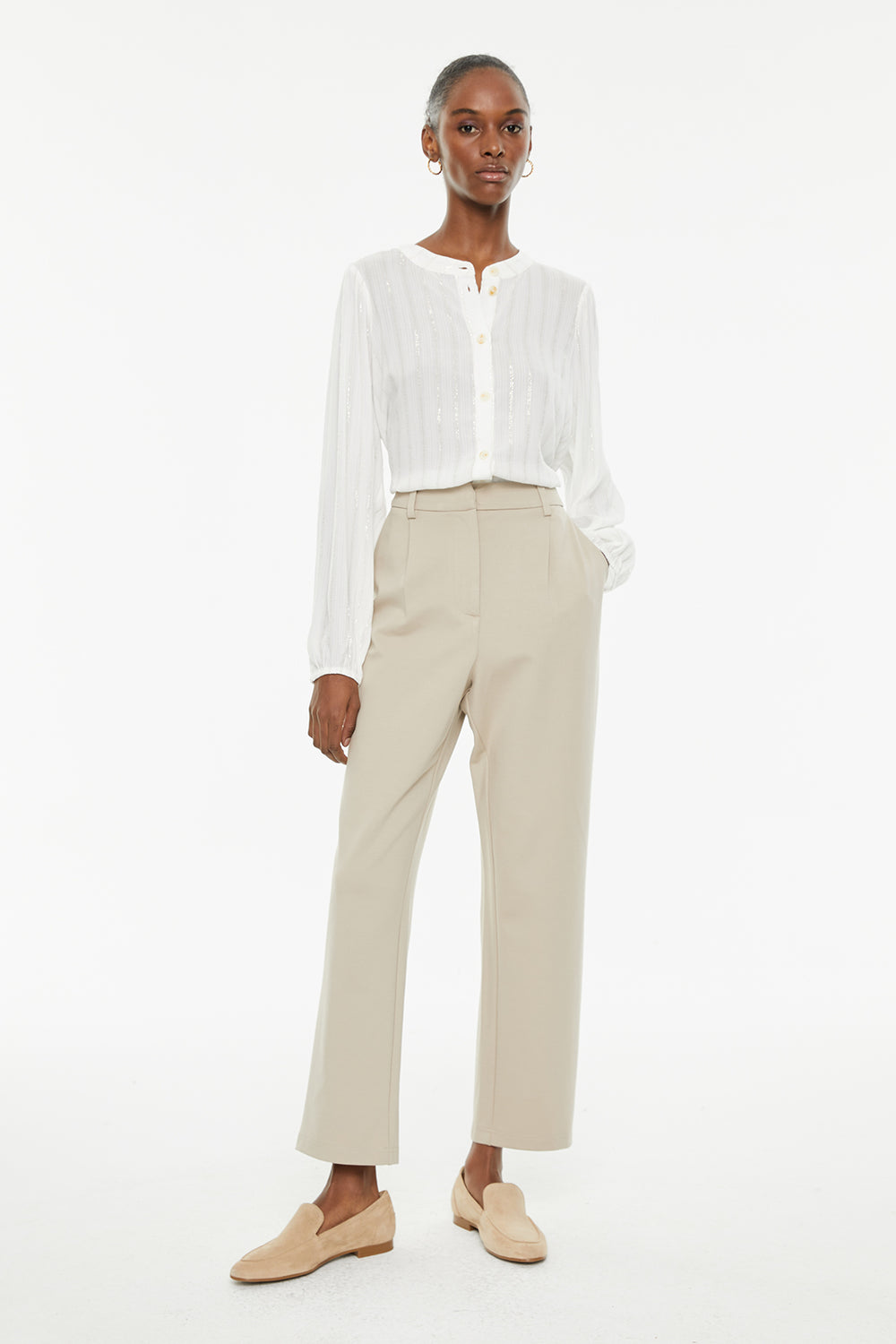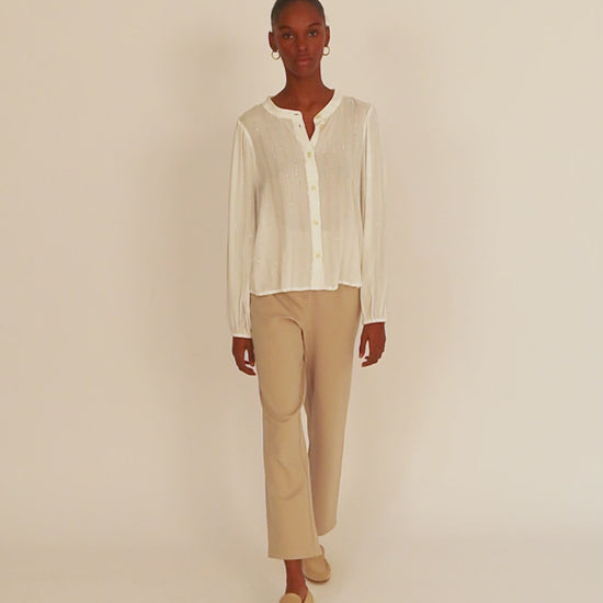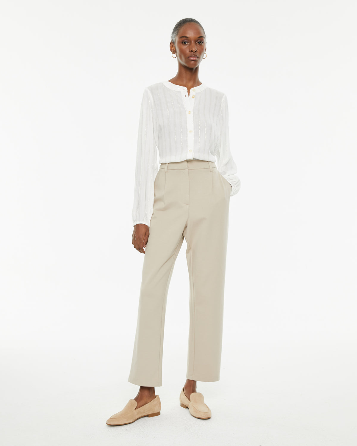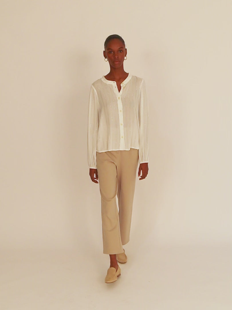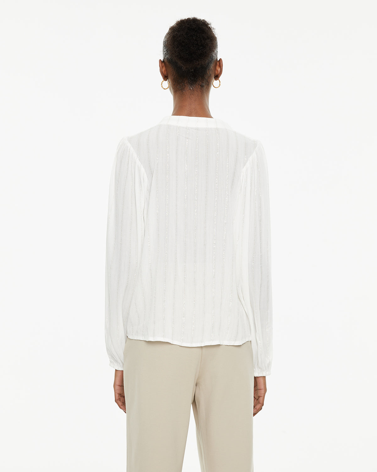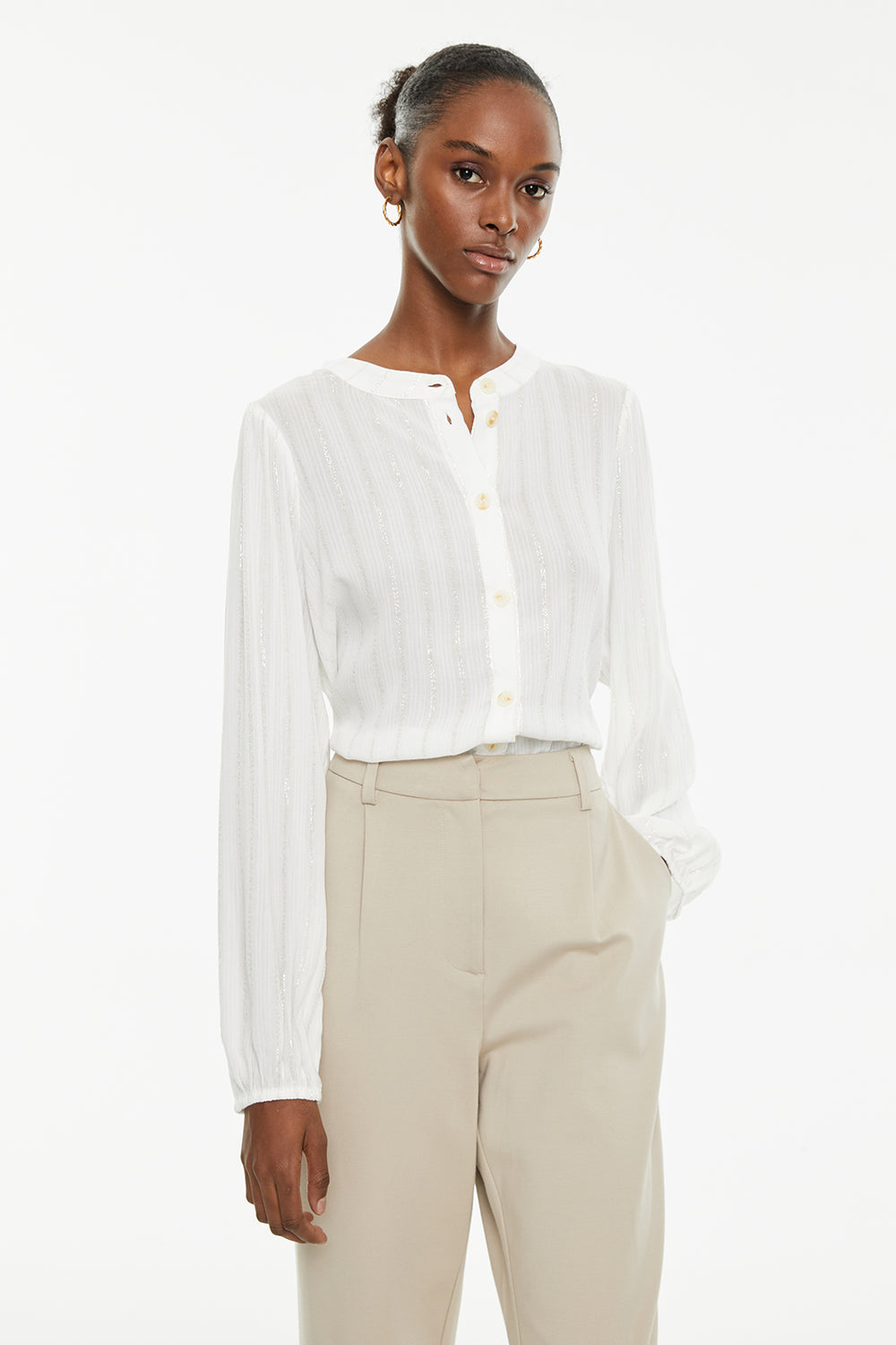 Camisa de mujer con cuello mao de manga larga y detalle de lúrex .
