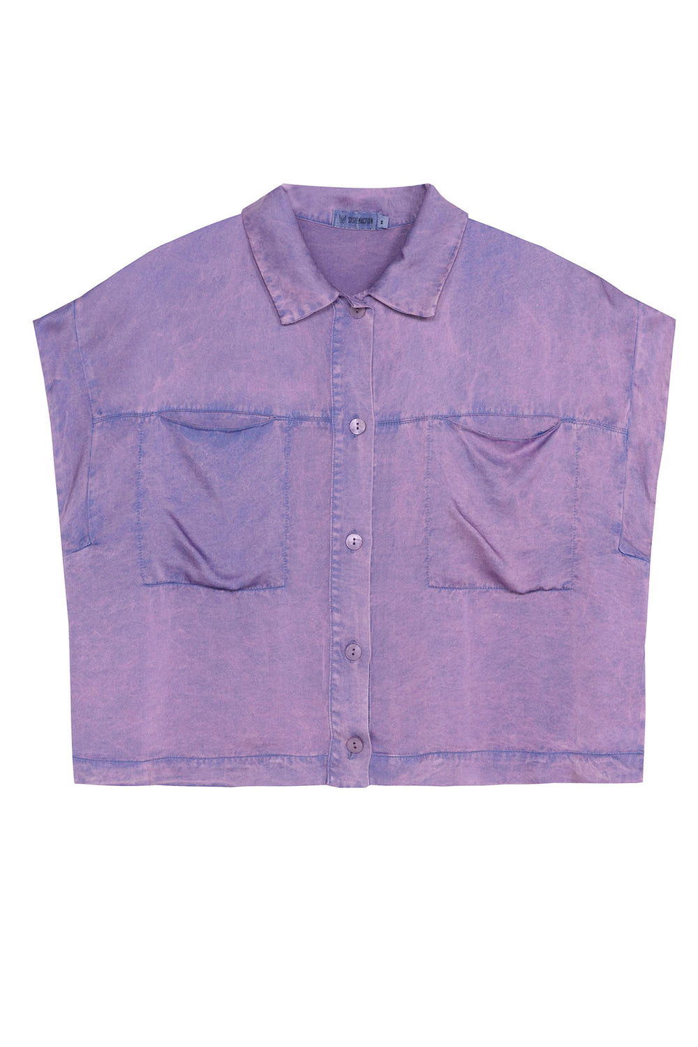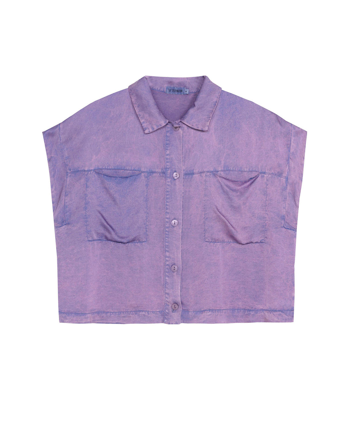 Camisa de mujer fluida sin mangas, con cuello mao, cierre frontal con botones y detalle de bolsillos plastrón en el delantero. Prenda sostenible.