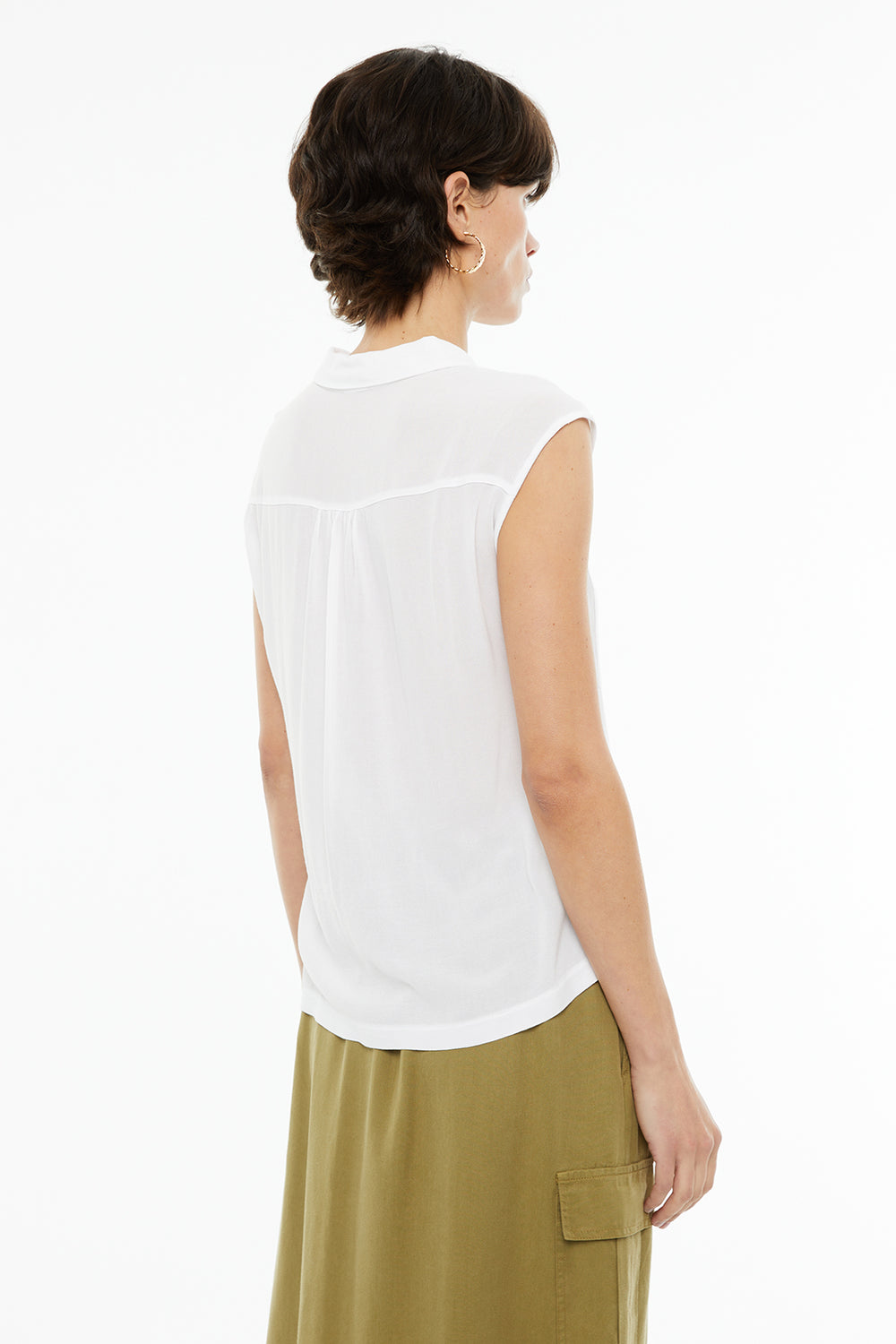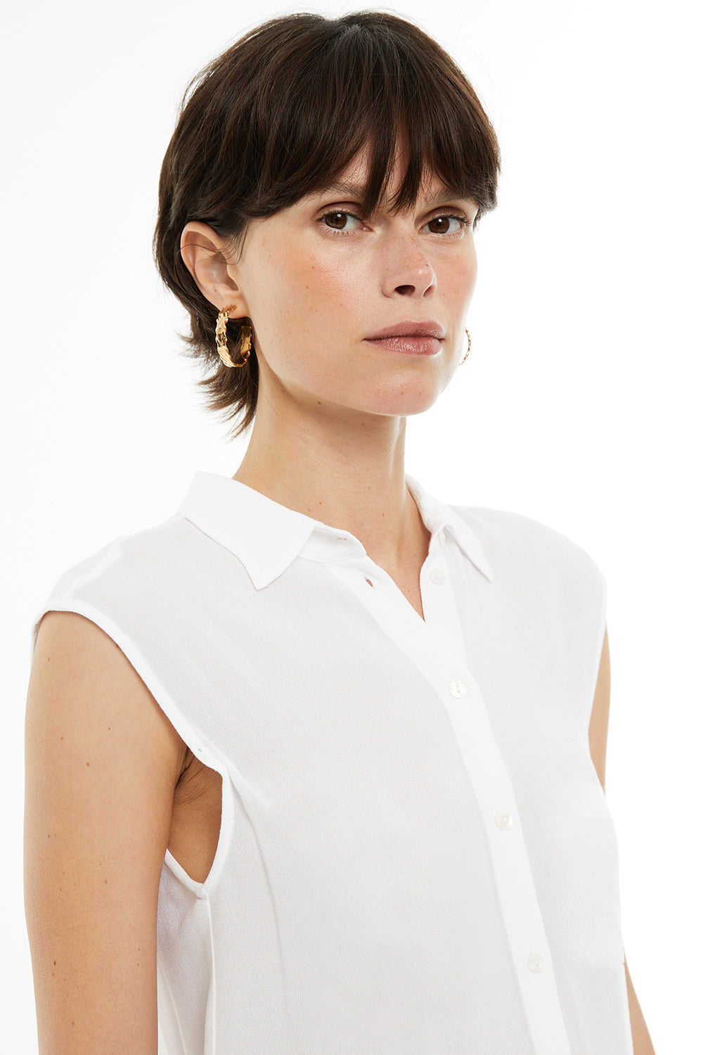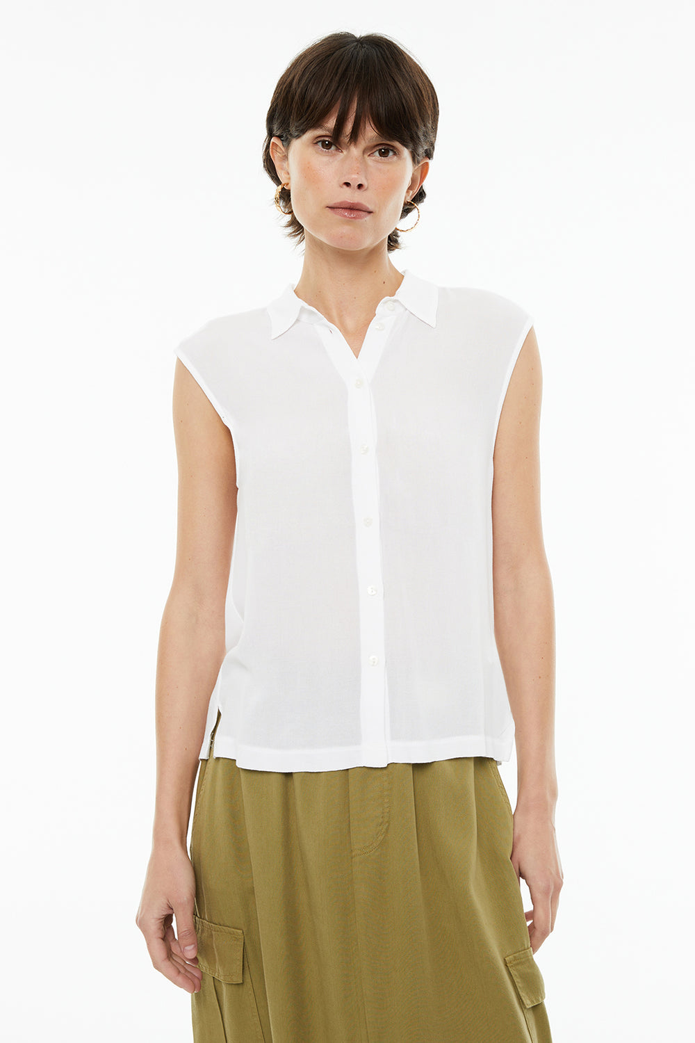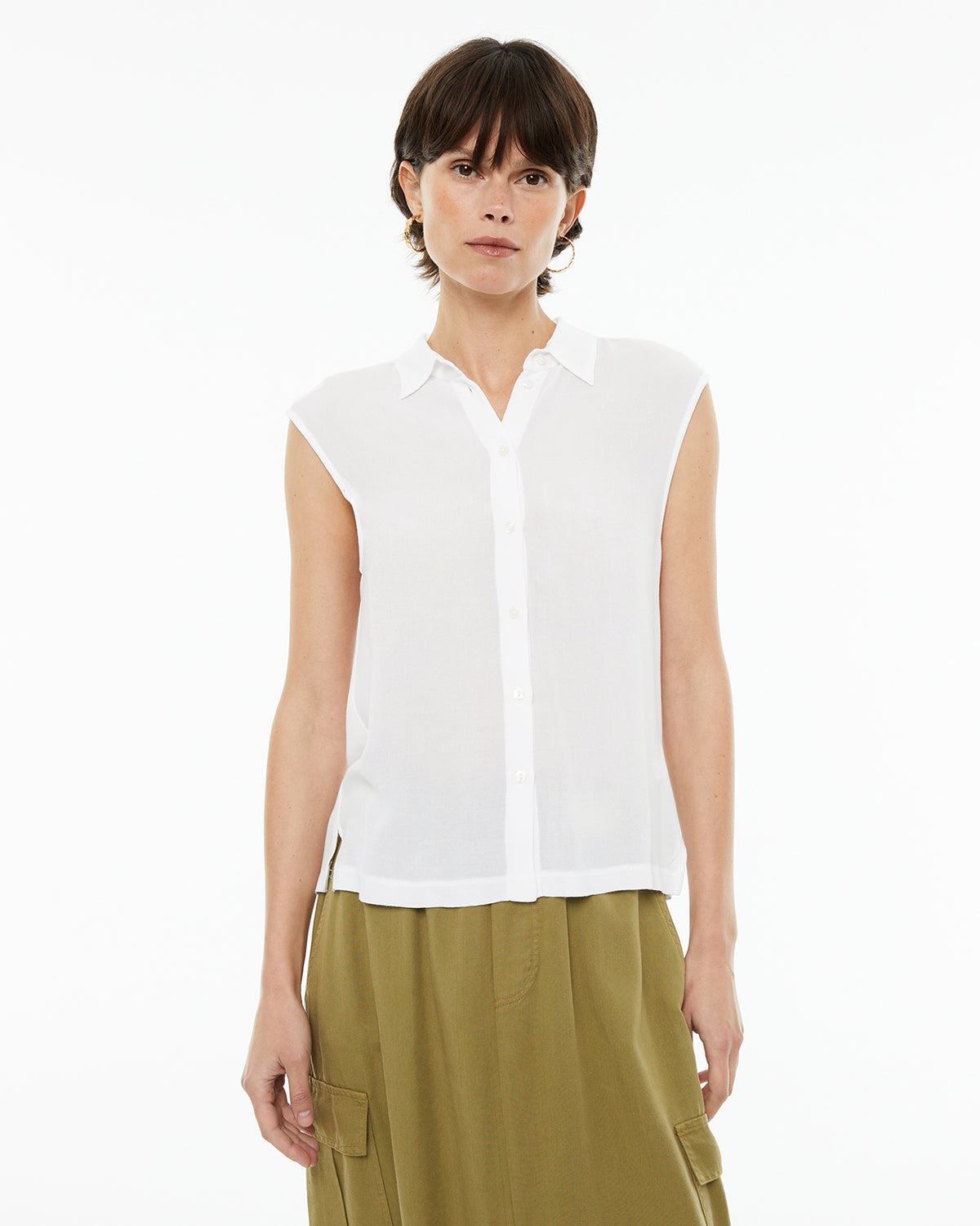Camisa de mujer fluida oversize sin mangas, con cuello camisero y cierre frontal con botones. En tres colores. Prenda sostenible.