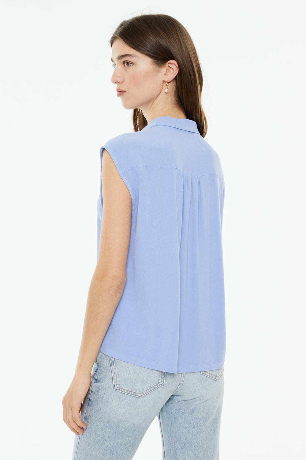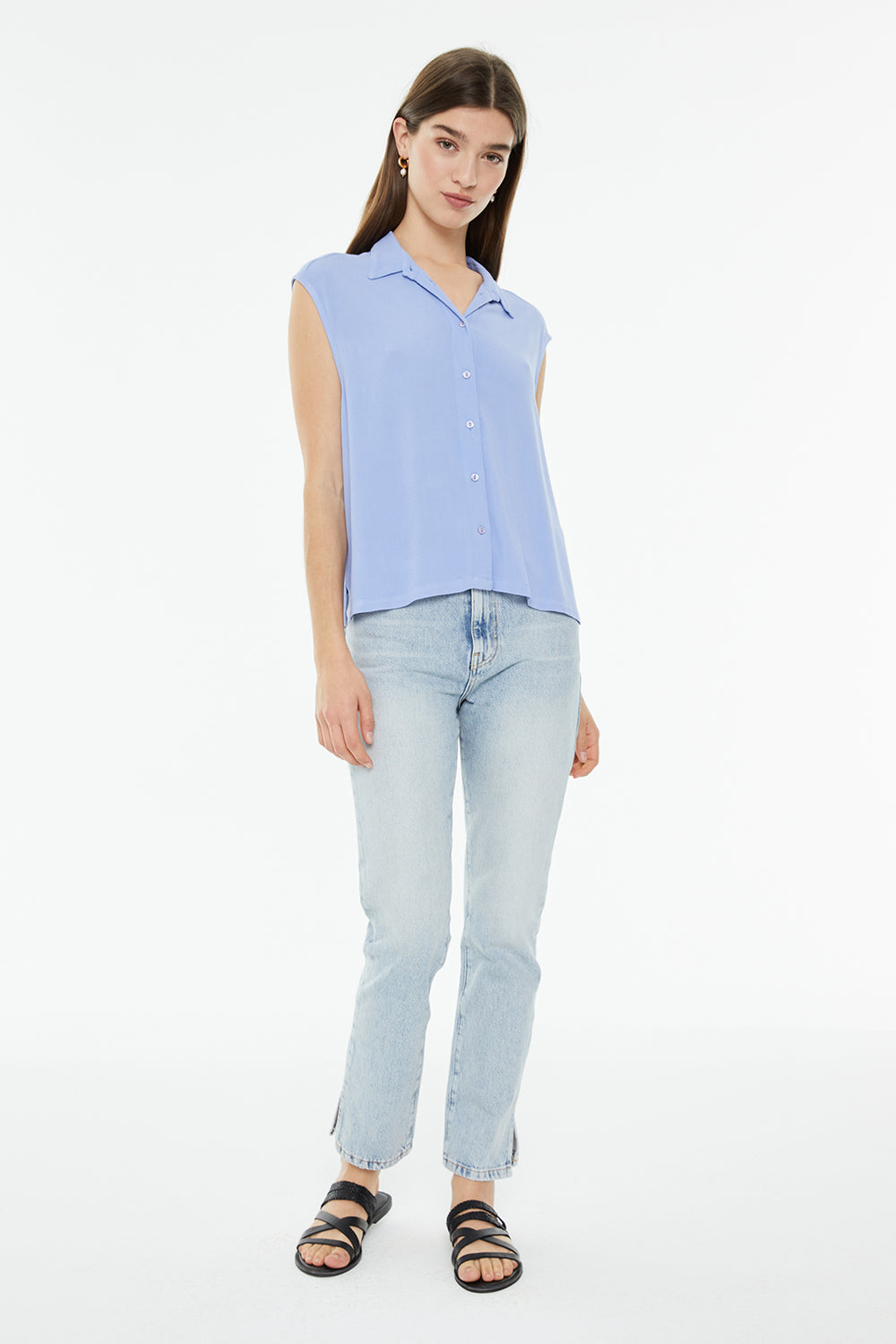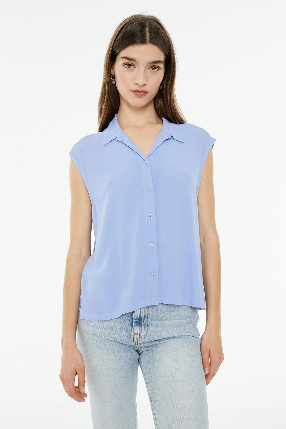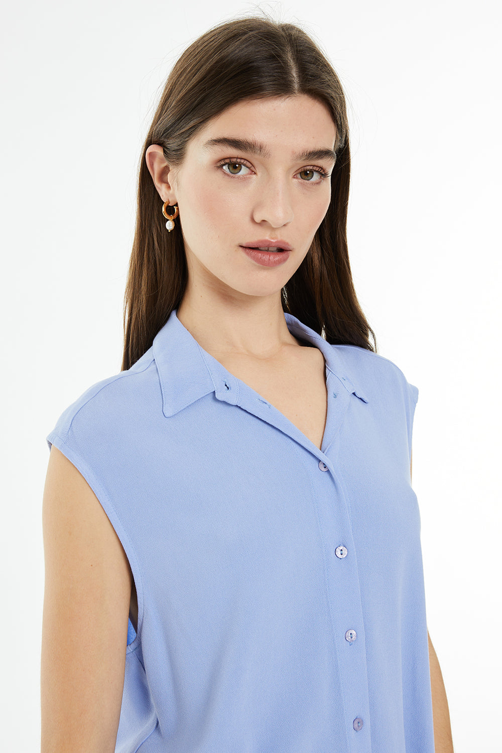 Camisa de mujer fluida oversize sin mangas, con cuello camisero y cierre frontal con botones. En tres colores. Prenda sostenible.