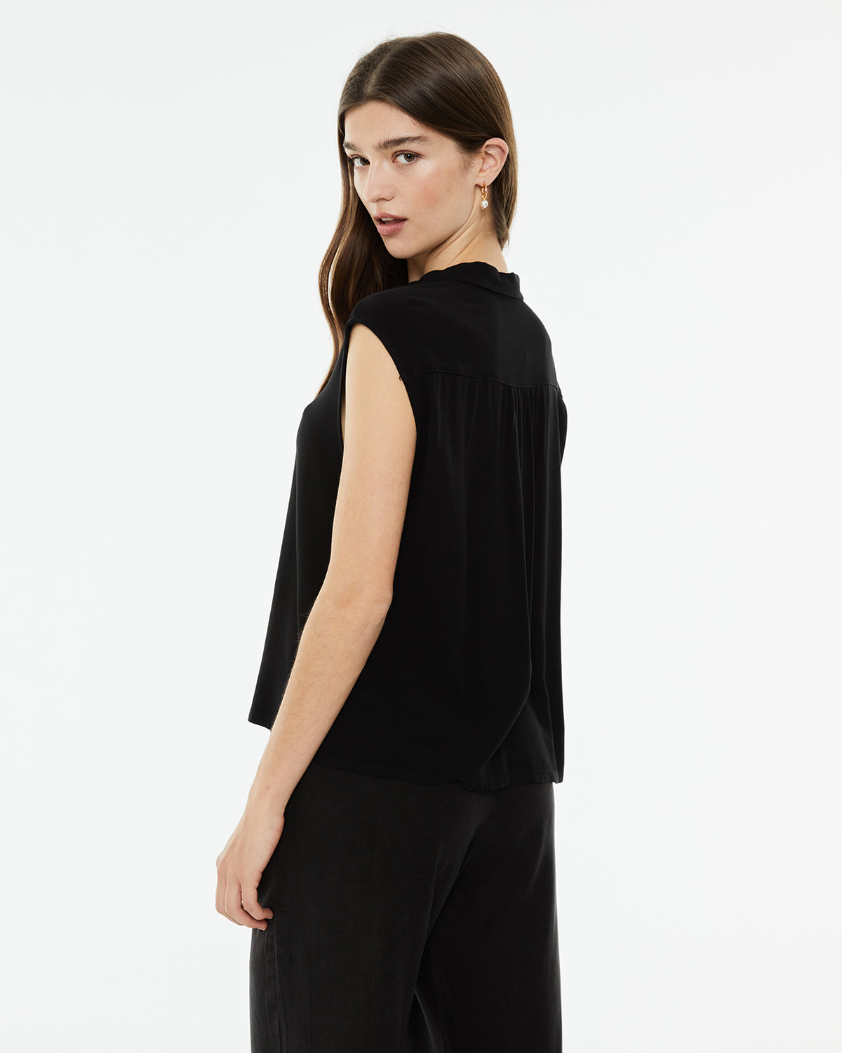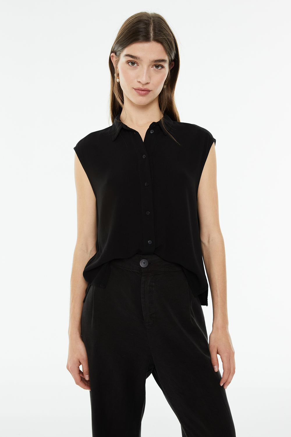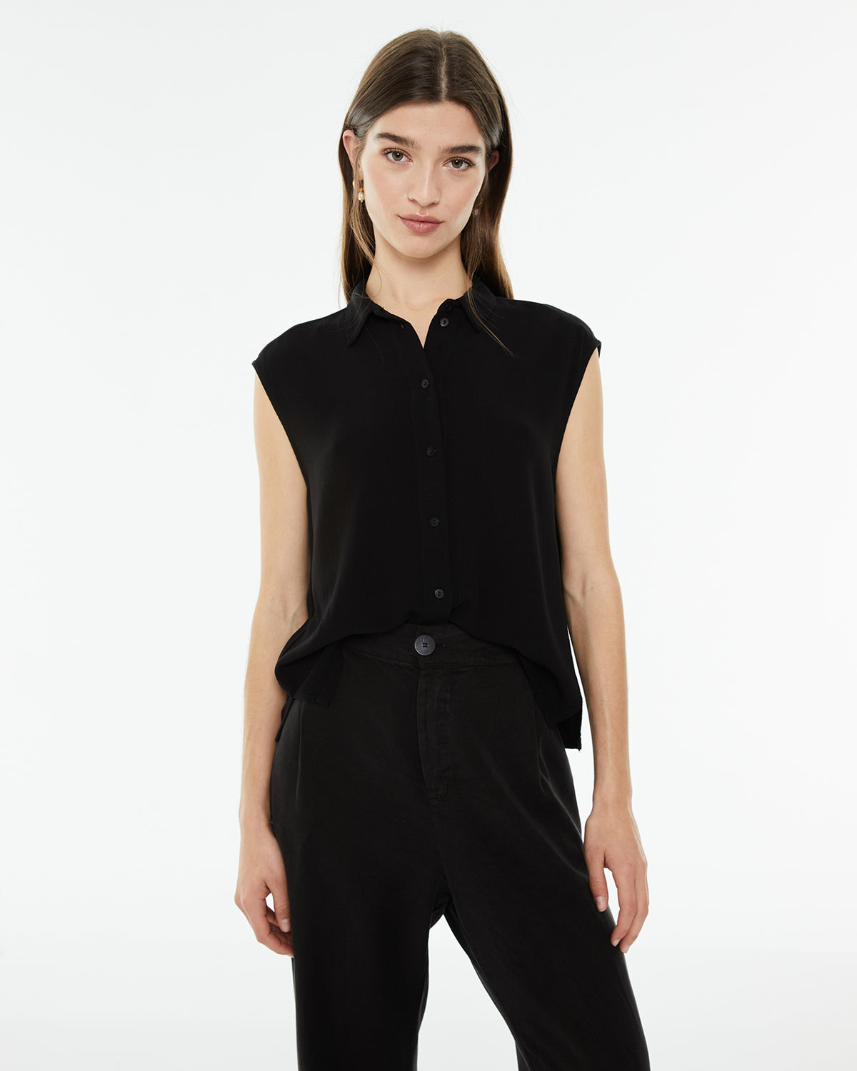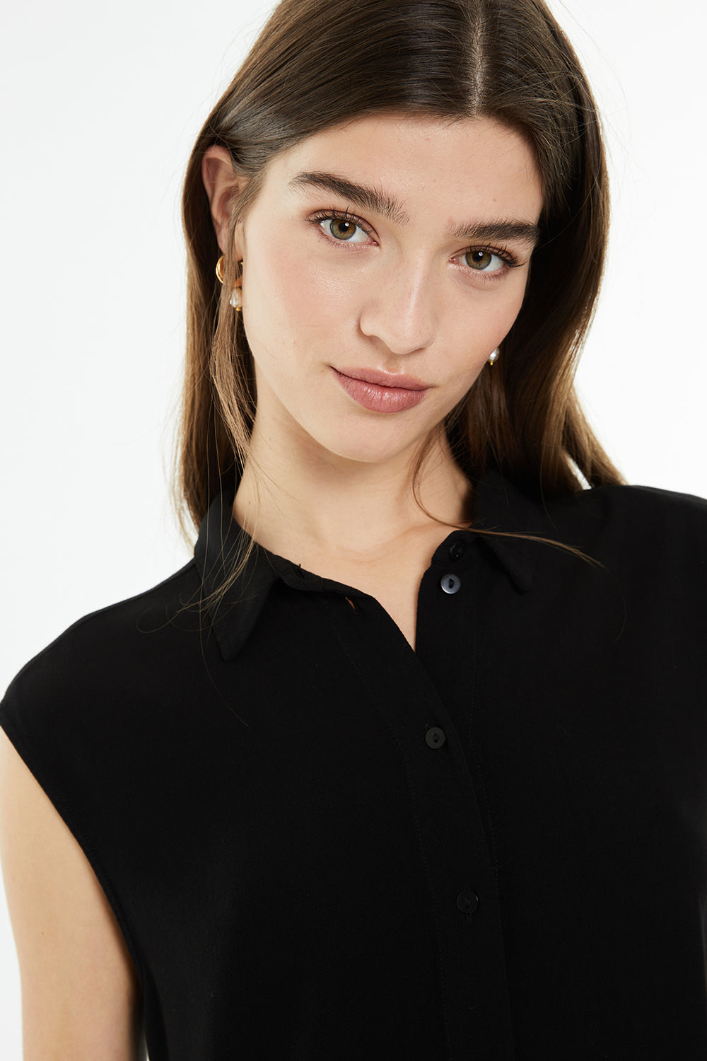 Camisa de mujer fluida oversize sin mangas, con cuello camisero y cierre frontal con botones. En tres colores. Prenda sostenible.