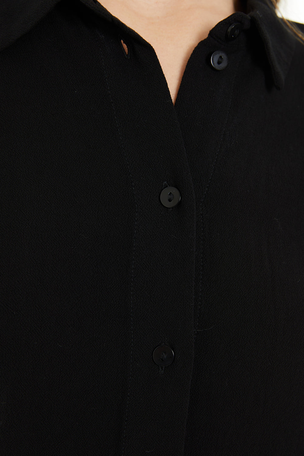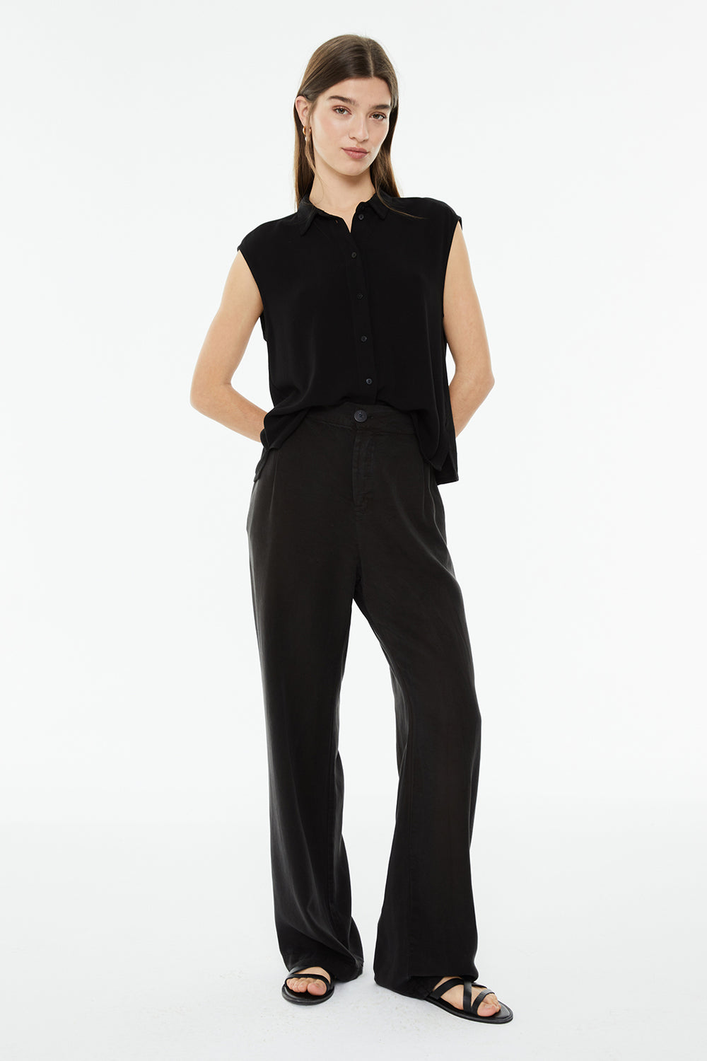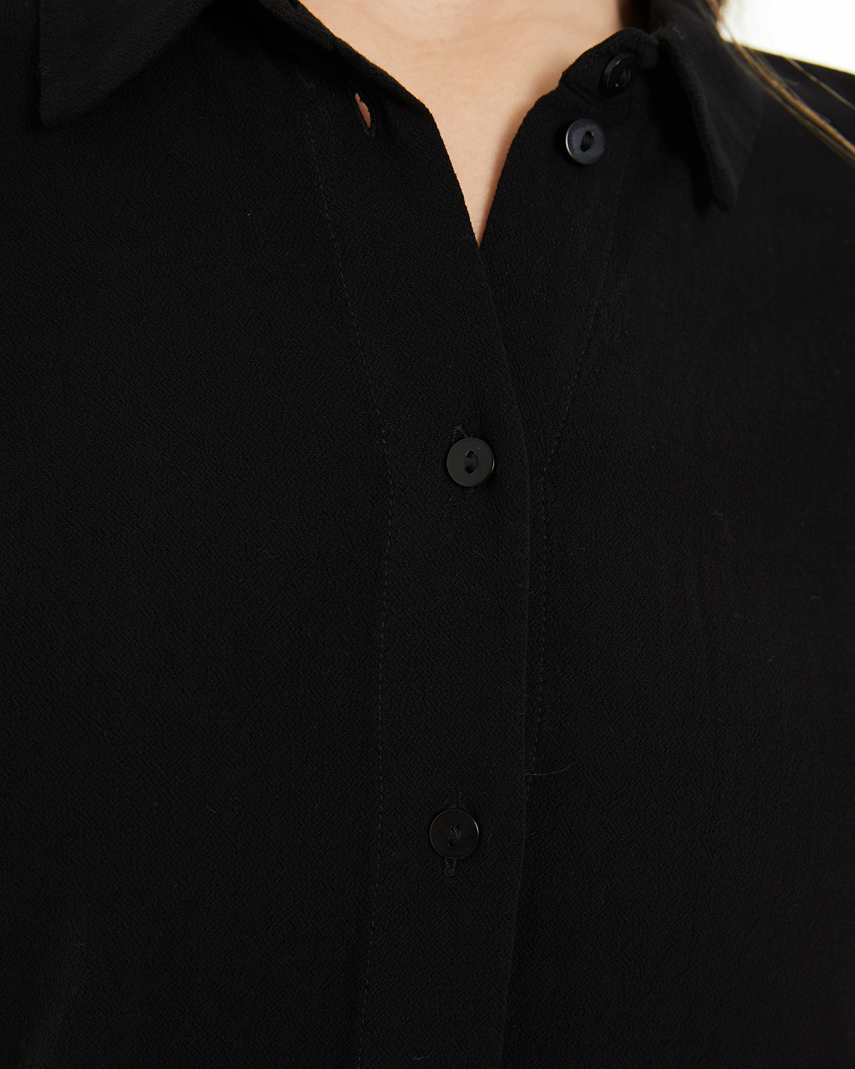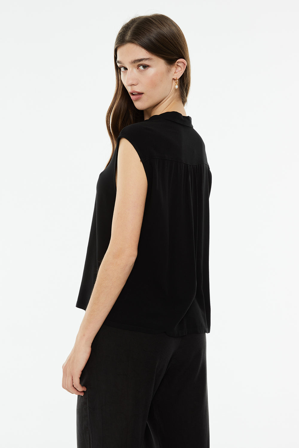 Camisa de mujer fluida oversize sin mangas, con cuello camisero y cierre frontal con botones. En tres colores. Prenda sostenible.