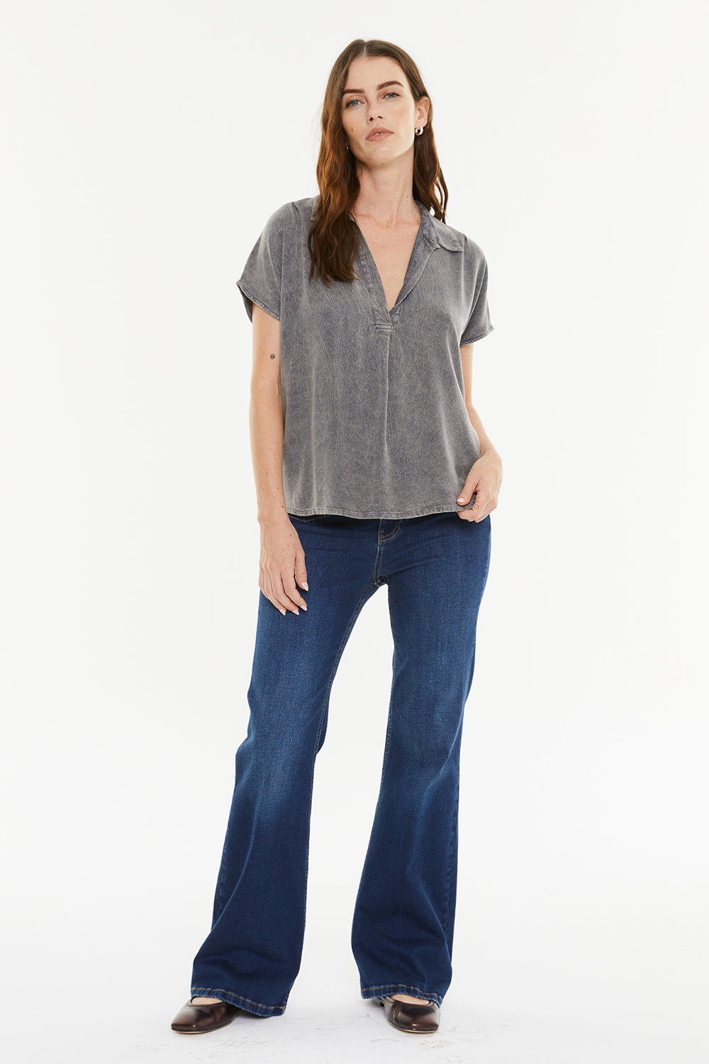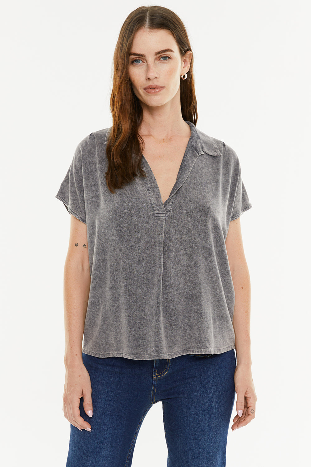 Camisa de mujer con escote polo y manga corta. Prenda sostenible.