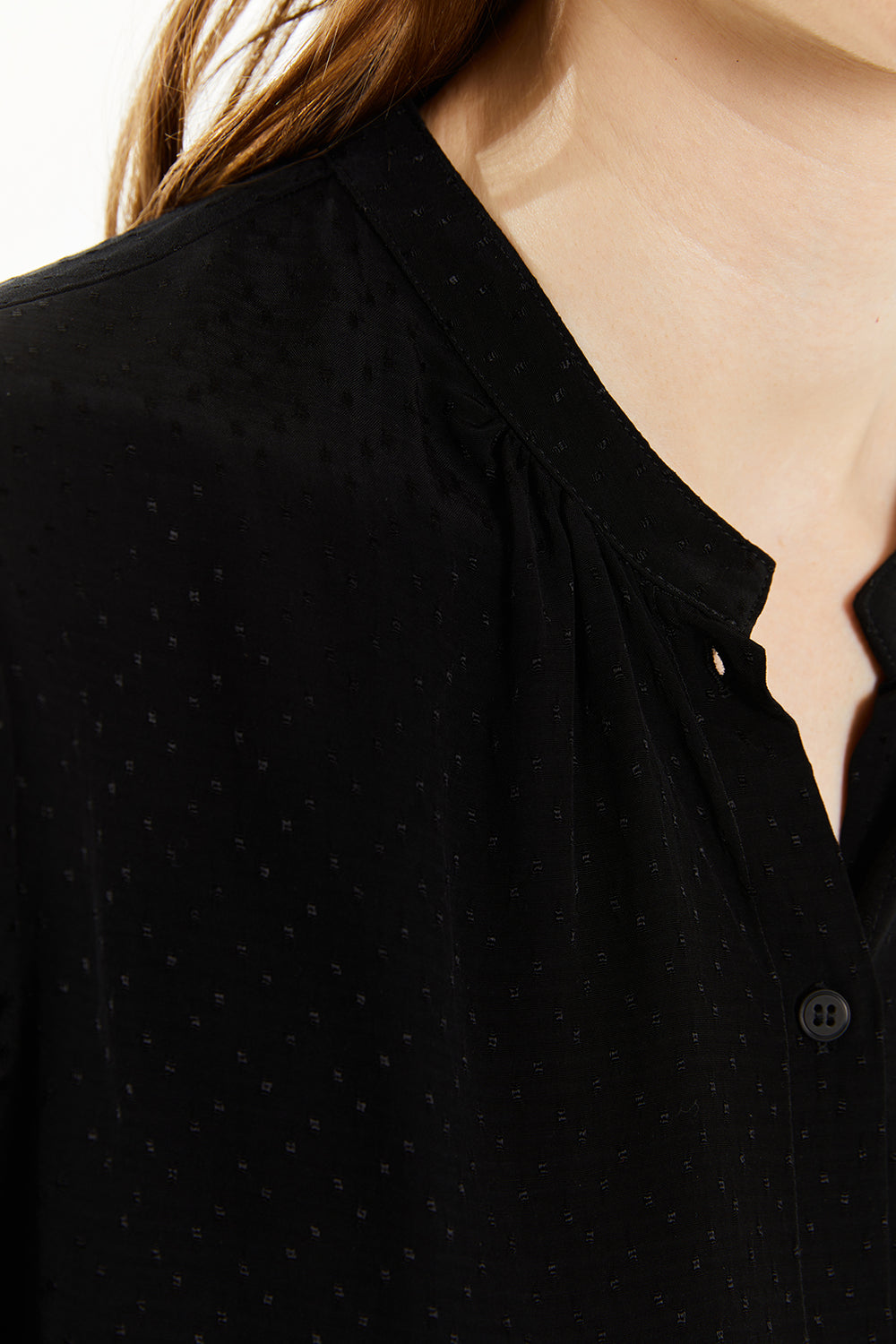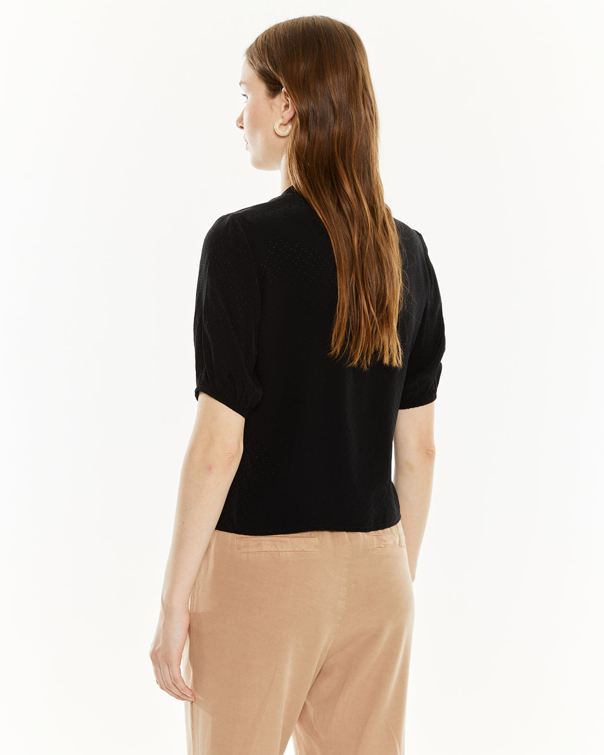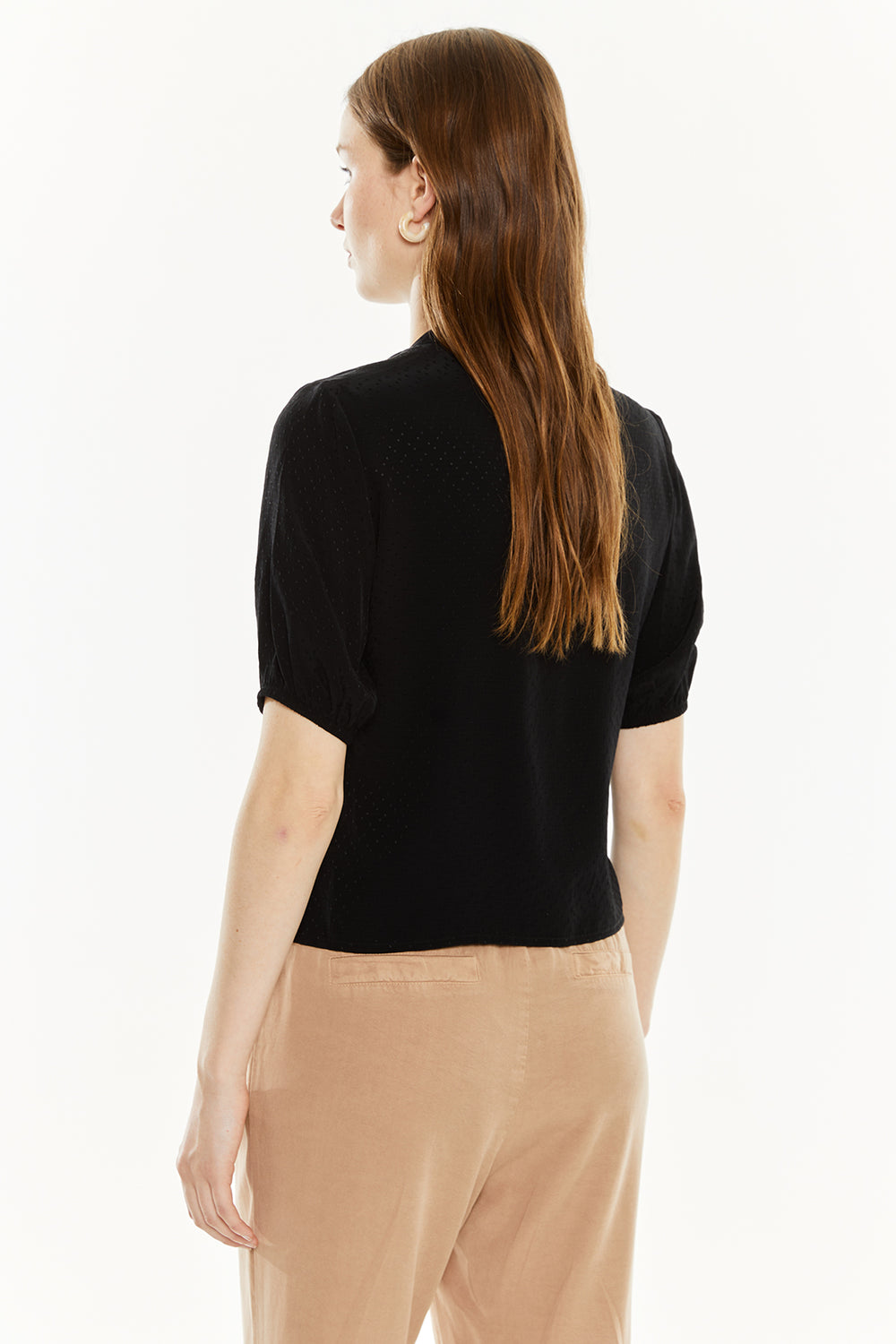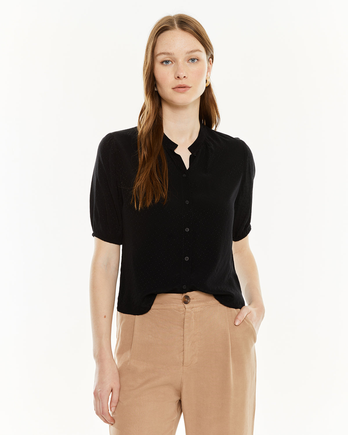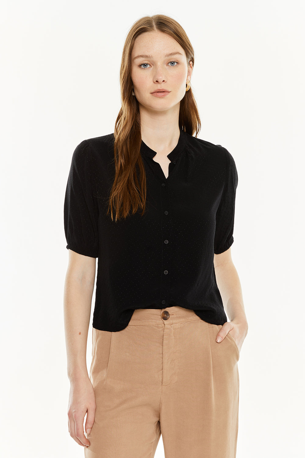 Camisa de mujer con escote redondo, mangas abullonadas con goma y cierre frontal con botones. Prenda sostenible.