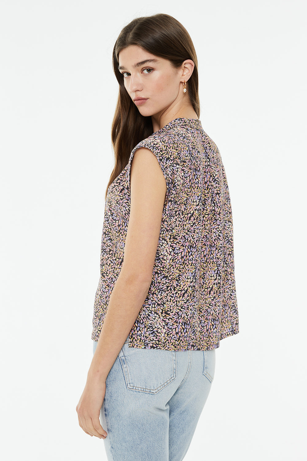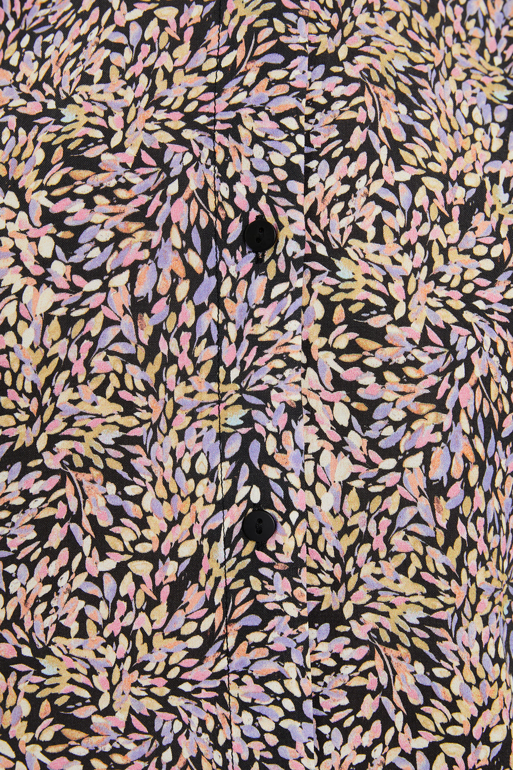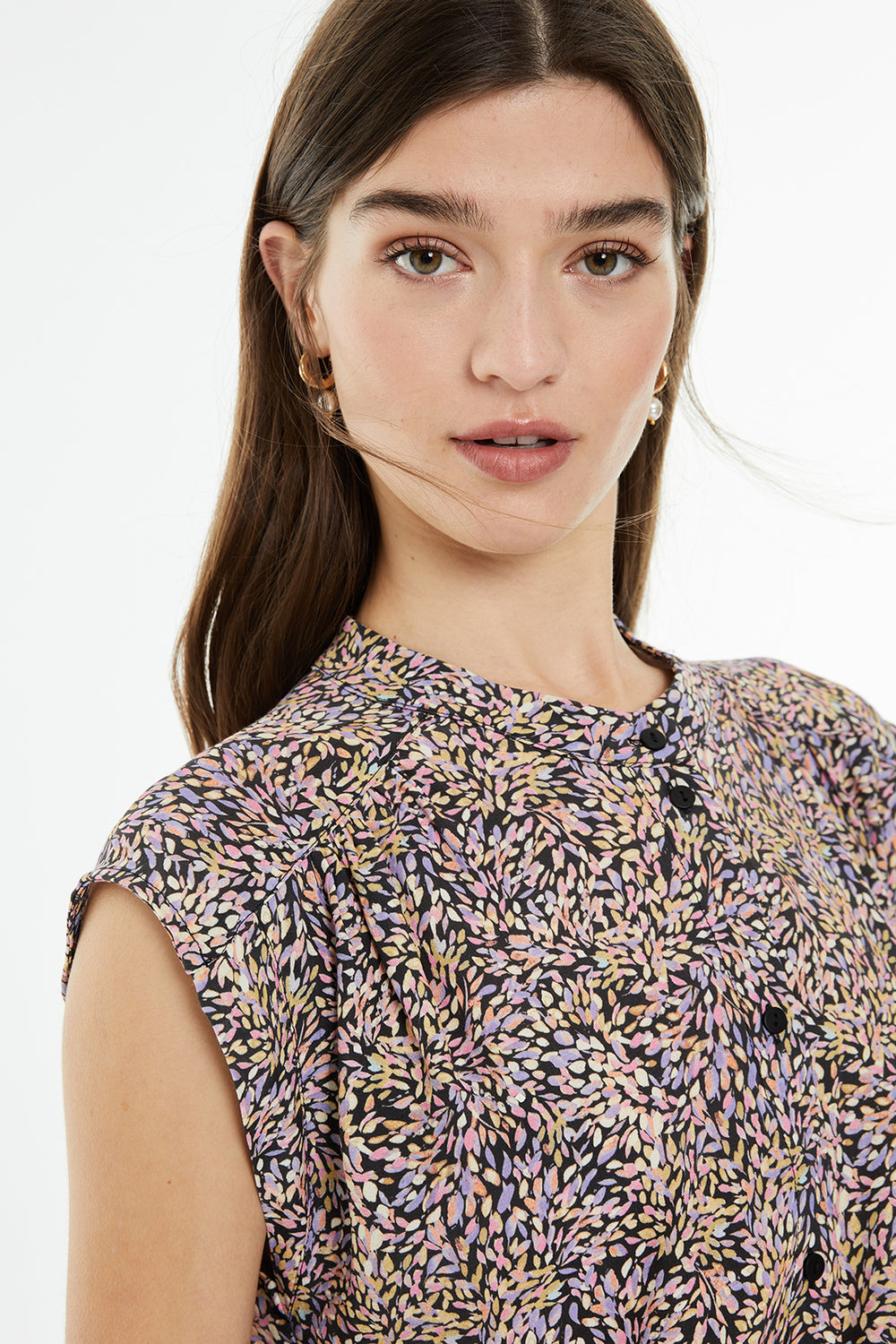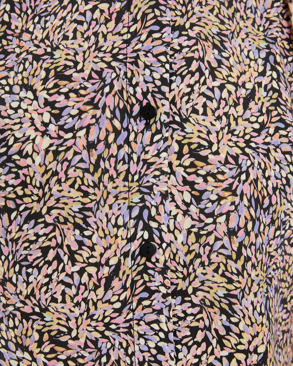 Camisa de mujer estampada, oversize, con hombros caídos, cuello mao y cierre frontal con botones. Estampado de hojas de colores.