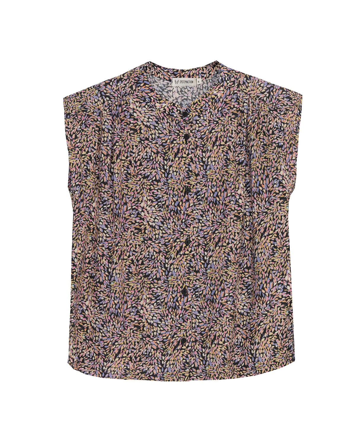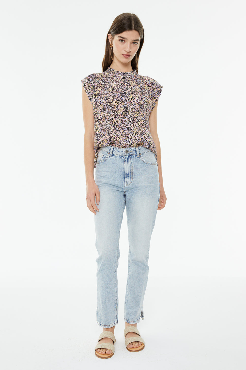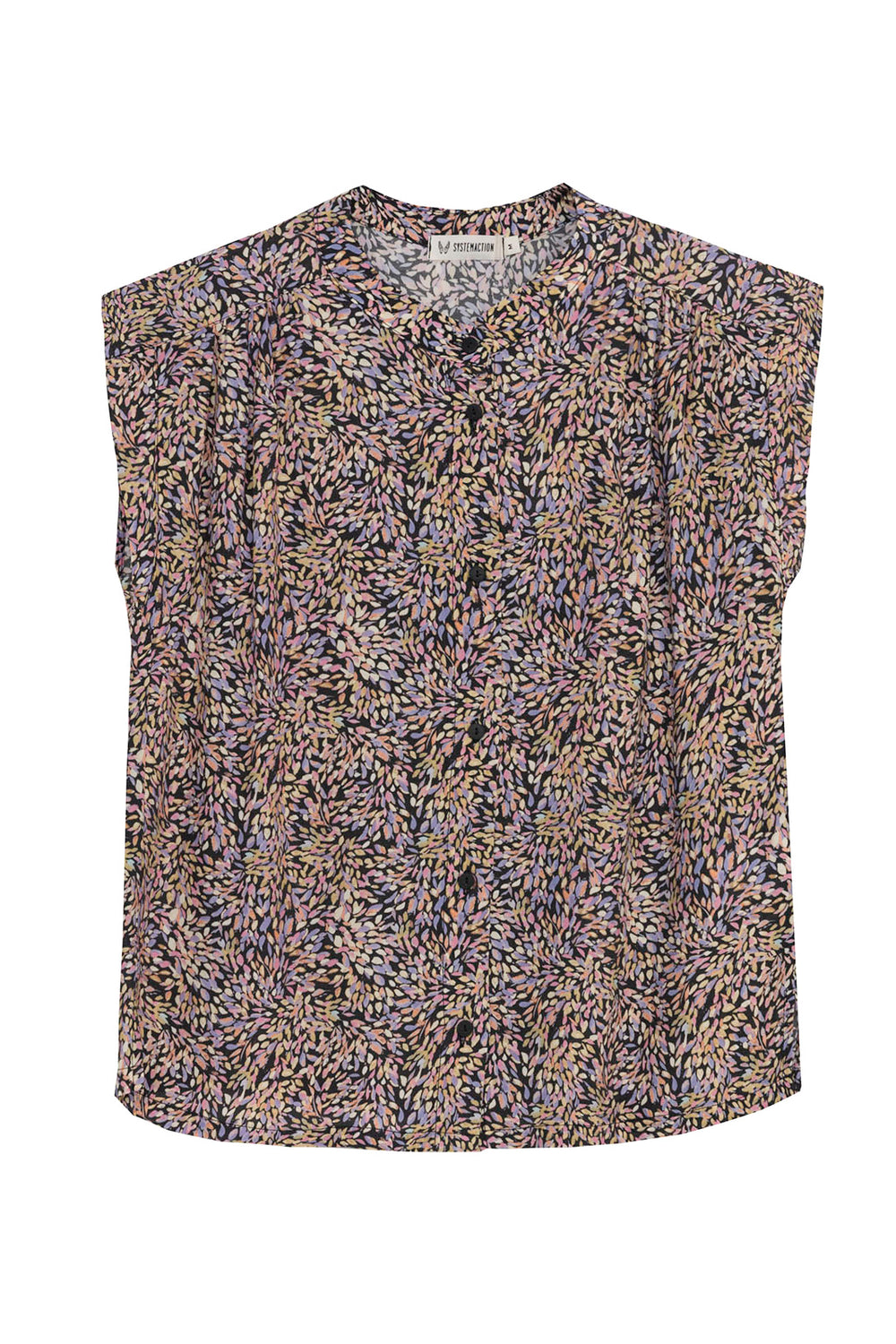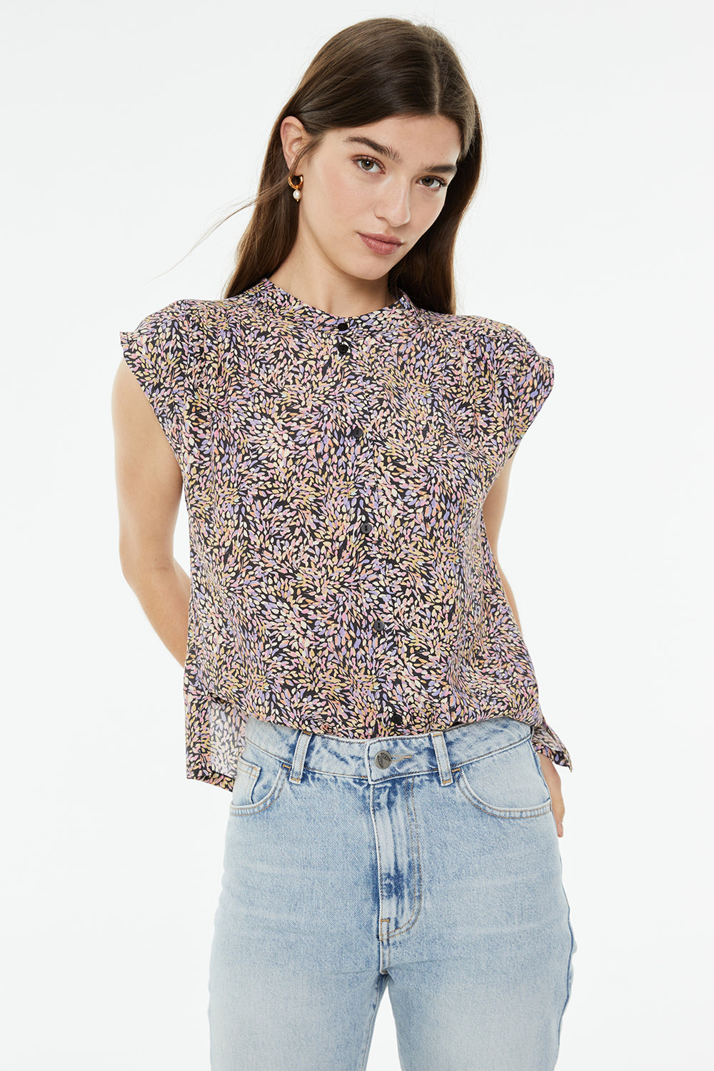 Camisa de mujer estampada, oversize, con hombros caídos, cuello mao y cierre frontal con botones. Estampado de hojas de colores.