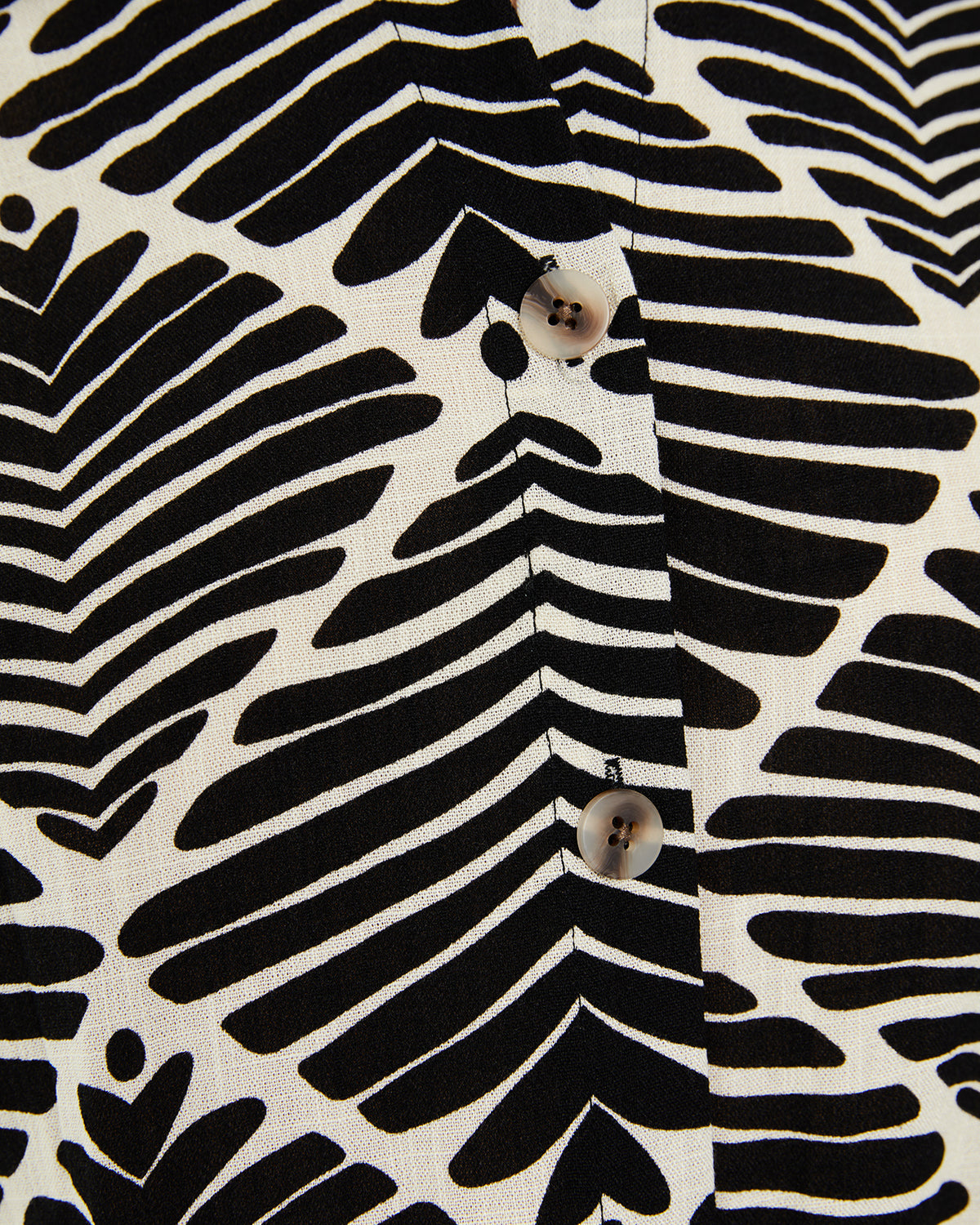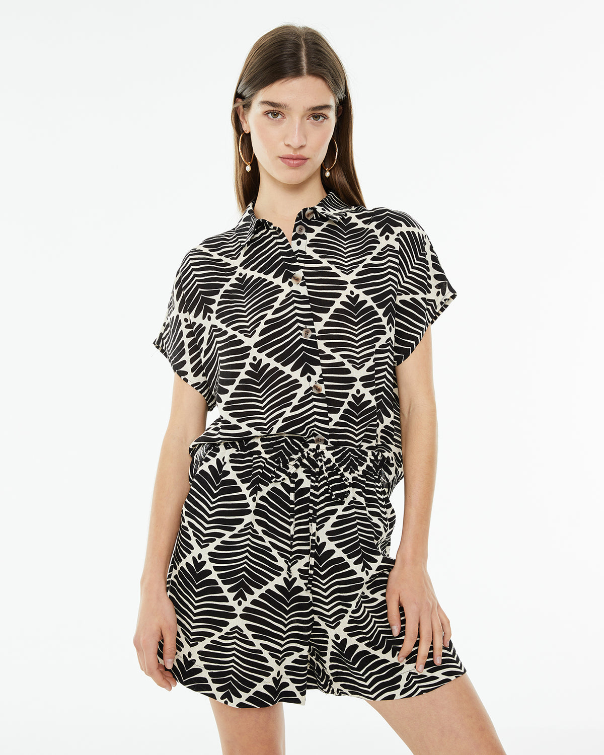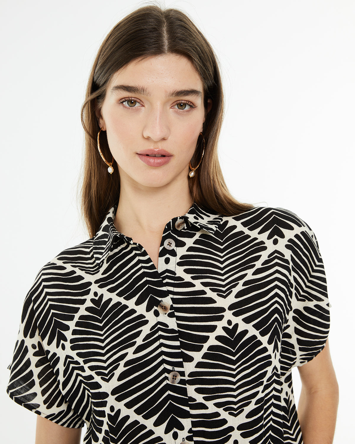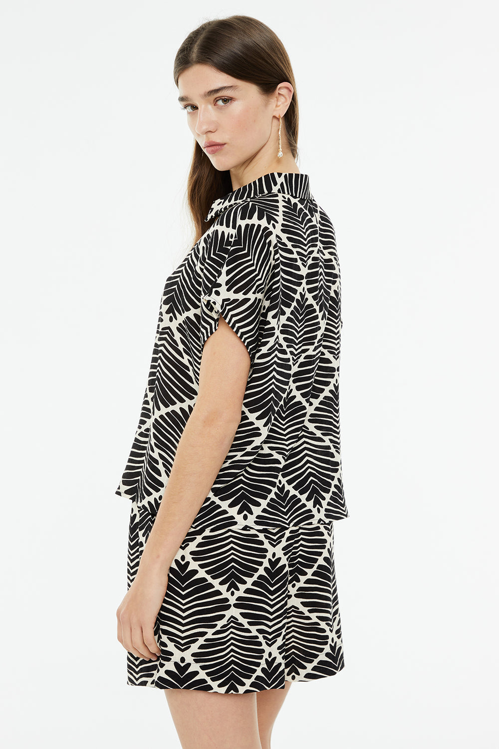 Camisa de mujer oversize con manga caída, con cuello pico y cierre frontal con botones. Estampado geométrico bicolor. Detalle de nudo en la parte frontal.