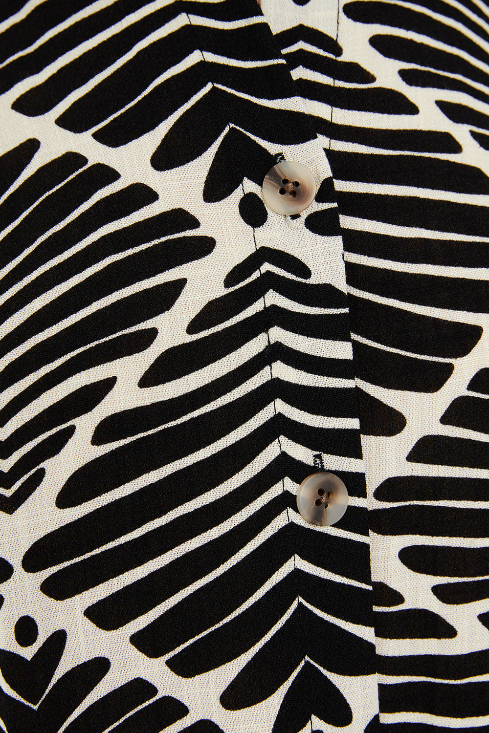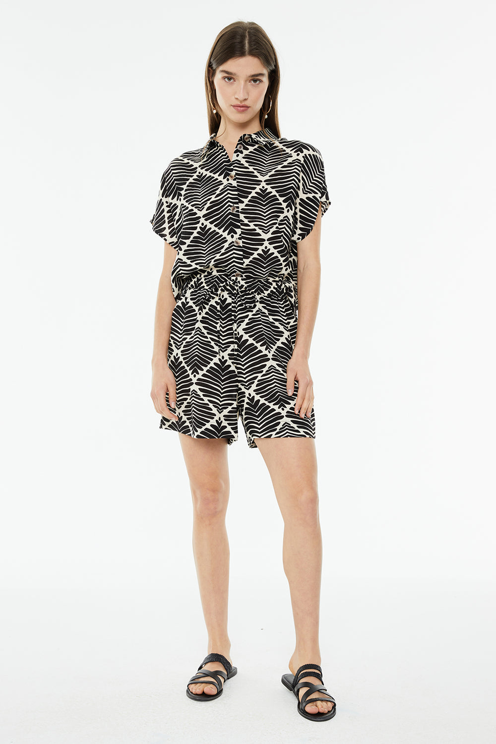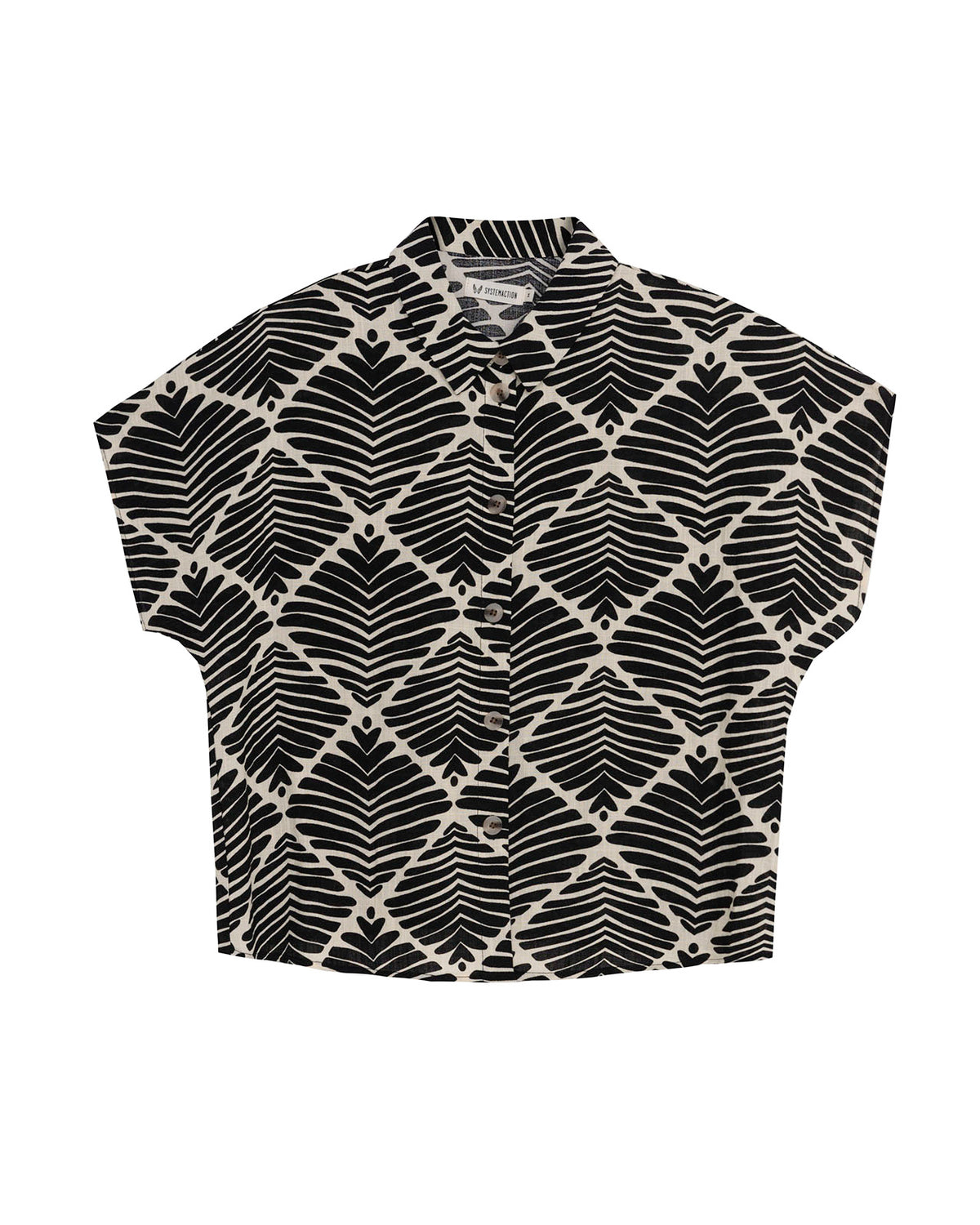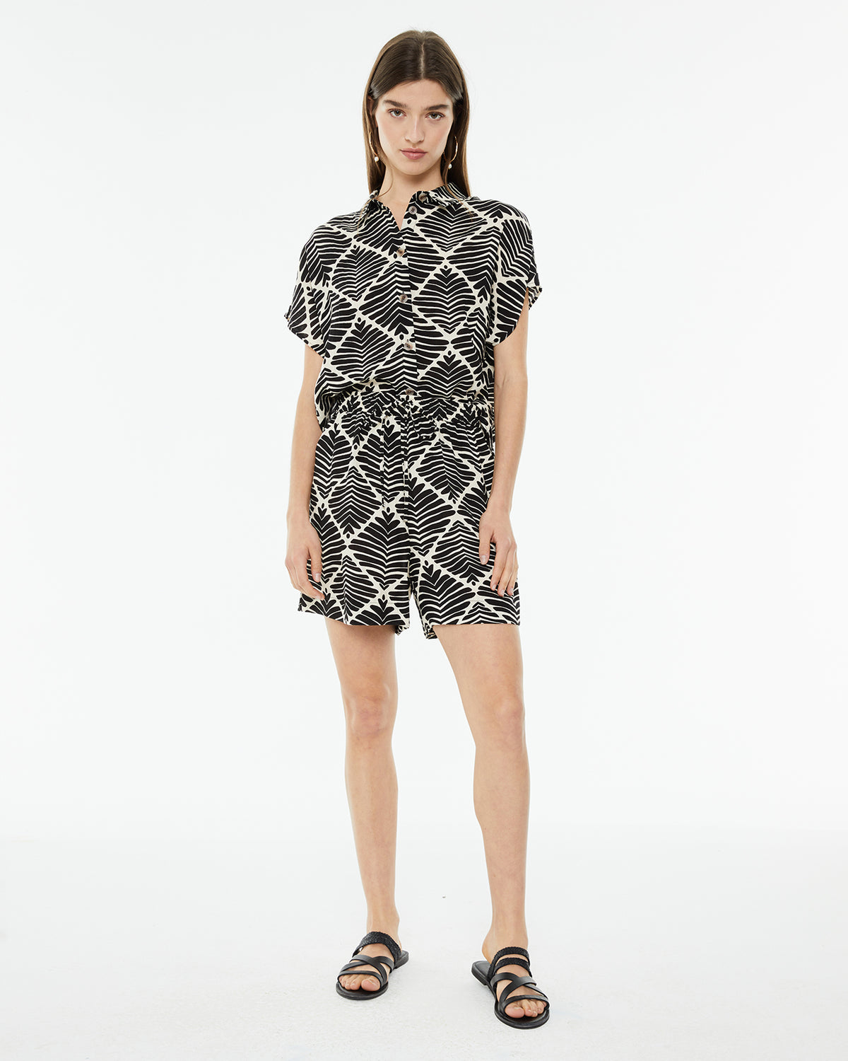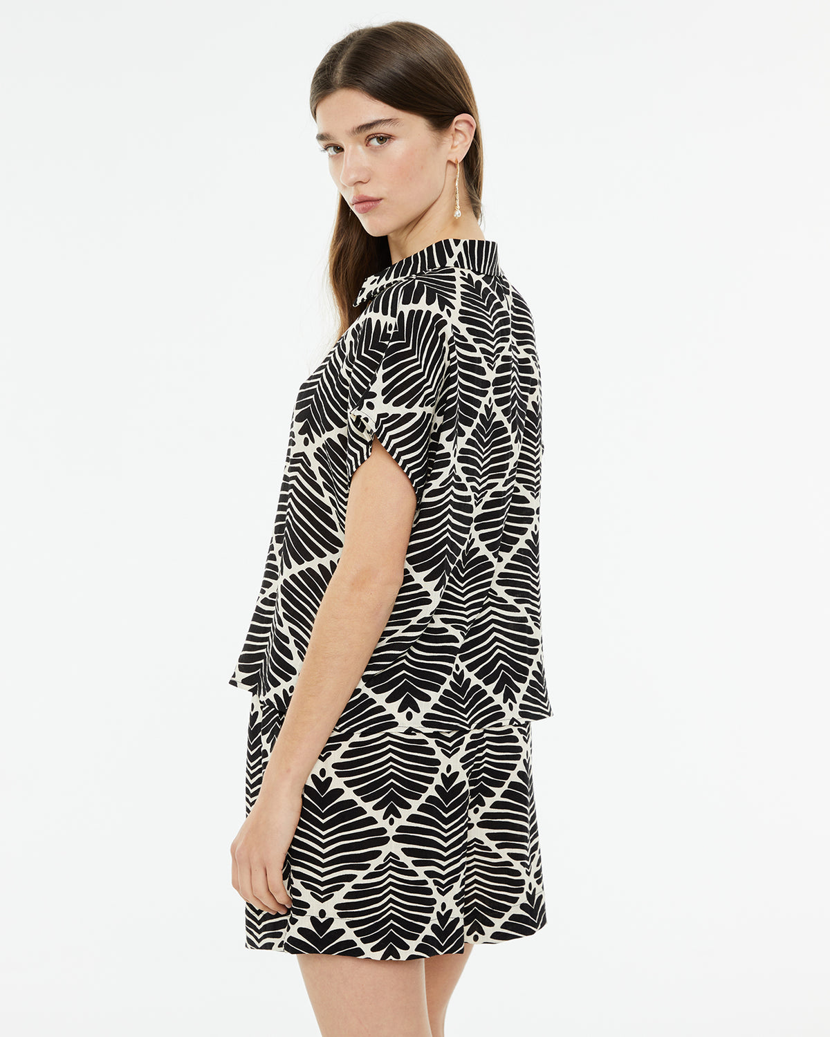 Camisa de mujer oversize con manga caída, con cuello pico y cierre frontal con botones. Estampado geométrico bicolor. Detalle de nudo en la parte frontal.
