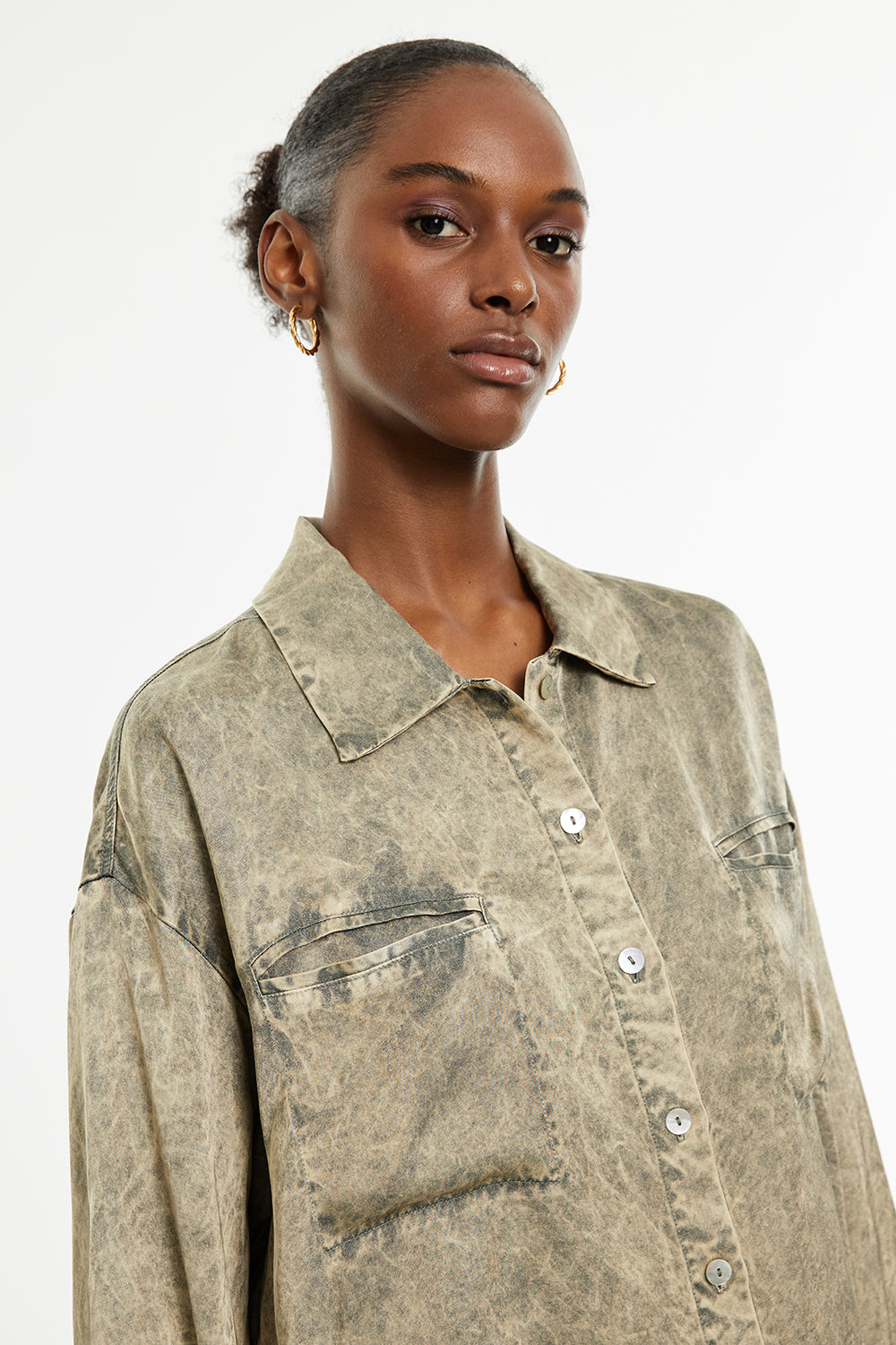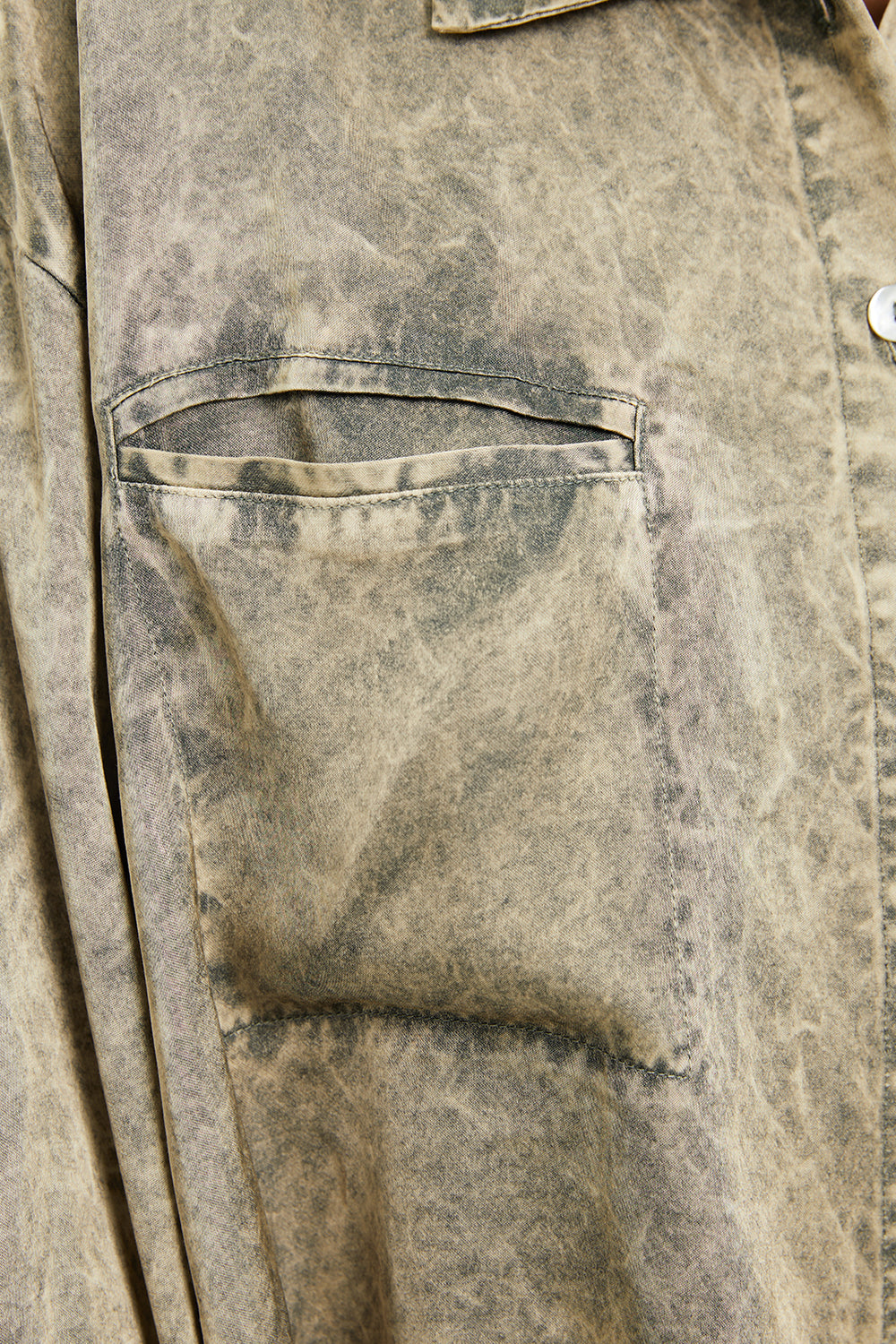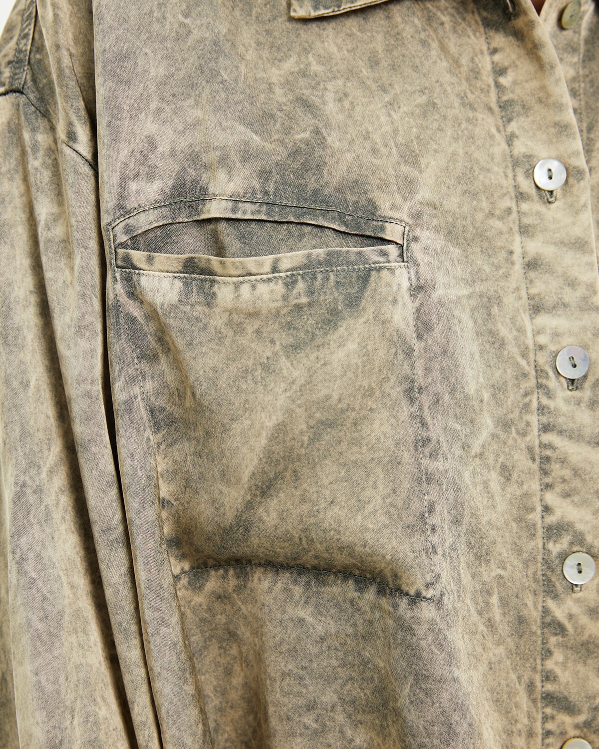 Camisa tintes corrosivos de manga larga doble bolsillo frontal y cuello camisero.