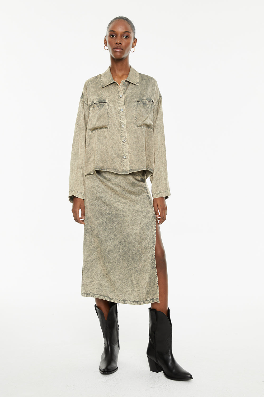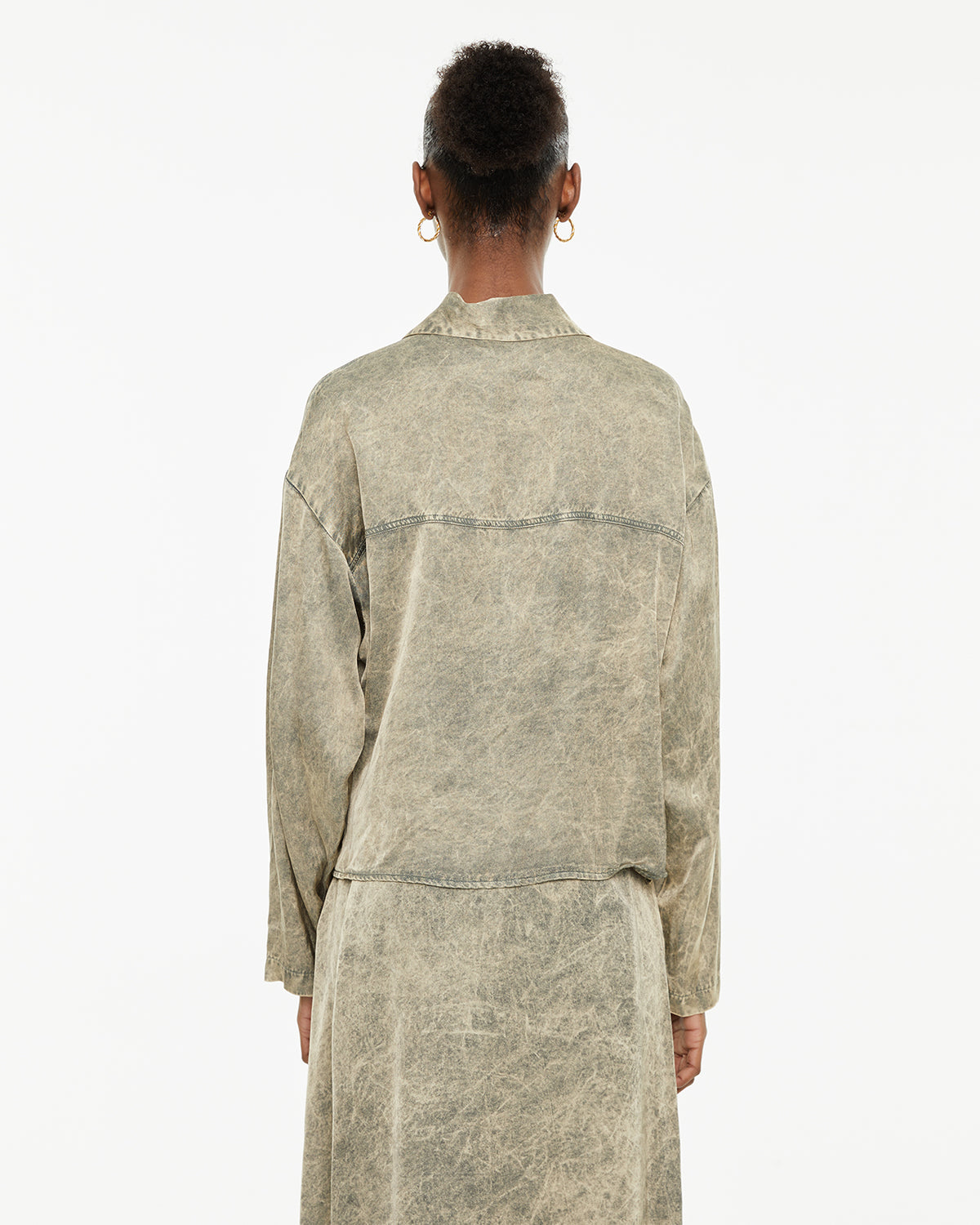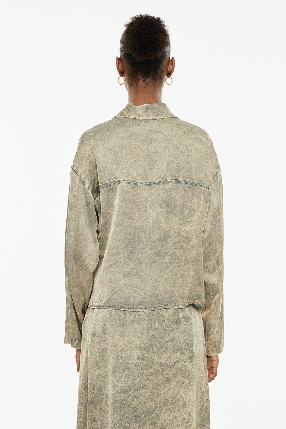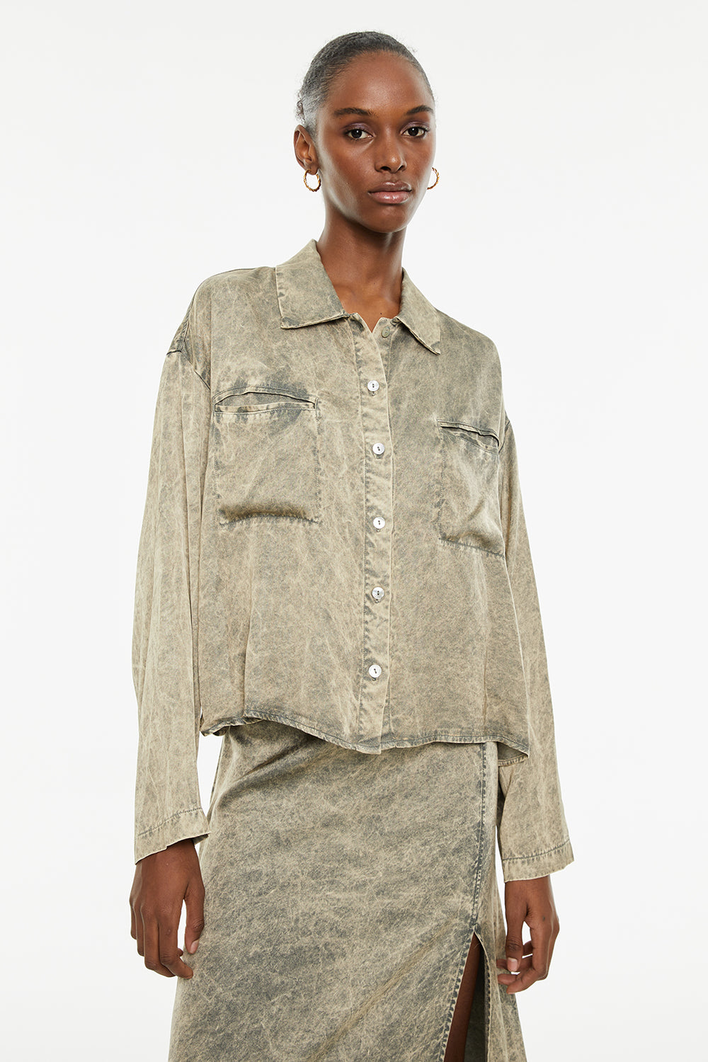 Camisa tintes corrosivos de manga larga doble bolsillo frontal y cuello camisero.