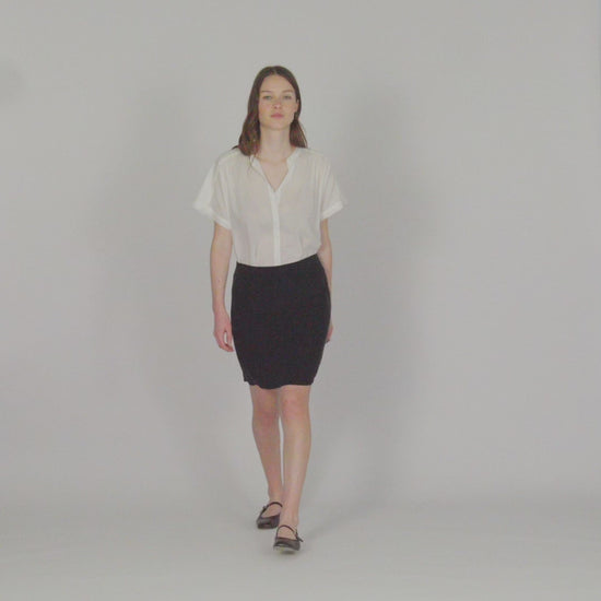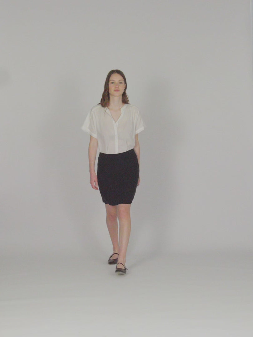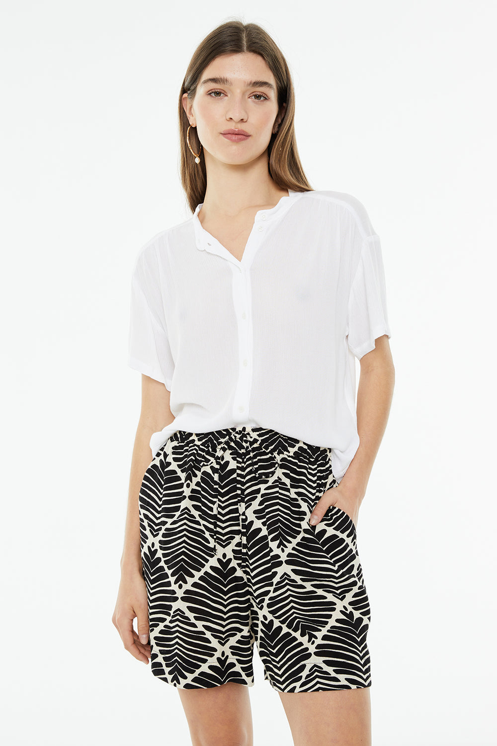 Camisa de mujer oversize con manga caída, con cuello mao y cierre frontal con botones. Tejido de bambula. Prenda sostenible.
