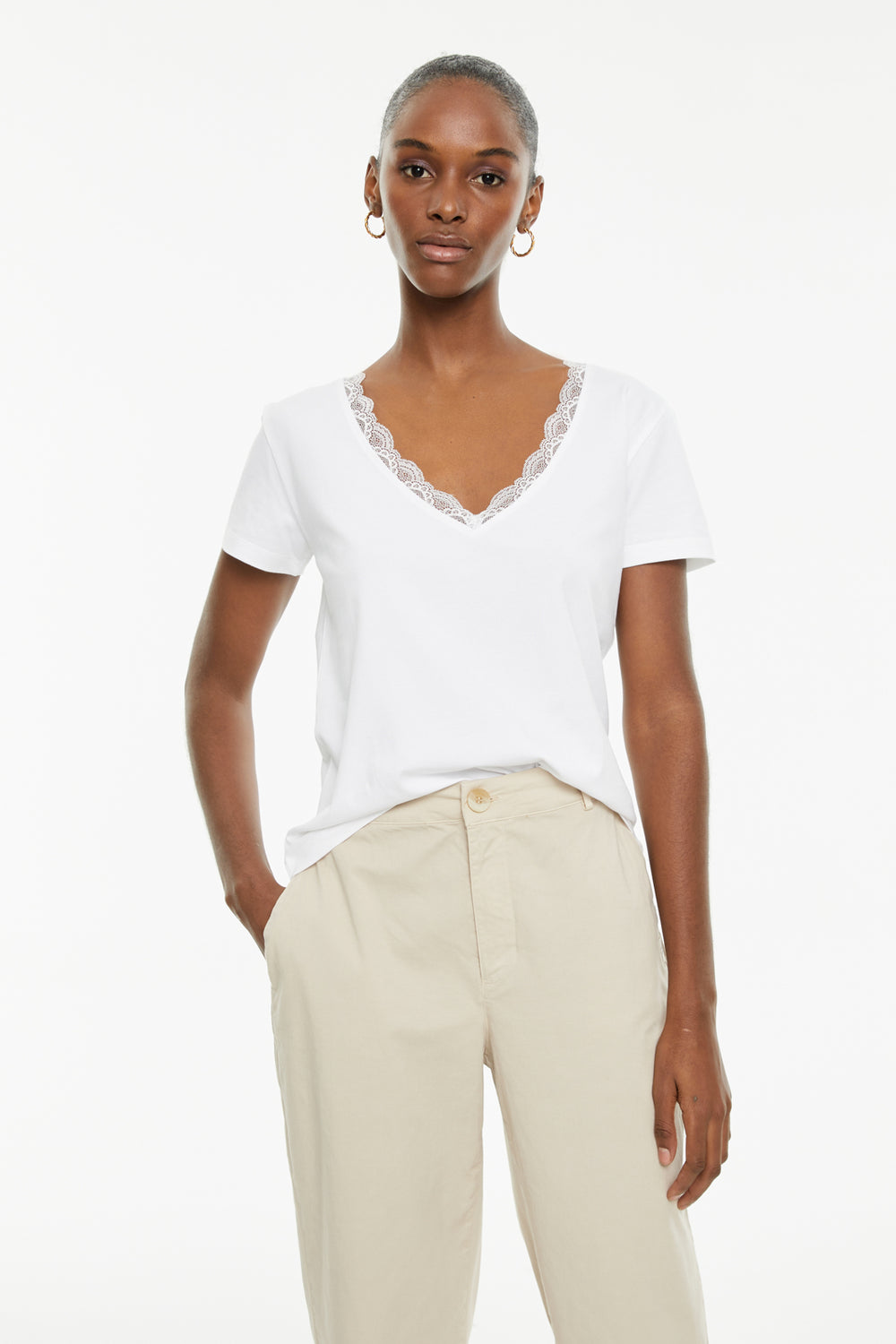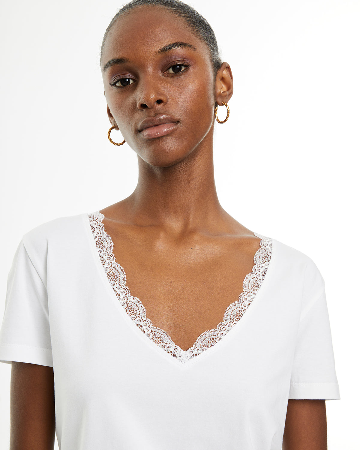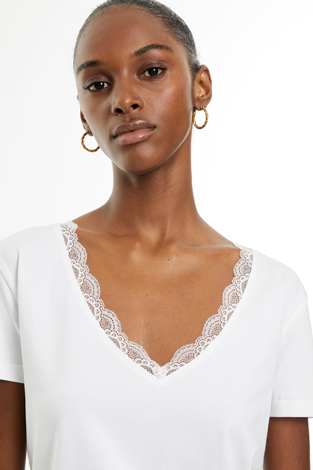 Camiseta ajustada manga corta con detalle encaje en escote pico