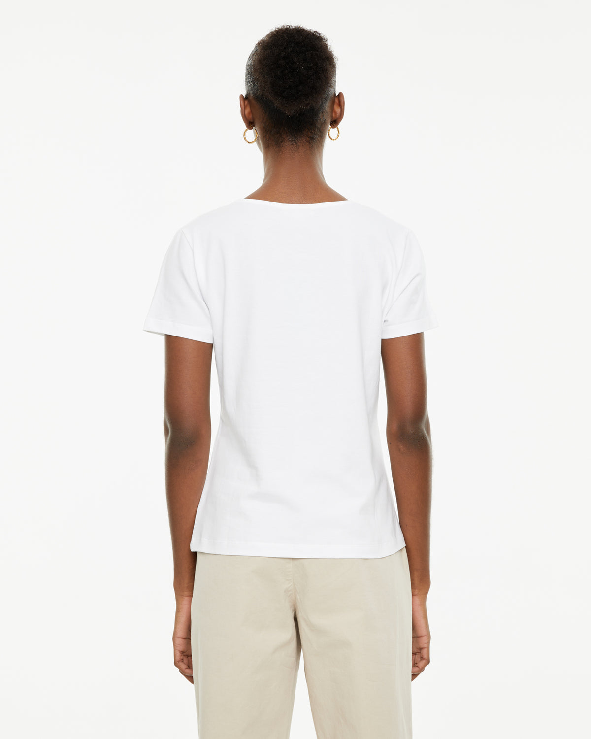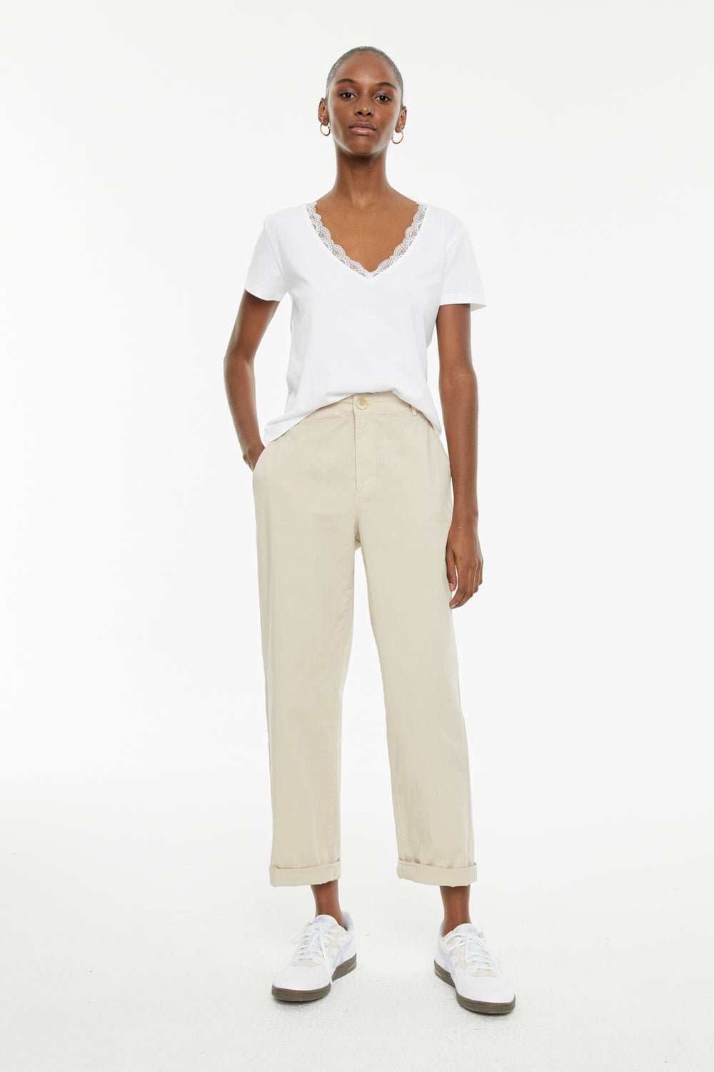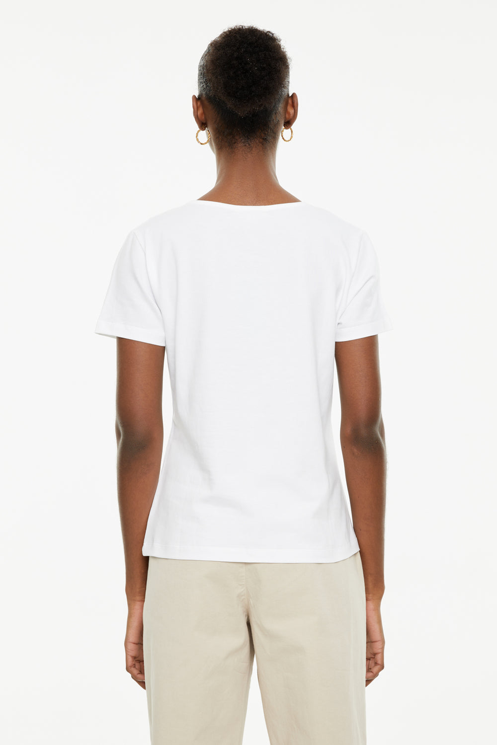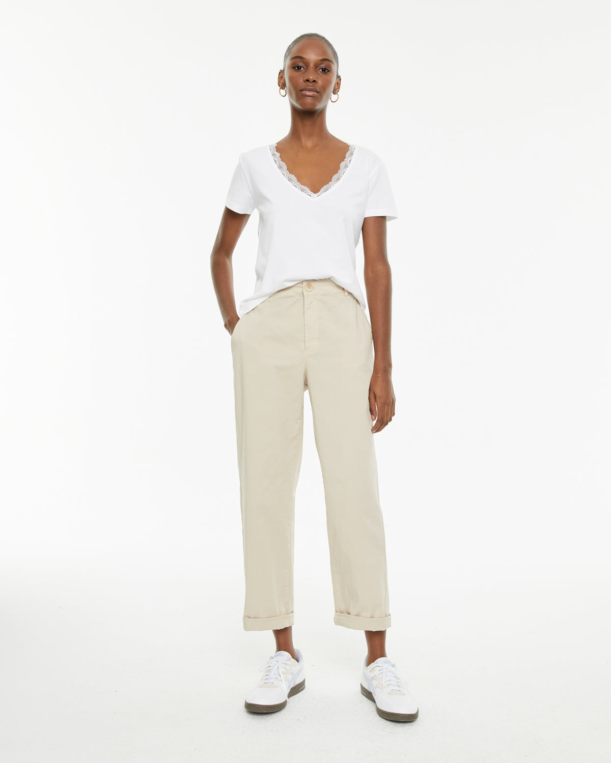 Camiseta de mujer ajustada de manga corta, con escote pico y detalle de encaje en el escote. Prenda sostenible.