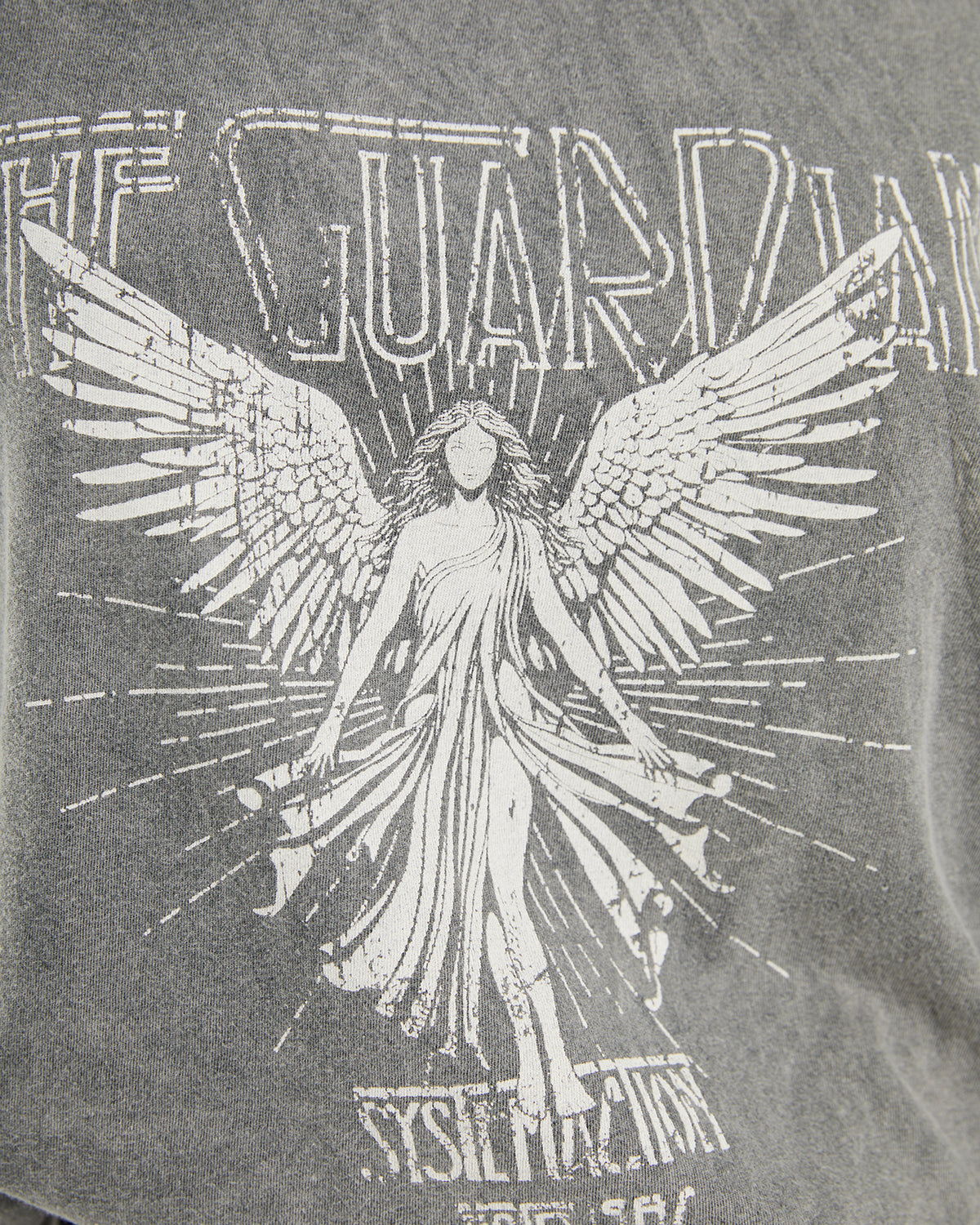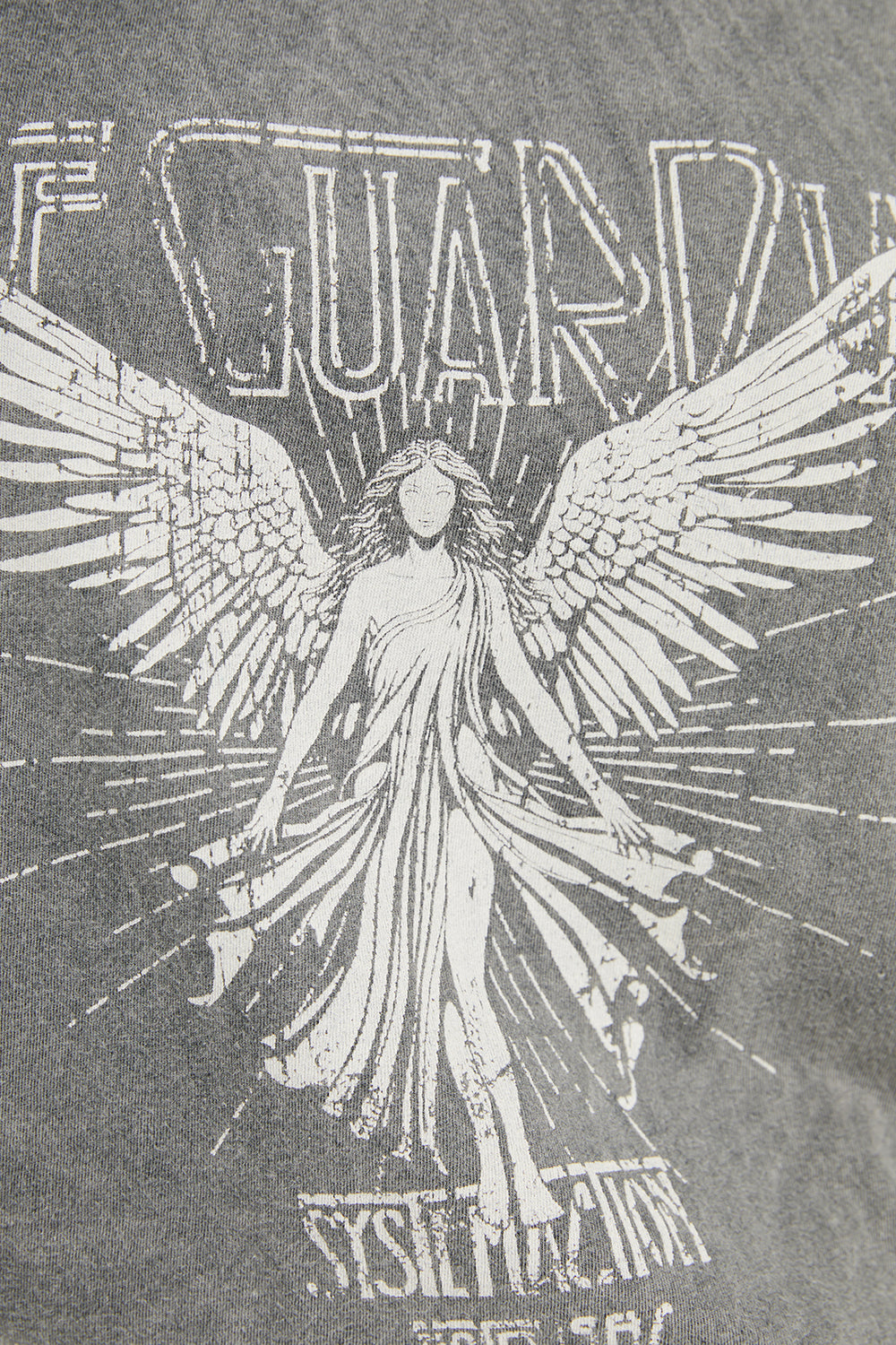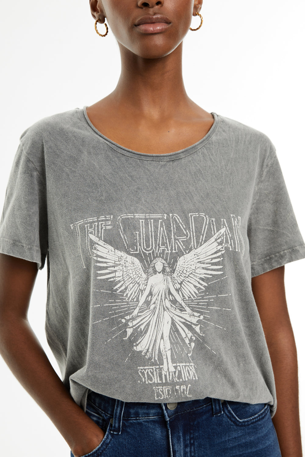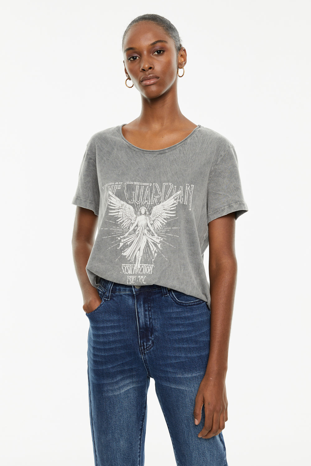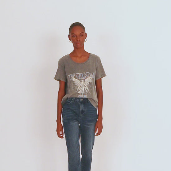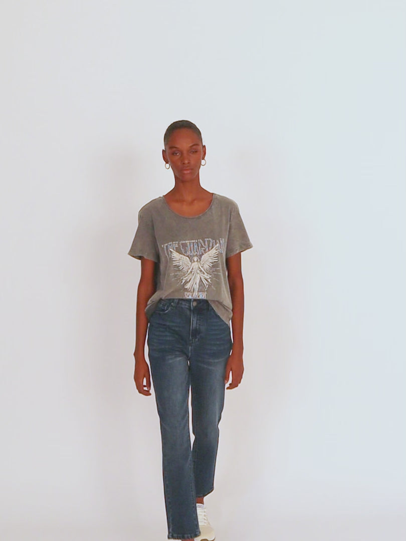 Camiseta de mujer de algodón orgánico de manga corta y cuello redondo con estampado de ángel y texto. Tinte especial efecto desgastado. Prenda sostenible.