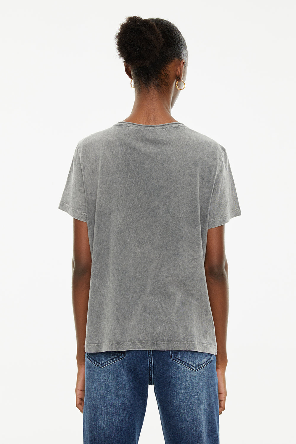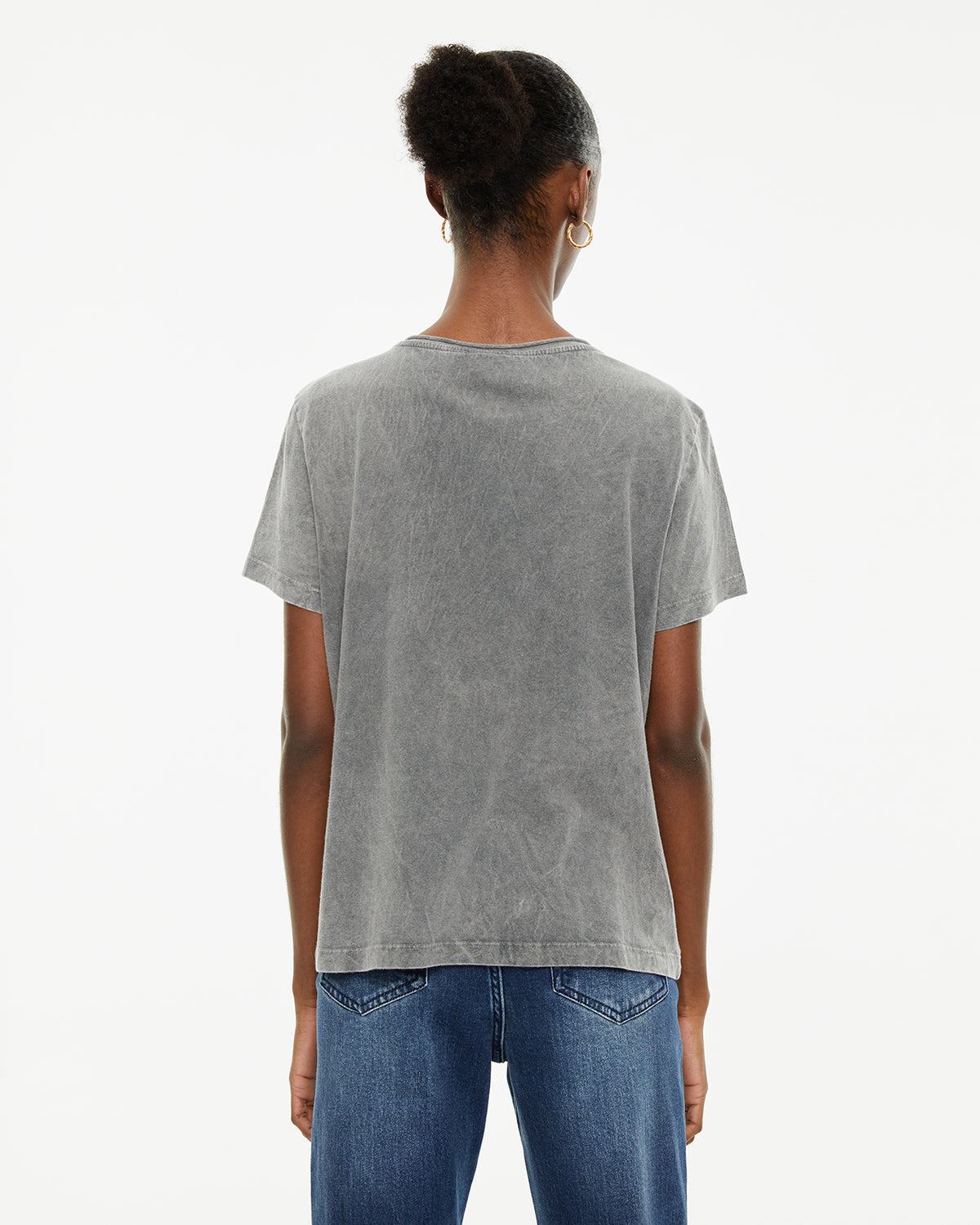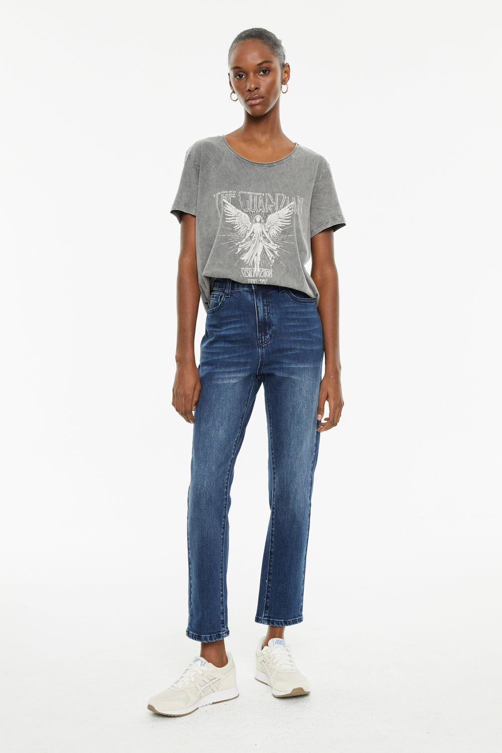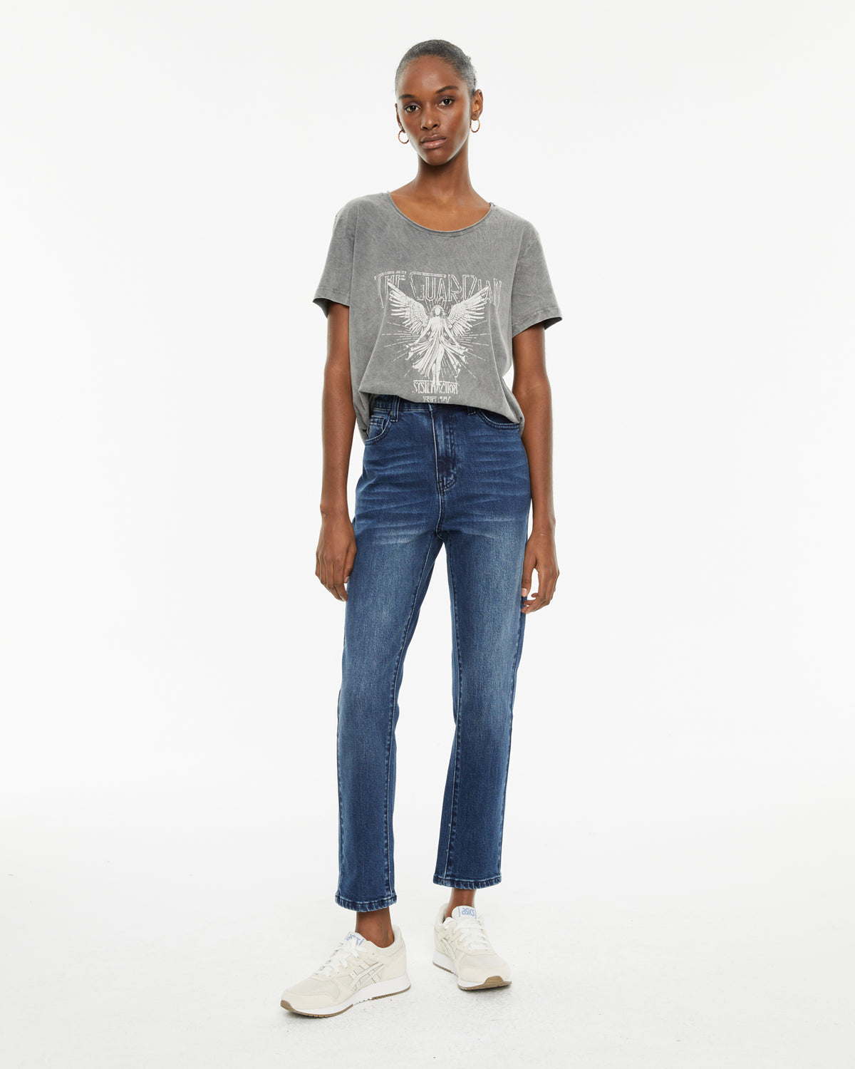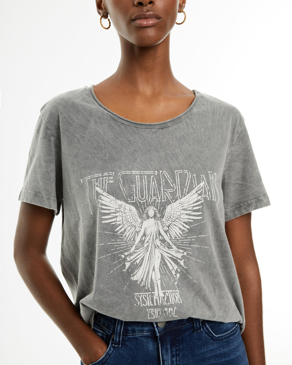 Camiseta de mujer de algodón orgánico de manga corta y cuello redondo con estampado de ángel y texto. Tinte especial efecto desgastado. Prenda sostenible.
