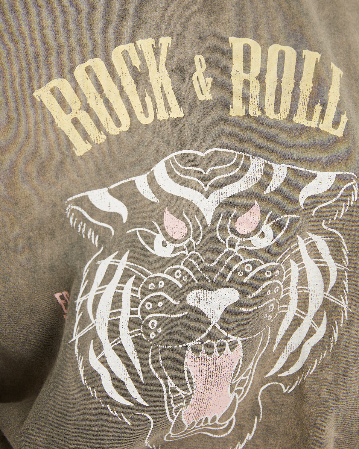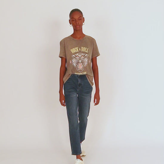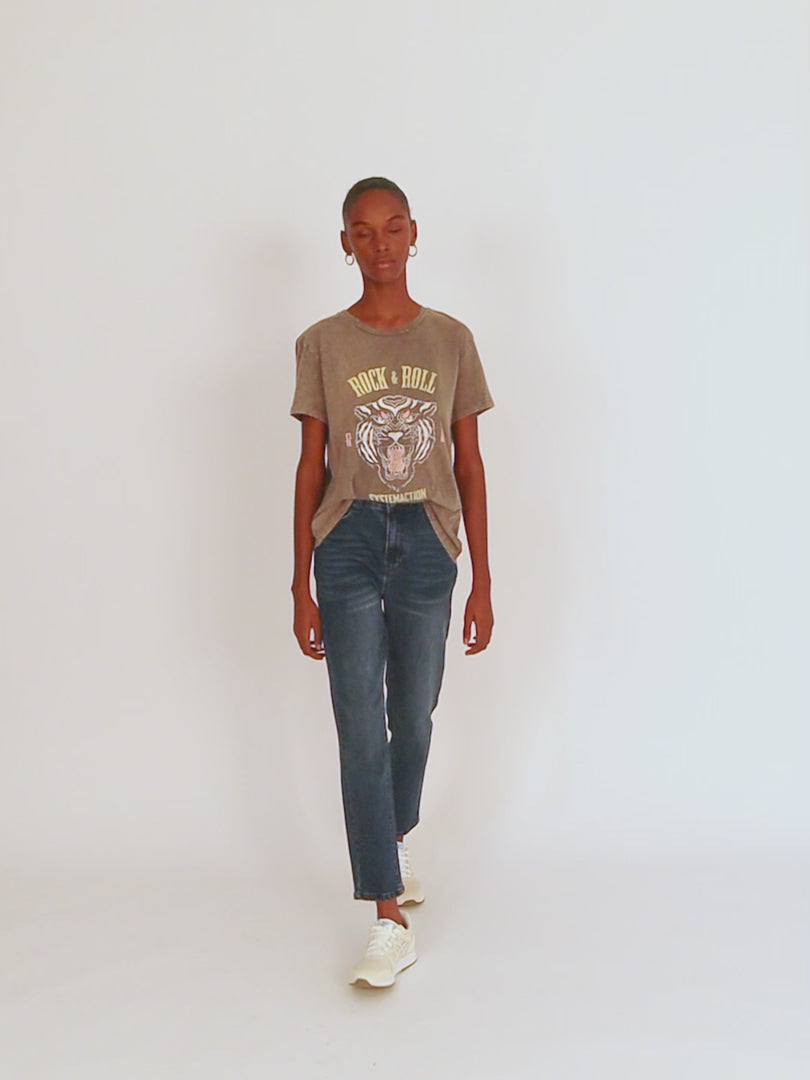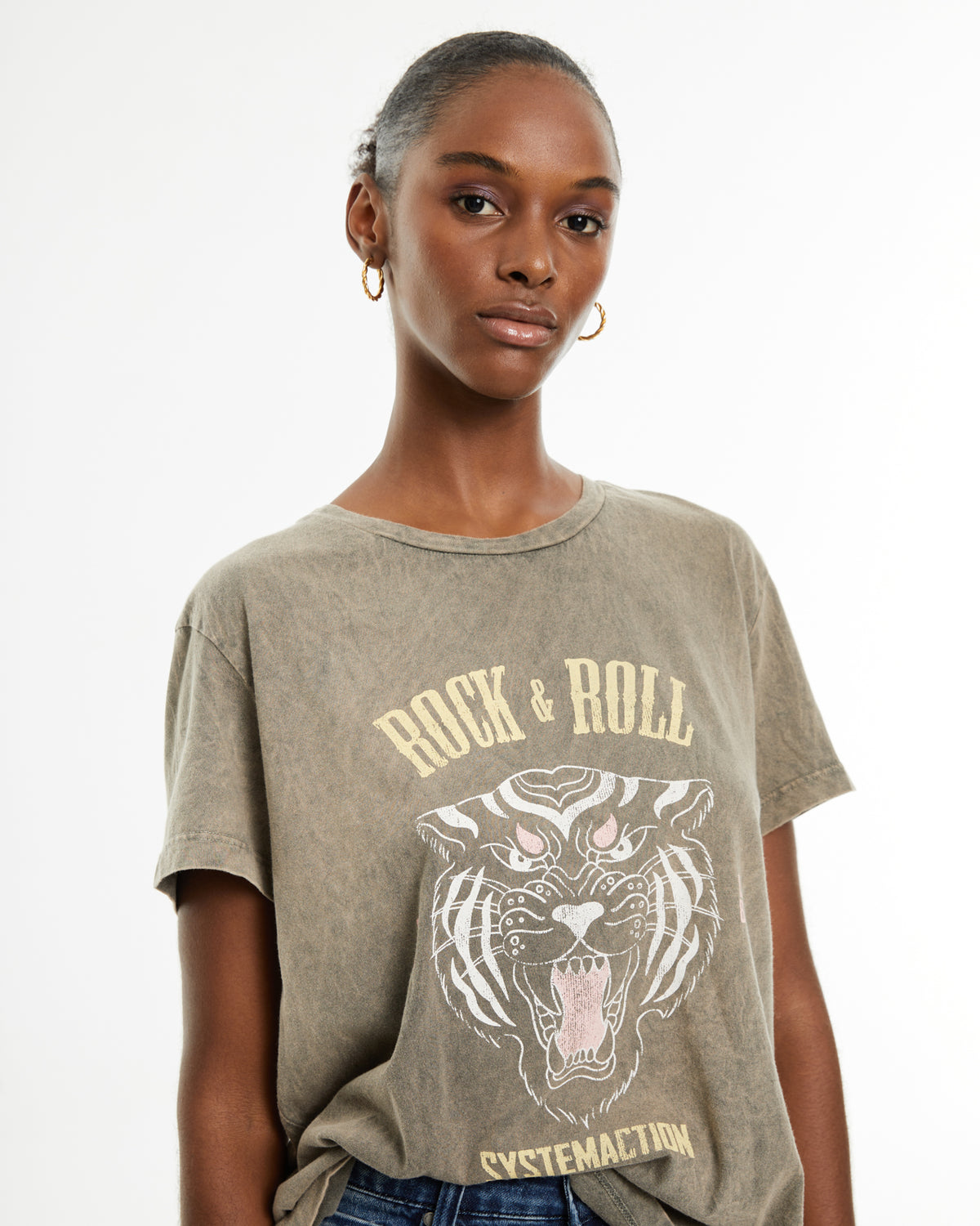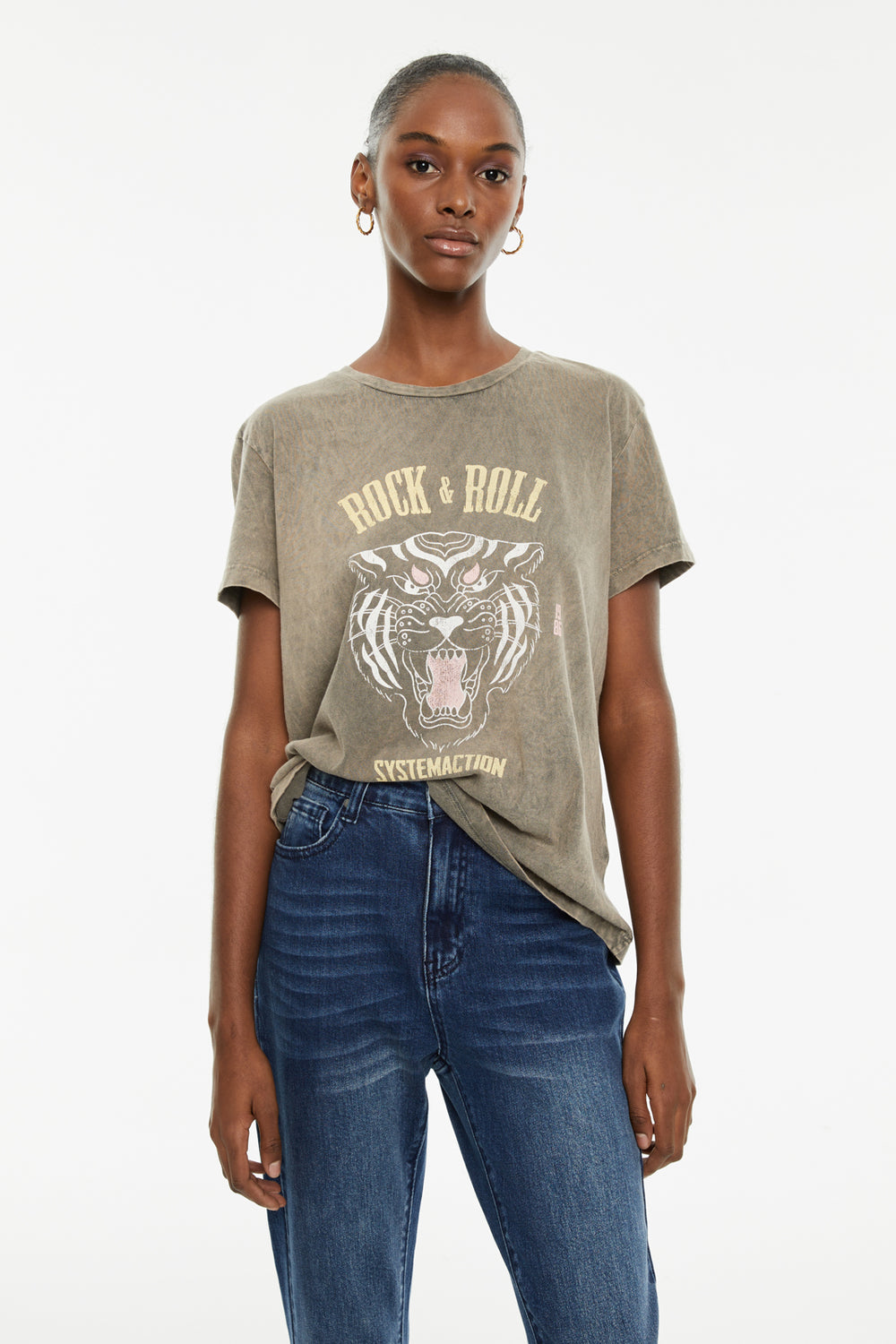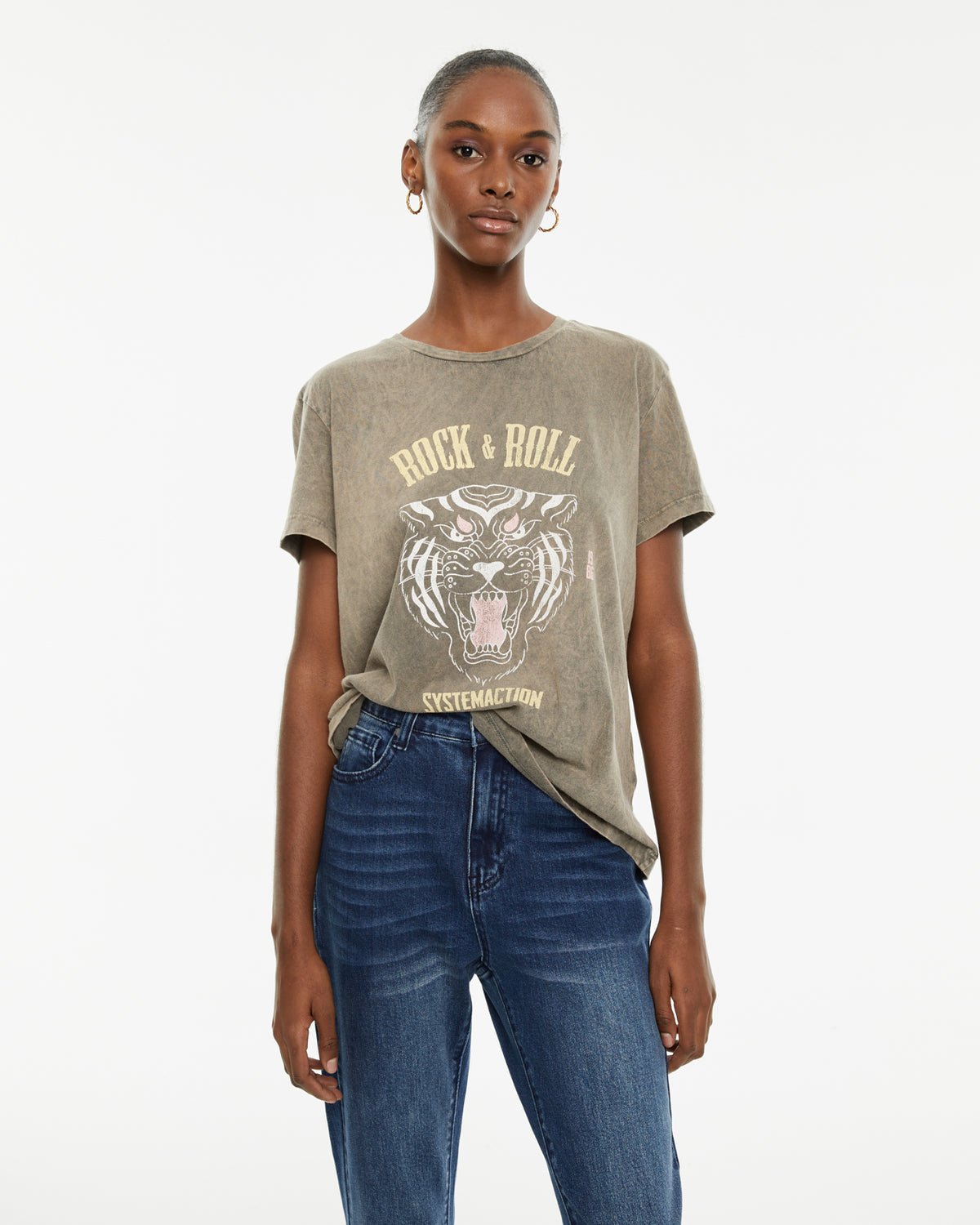 Camiseta de mujer de algodón orgánico de manga corta y cuello redondo con estampado de un tigre y texto. Tinte especial efecto desgastado. Prenda sostenible.