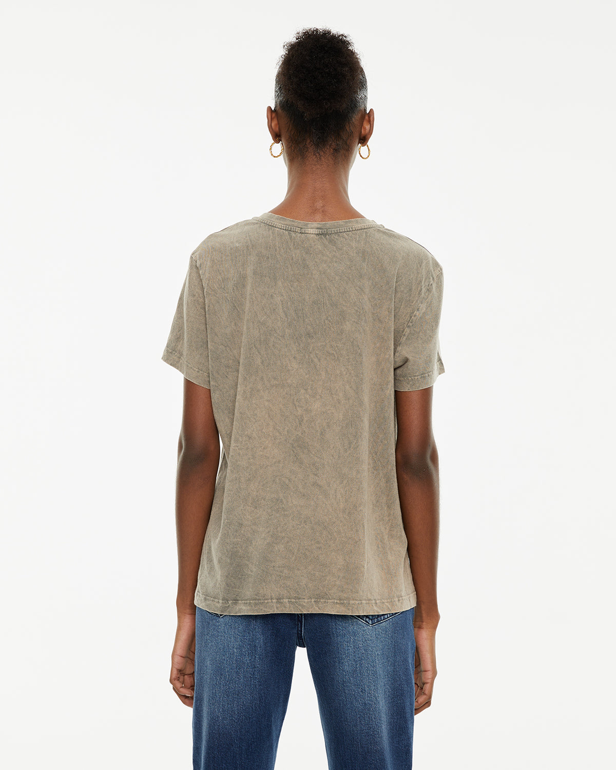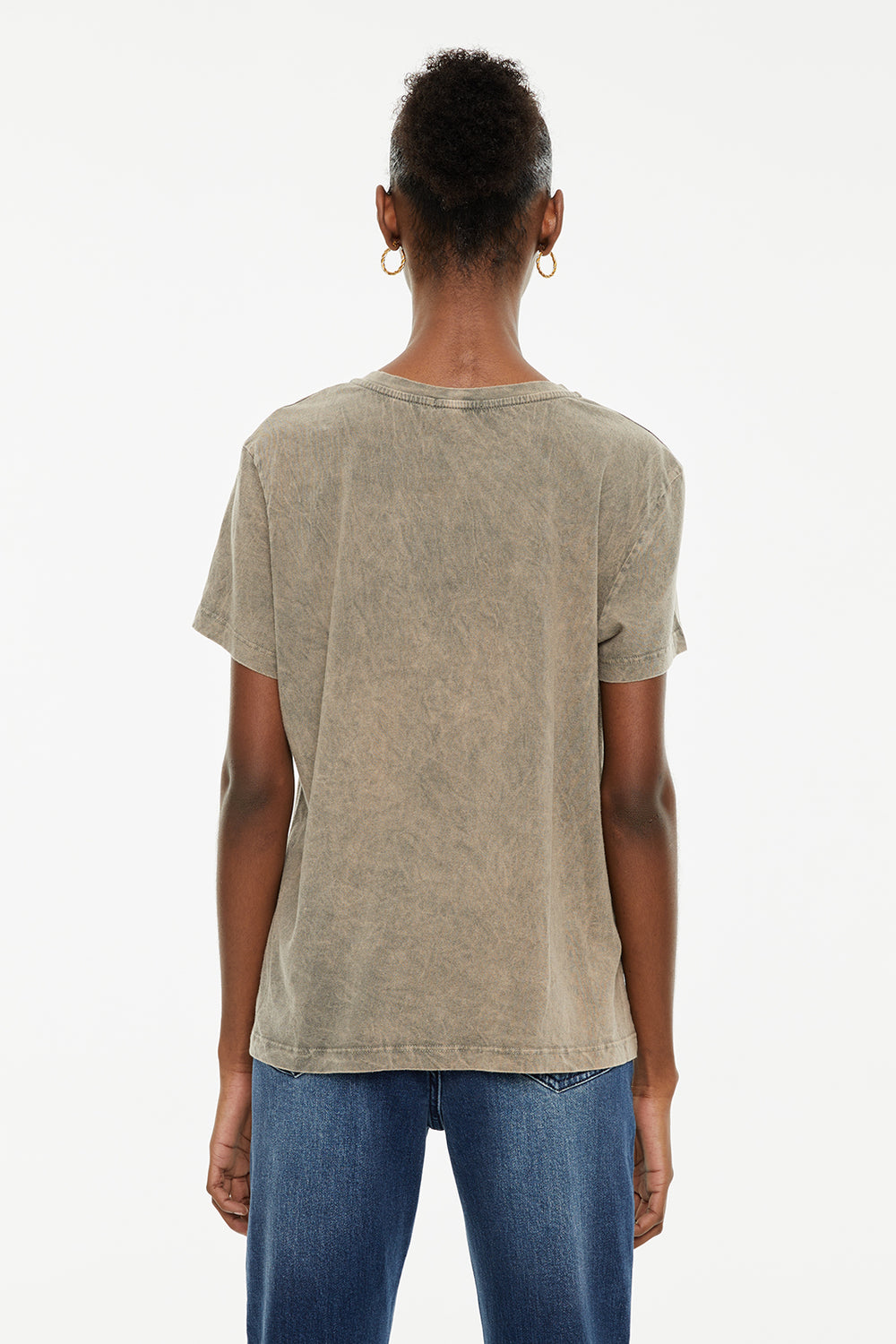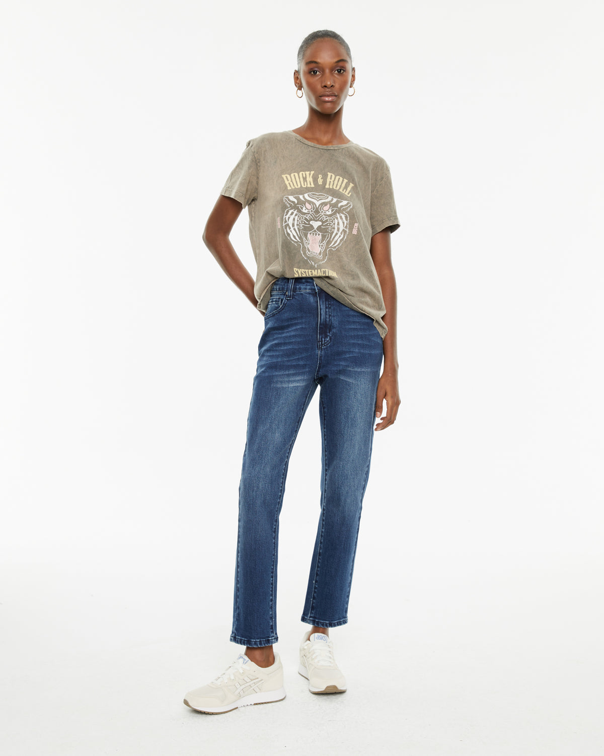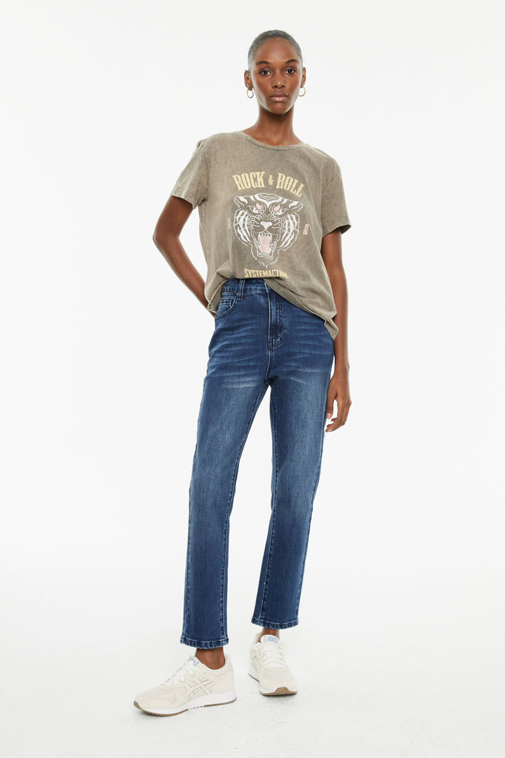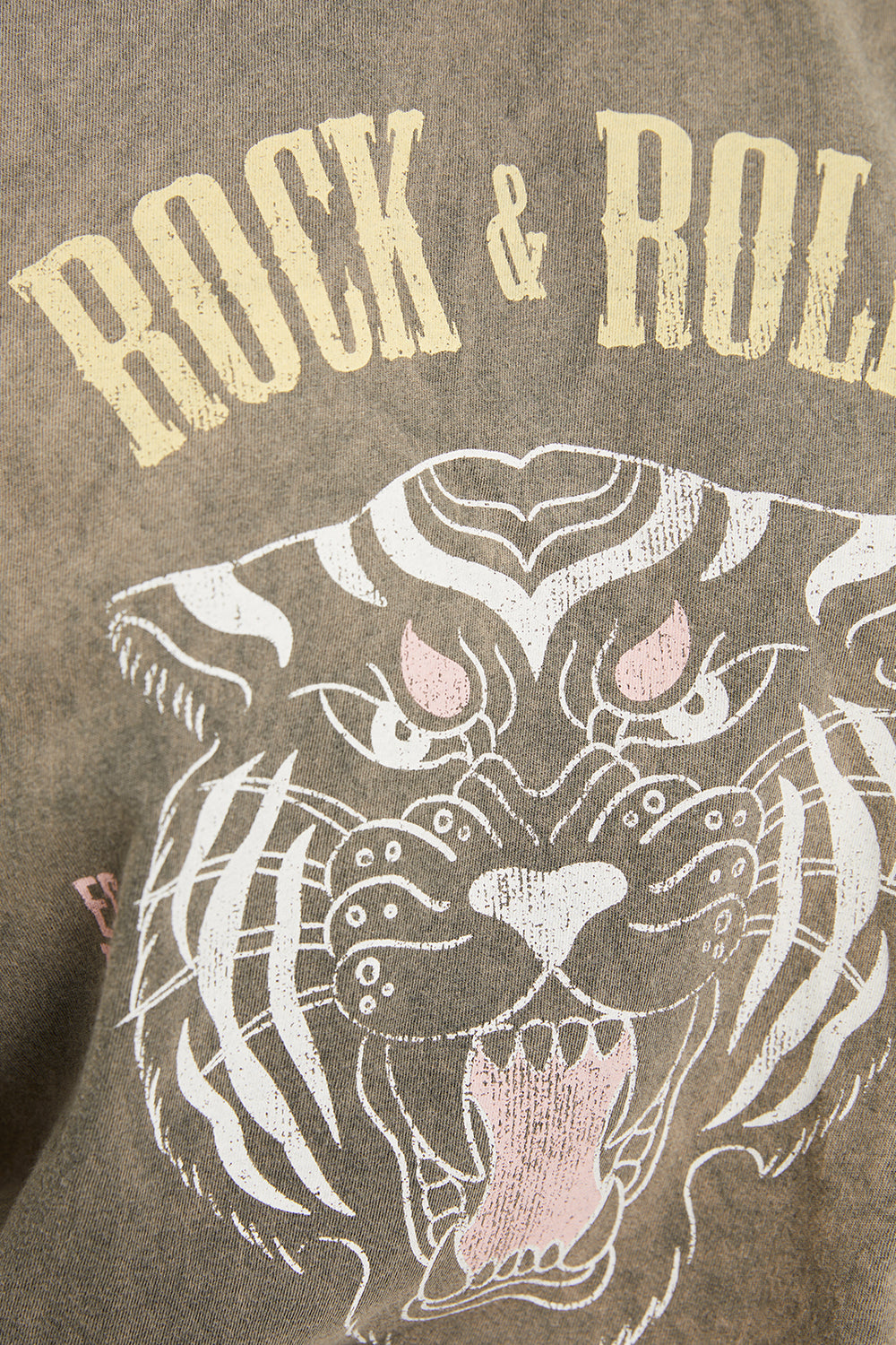 Camiseta de mujer de algodón orgánico de manga corta y cuello redondo con estampado de un tigre y texto. Tinte especial efecto desgastado. Prenda sostenible.