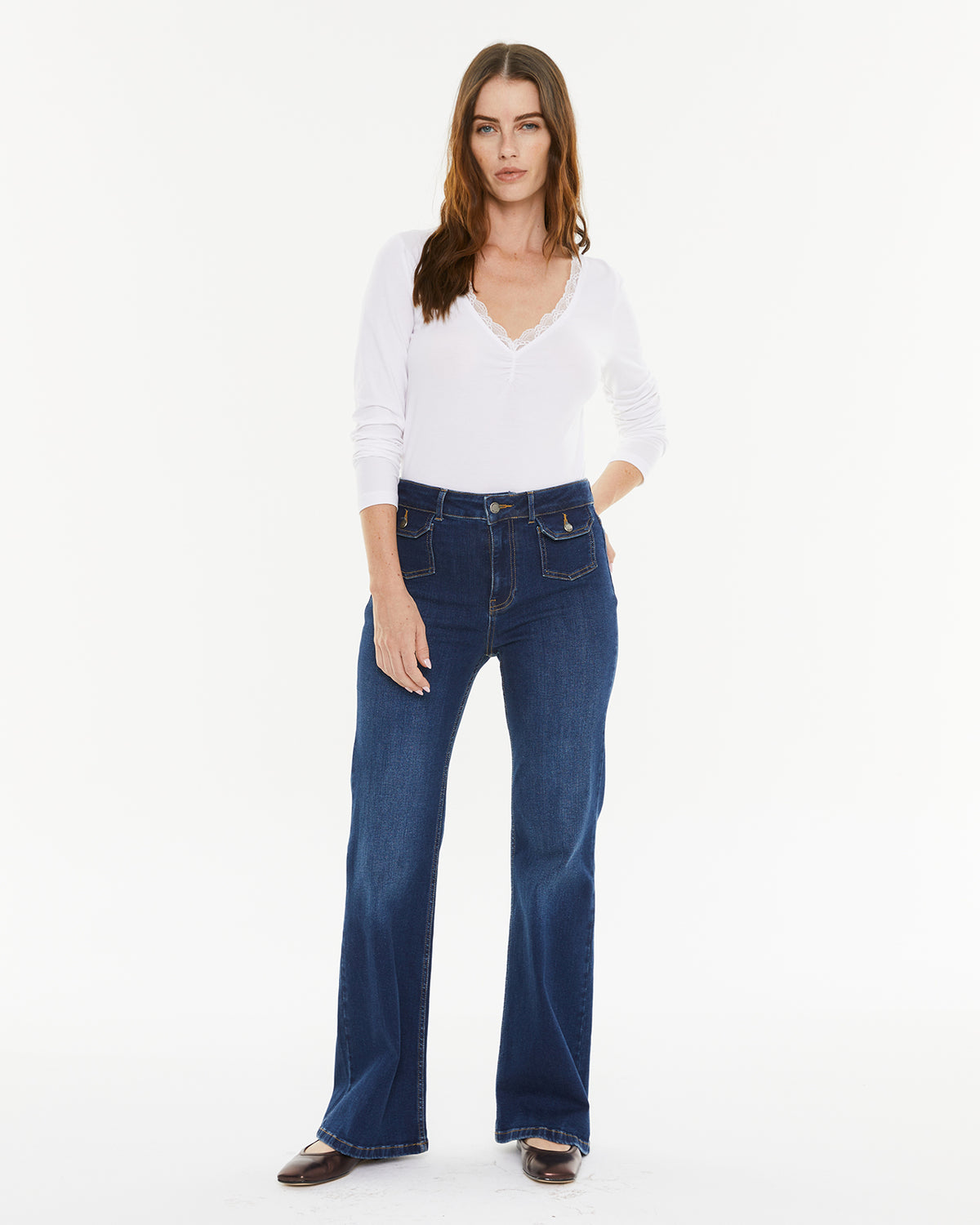 Camiseta básica de mujer, con puntilla en el escote y manga larga. Prenda sostenible.