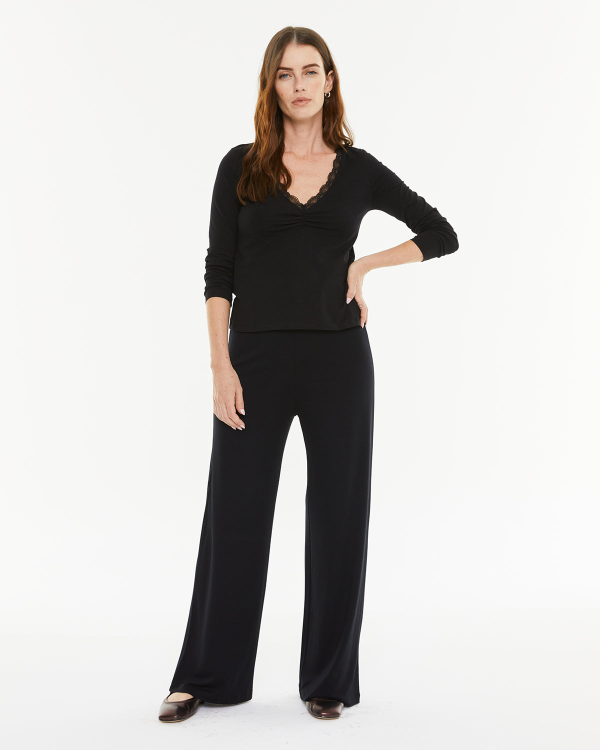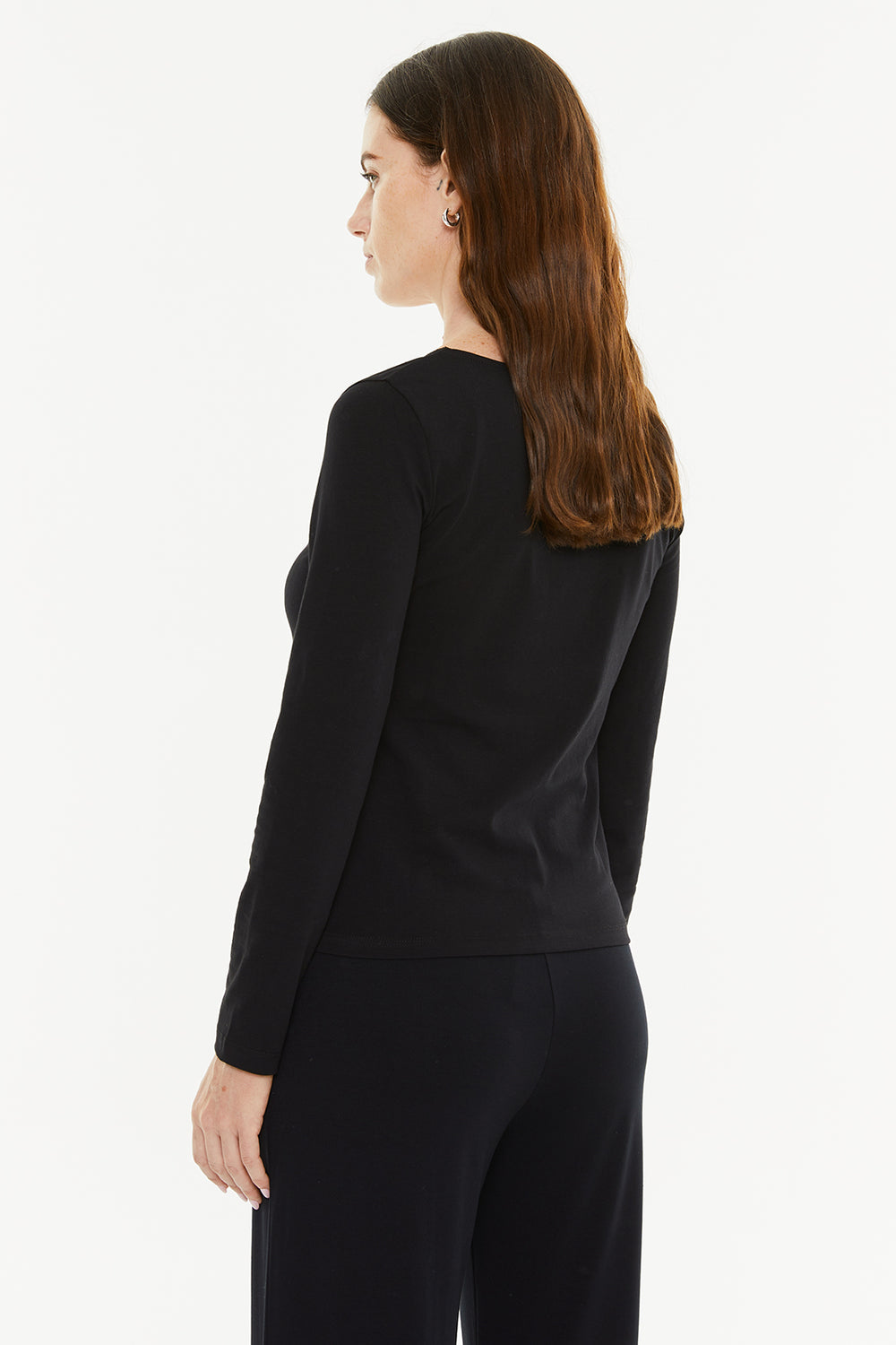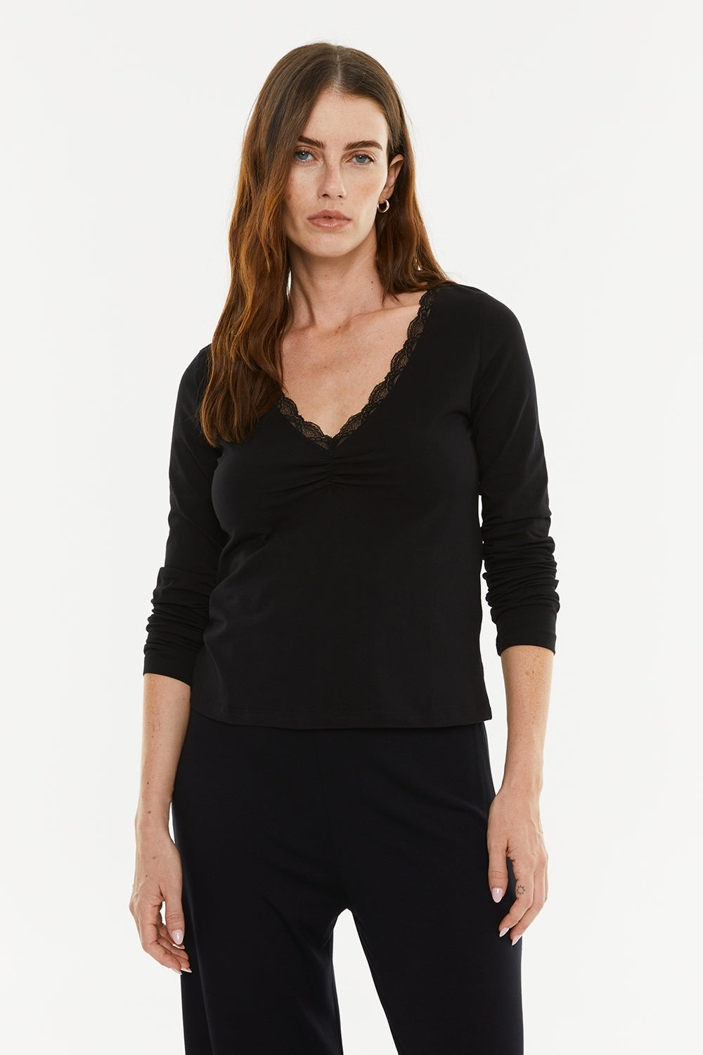 Camiseta básica de mujer, con puntilla en el escote y manga larga. Prenda sostenible.
