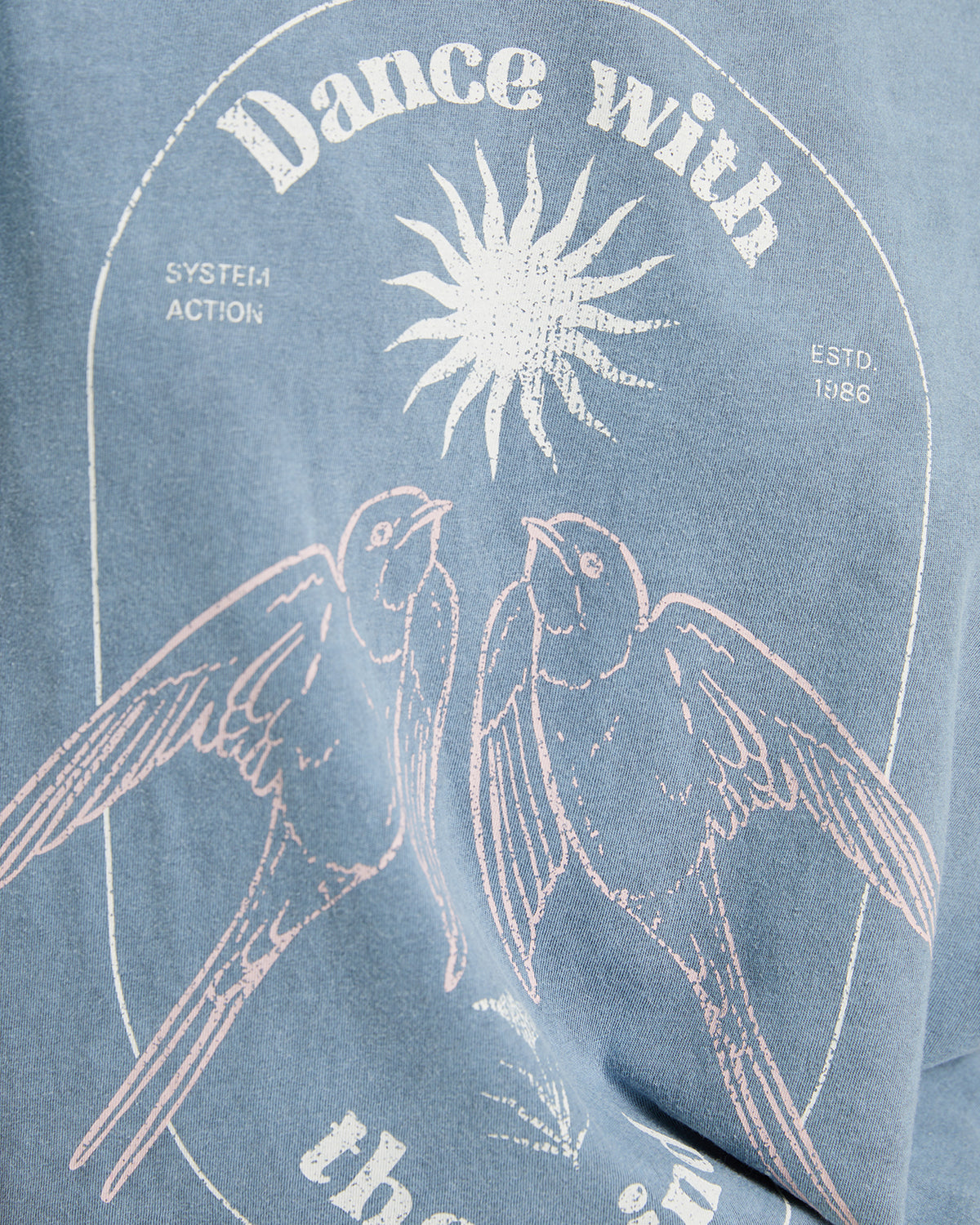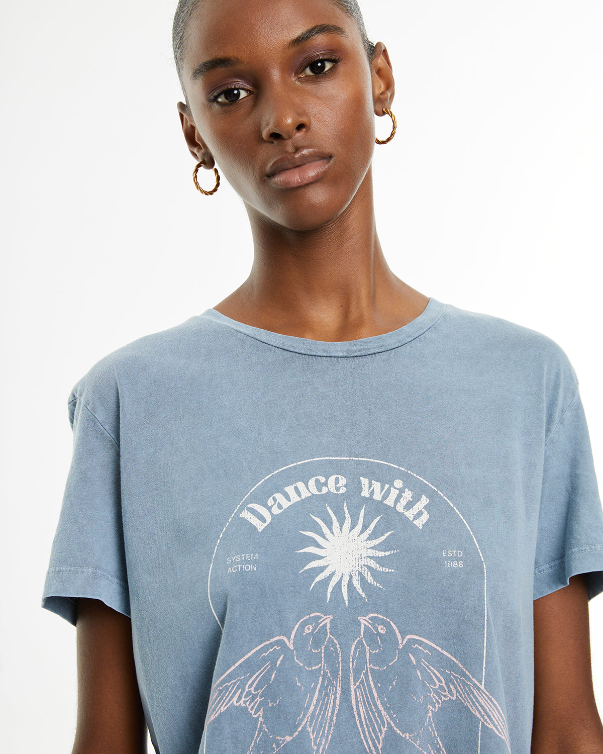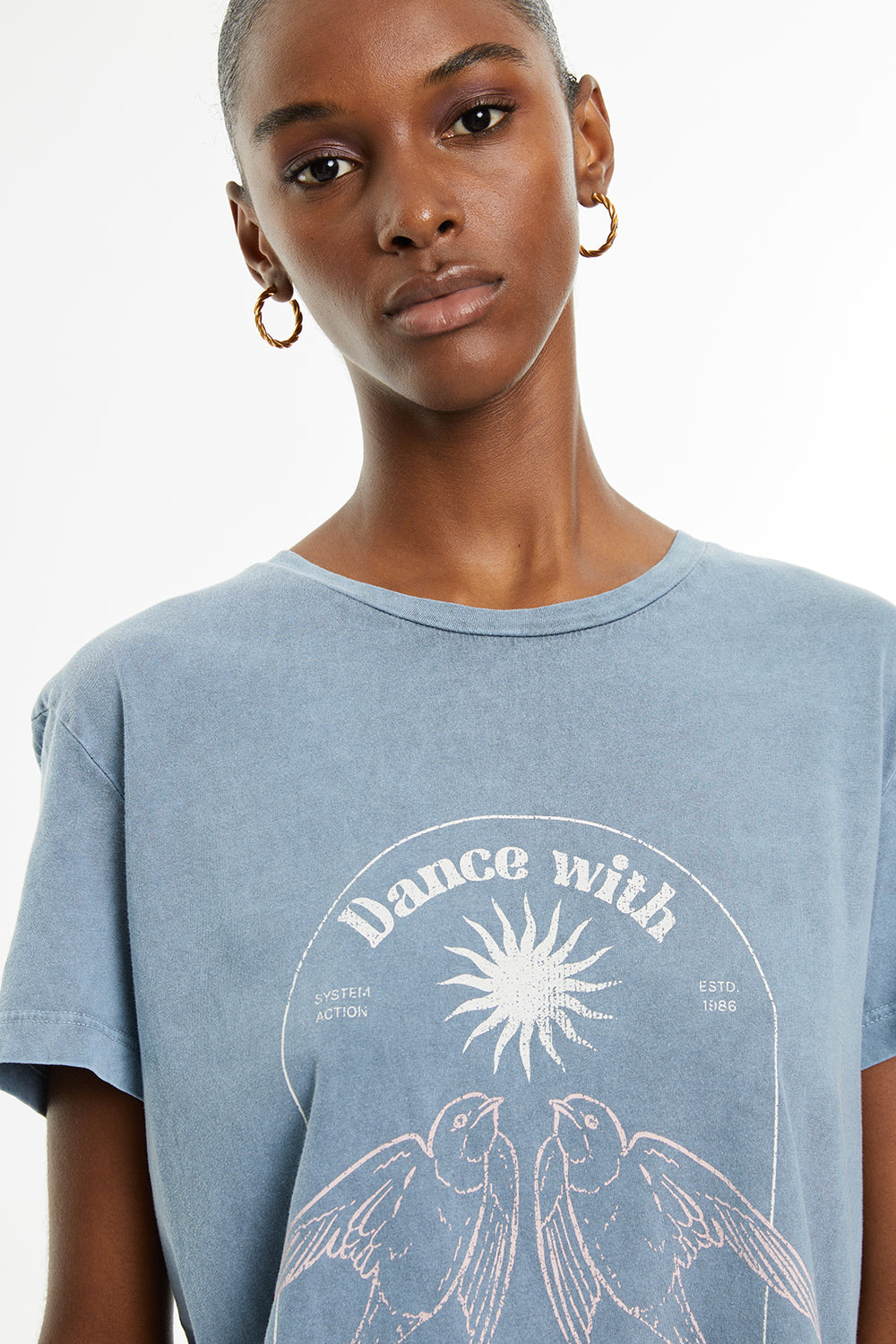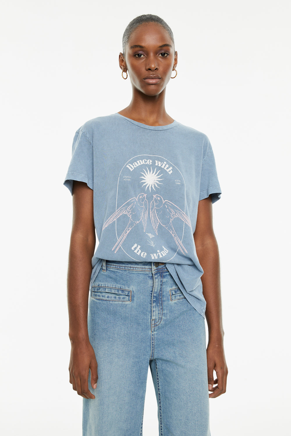 Camiseta de mujer de algodón orgánico de manga corta y cuello redondo con estampado de golondrinas y texto. Tinte especial efecto desgastado. Prenda sostenible.