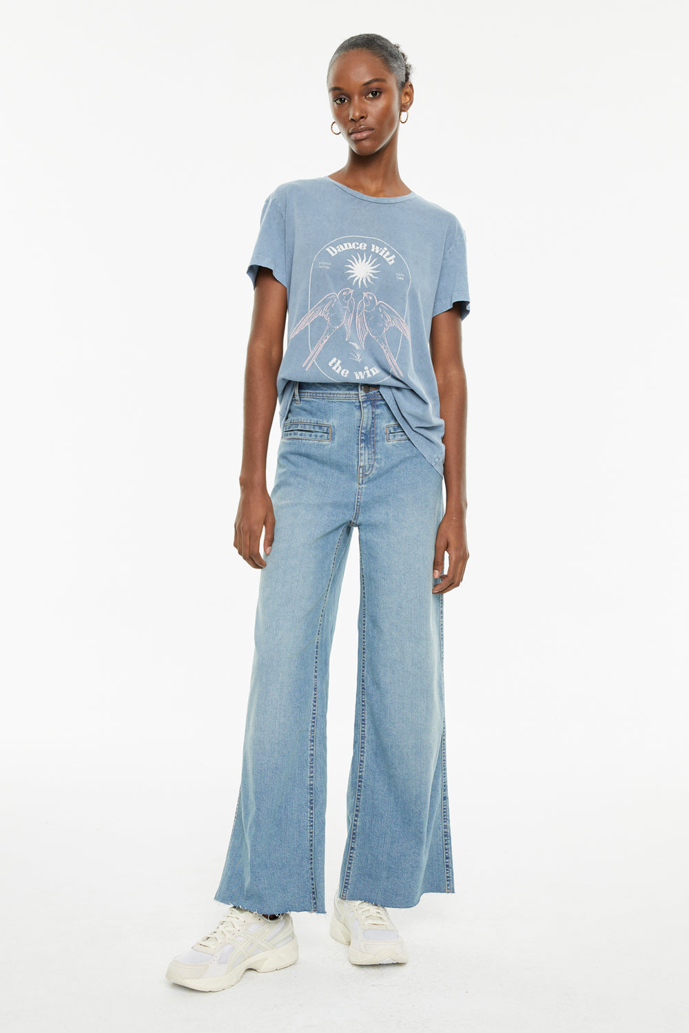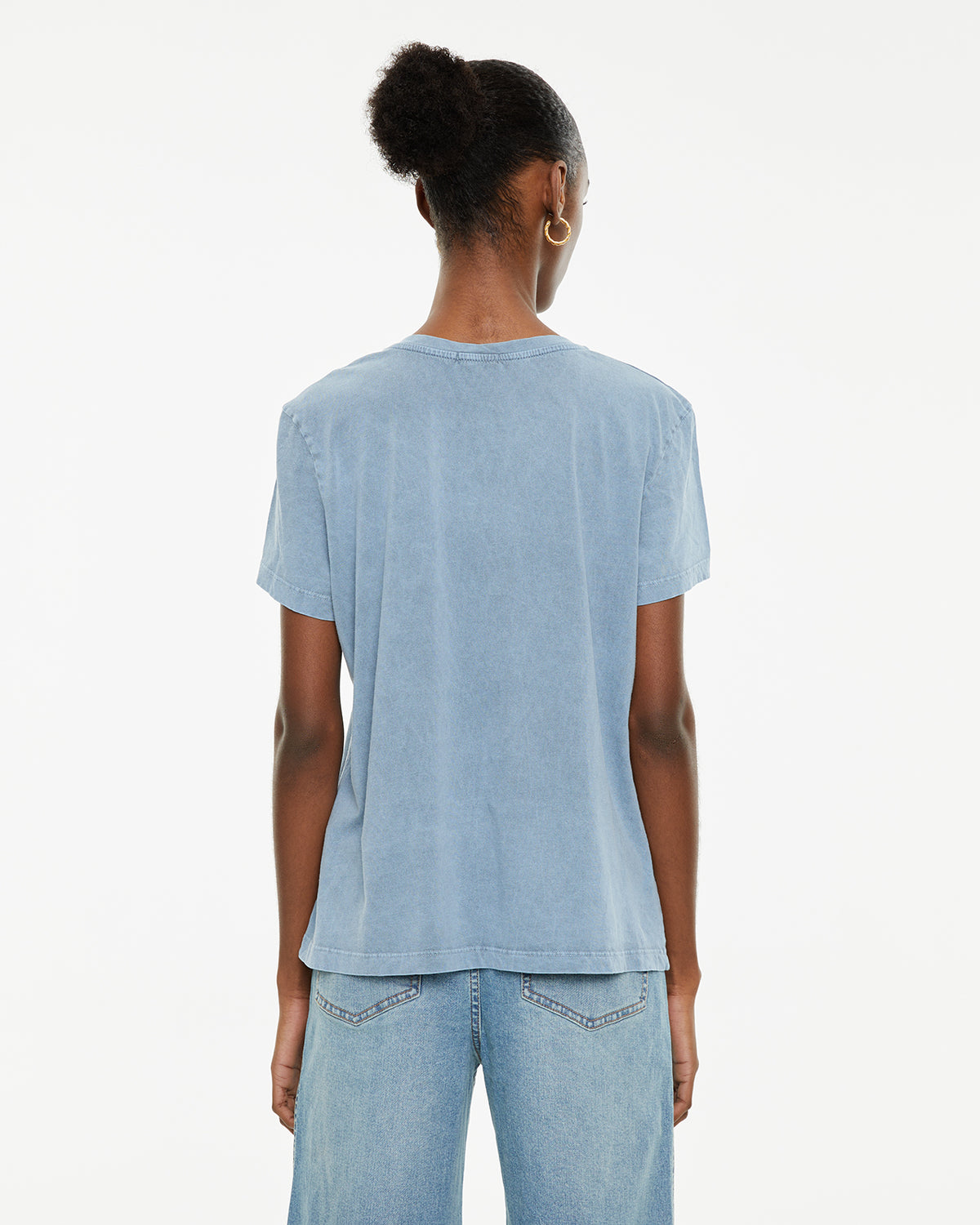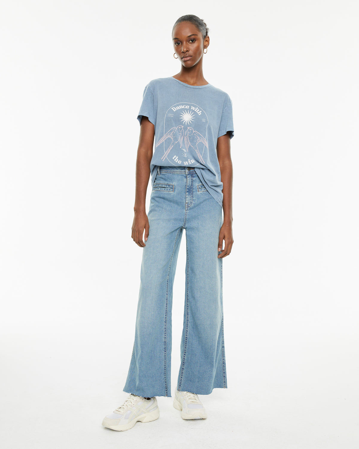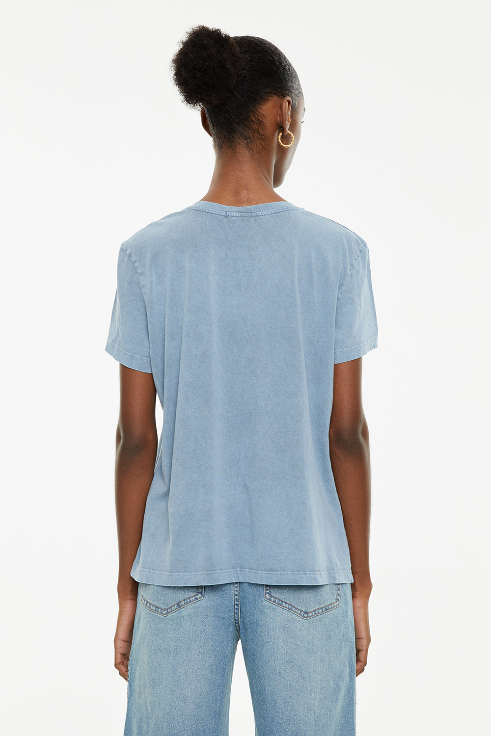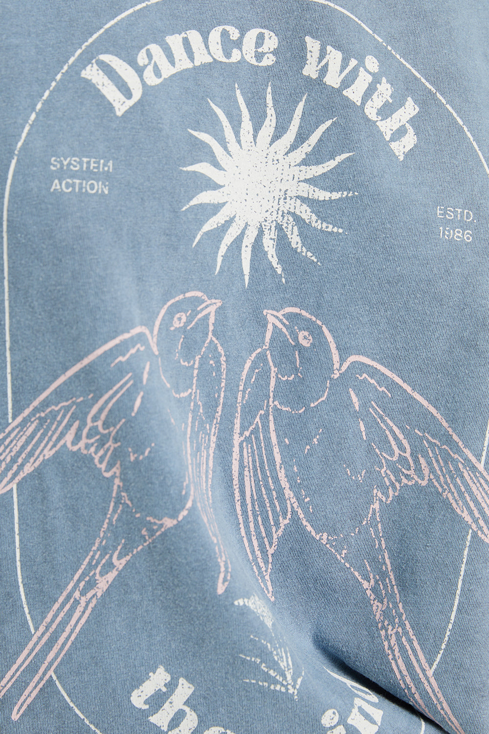 Camiseta de mujer de algodón orgánico de manga corta y cuello redondo con estampado de golondrinas y texto. Tinte especial efecto desgastado. Prenda sostenible.