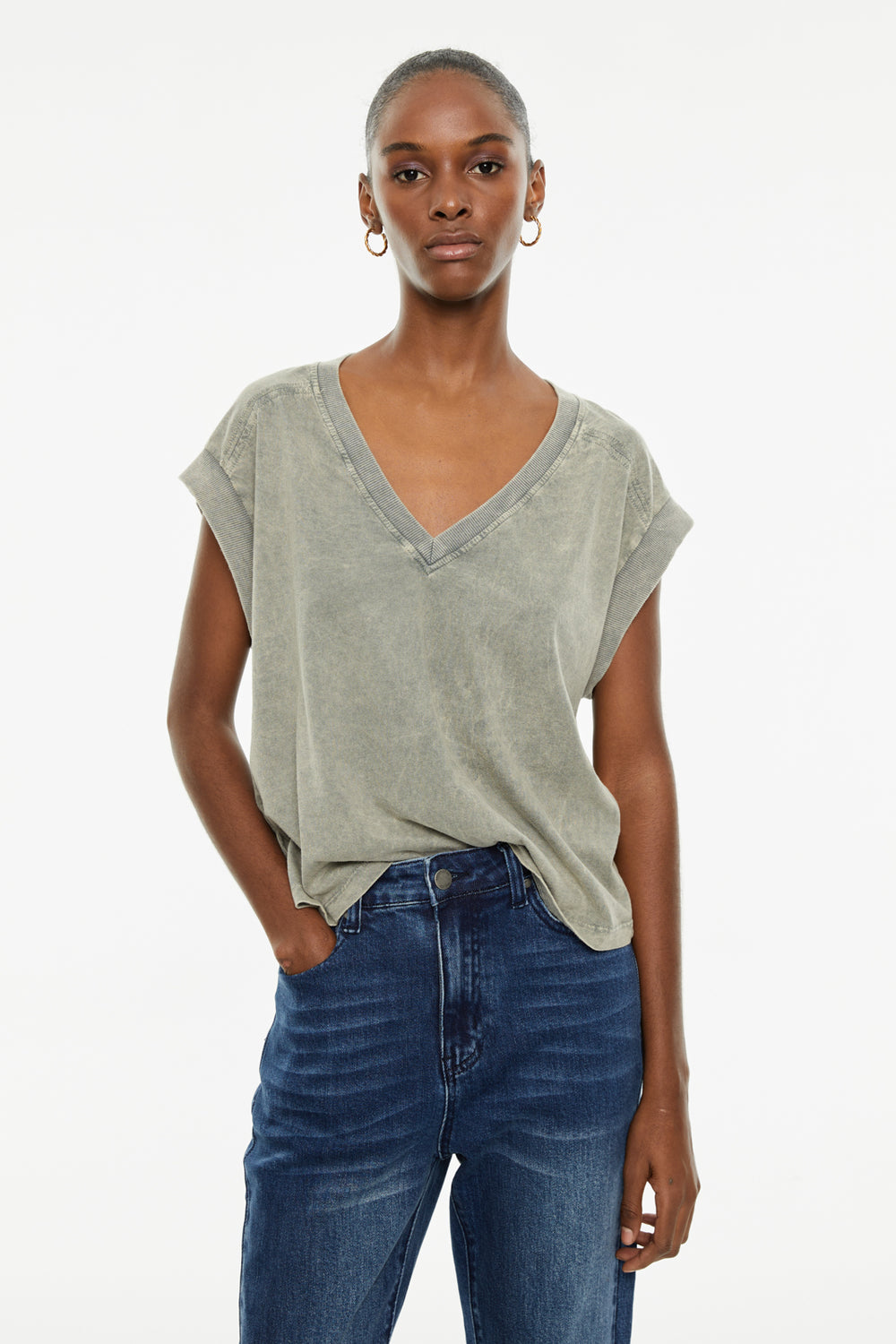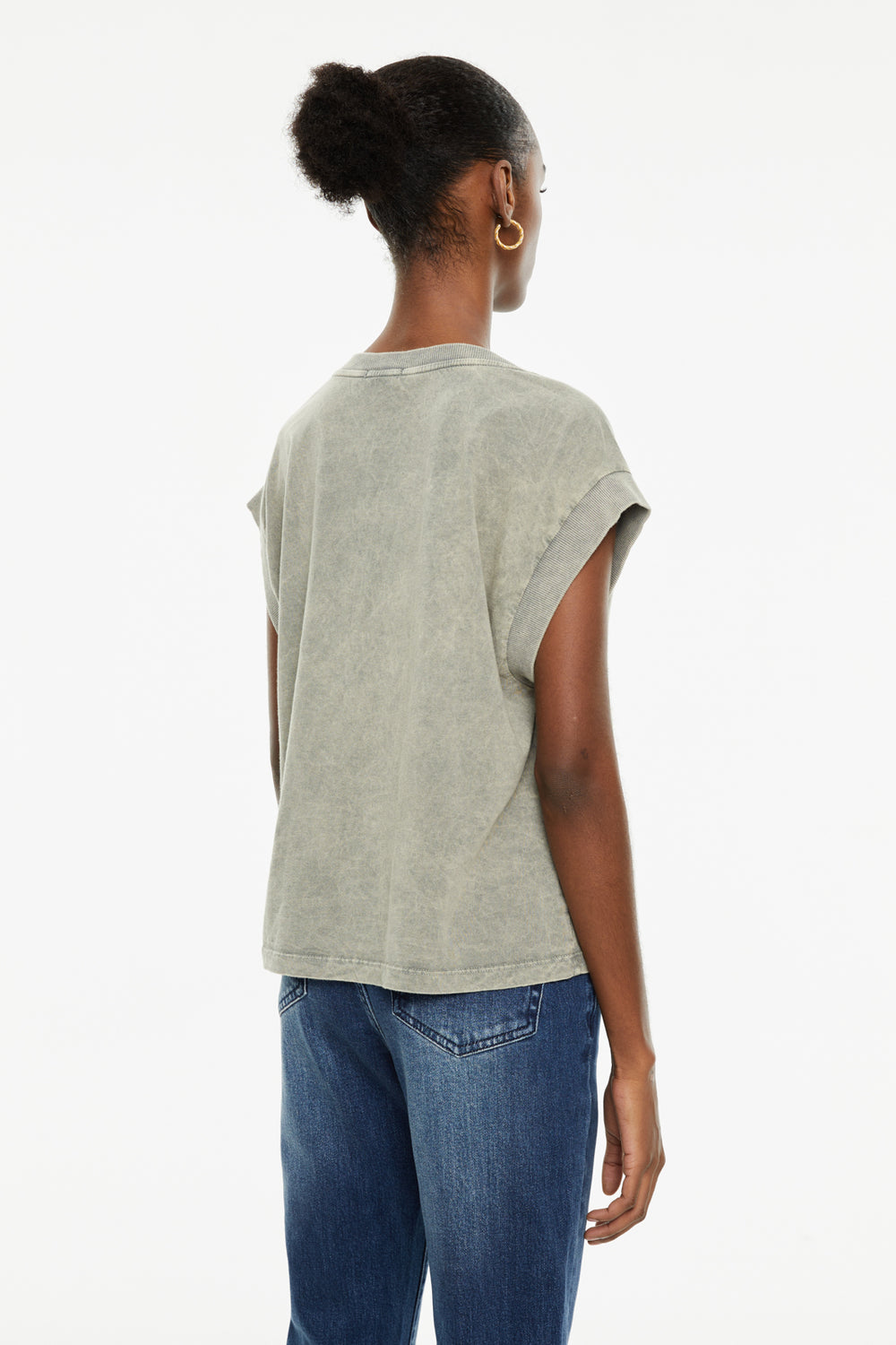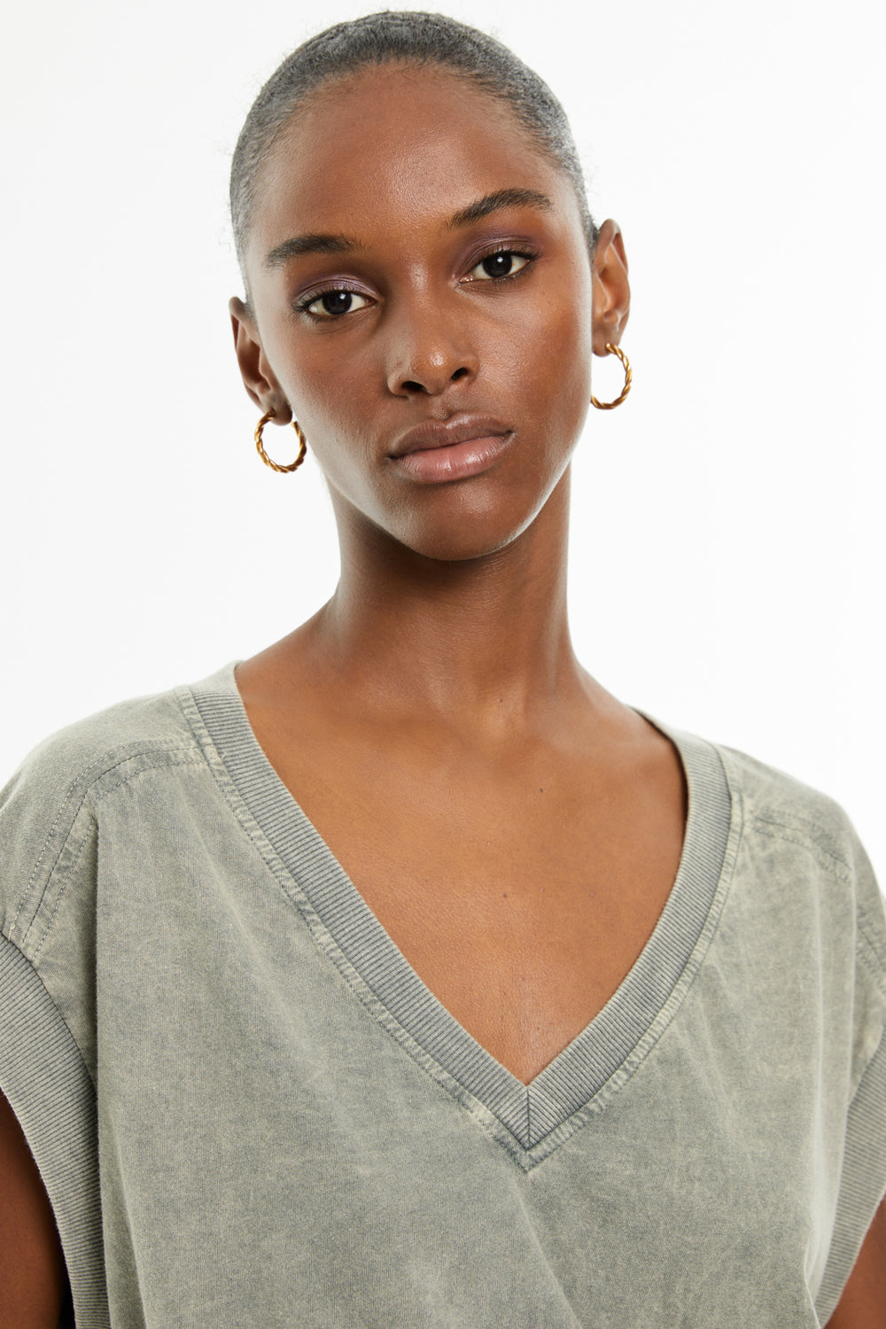 Camiseta de mujer de algodón orgánico de sin mangas y cuello pico con costuras hombros . Tinte especial efecto desgastado. Prenda sostenible.