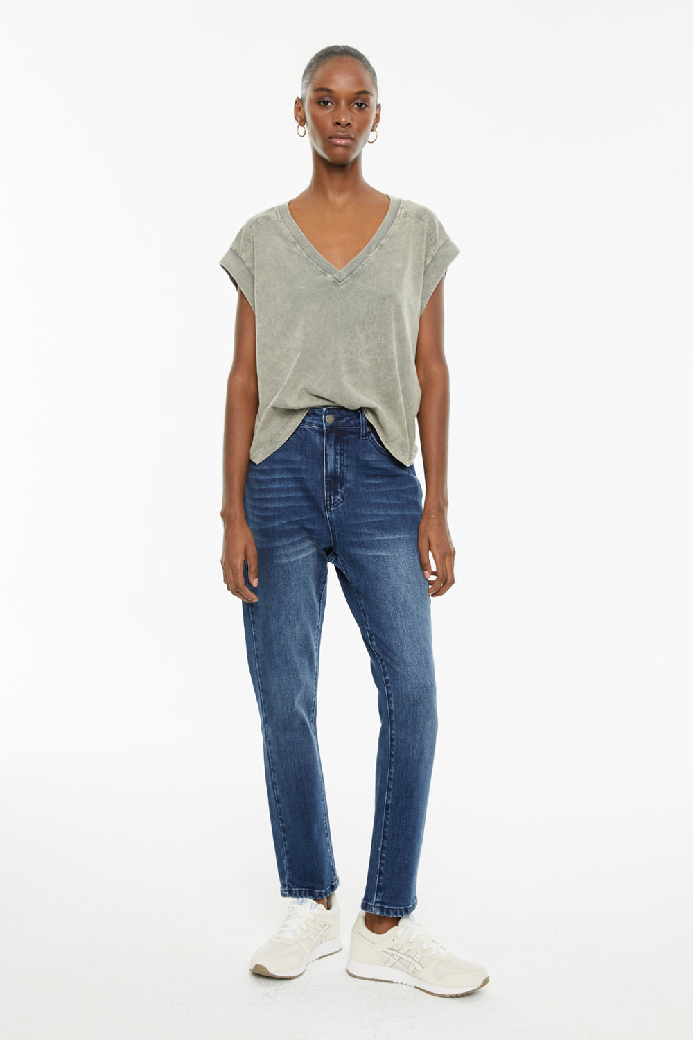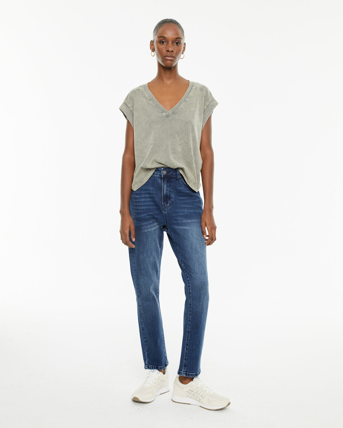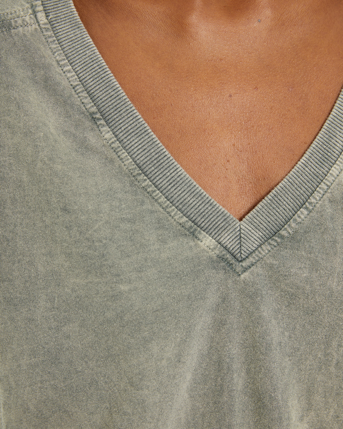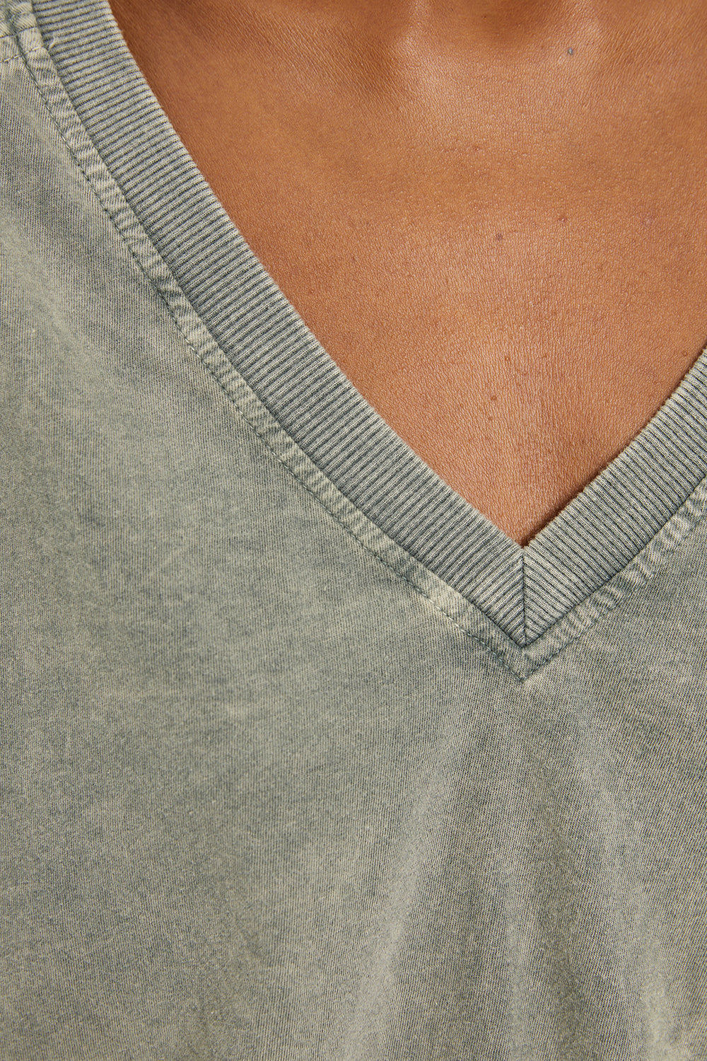 Camiseta de mujer de algodón orgánico de sin mangas y cuello pico con costuras hombros . Tinte especial efecto desgastado. Prenda sostenible.
