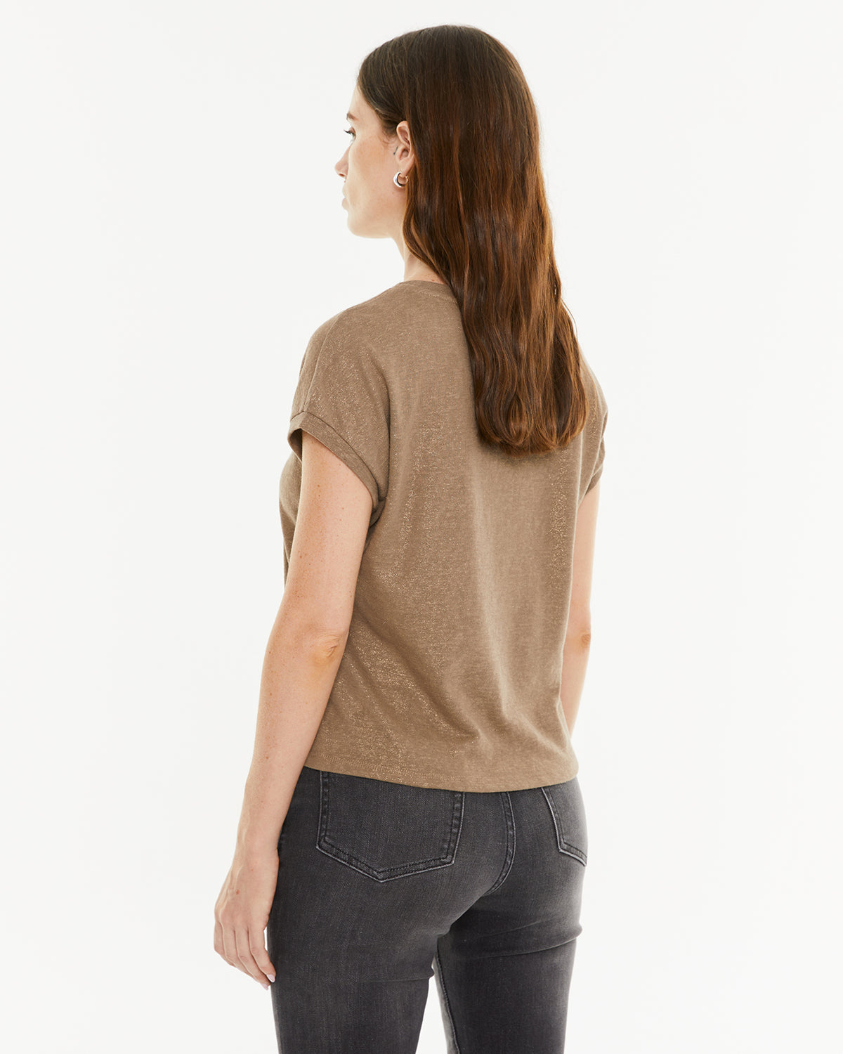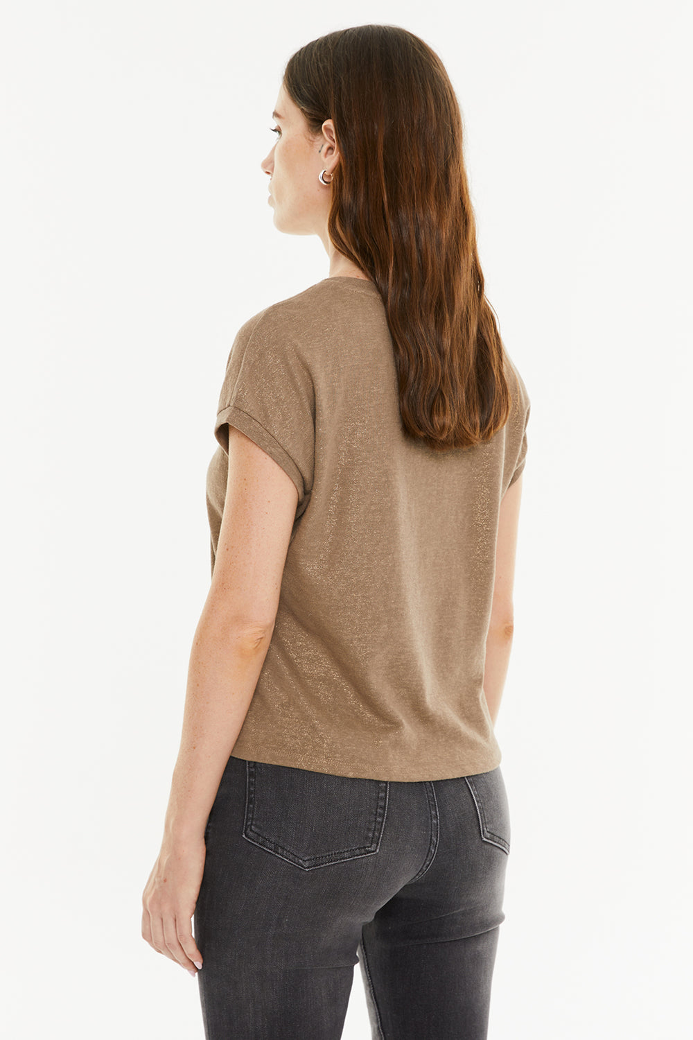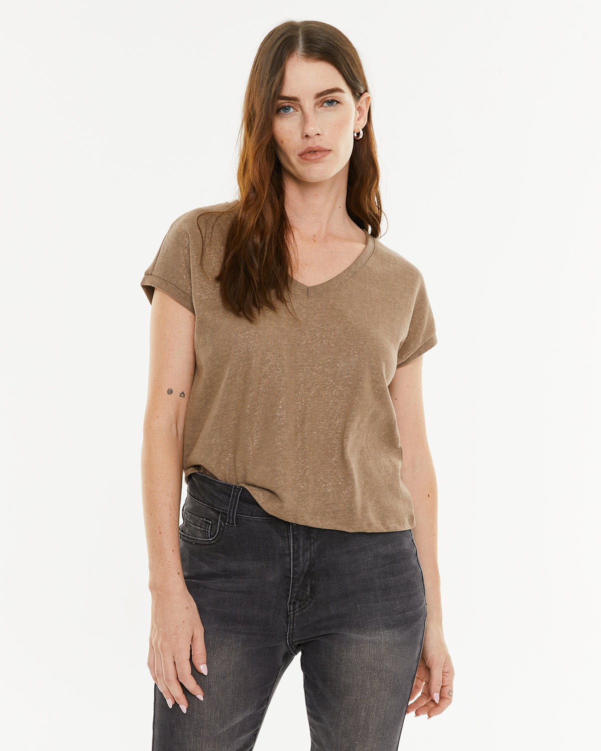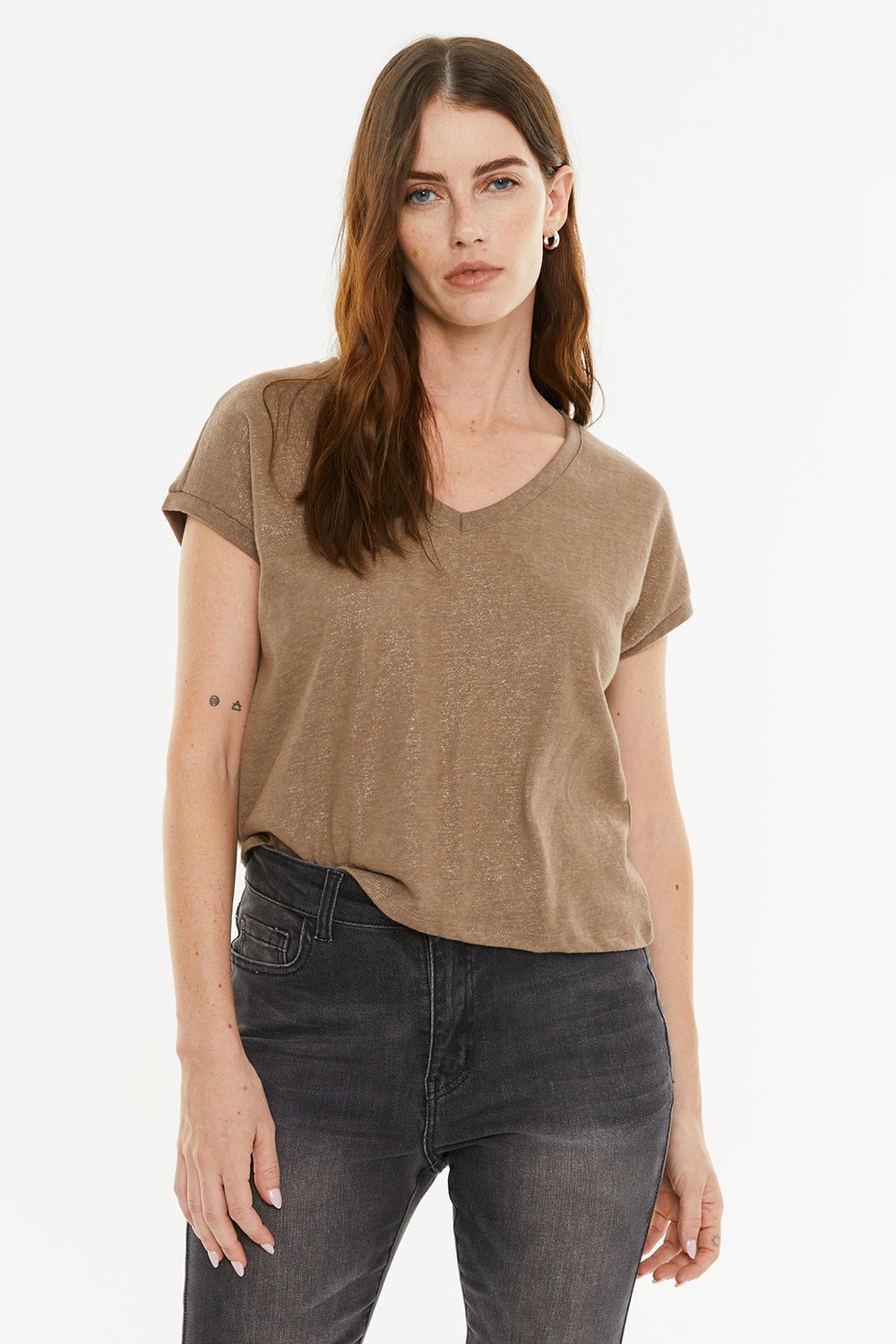 Camiseta de mujer de manga corta y escote pico con detalle de foil.