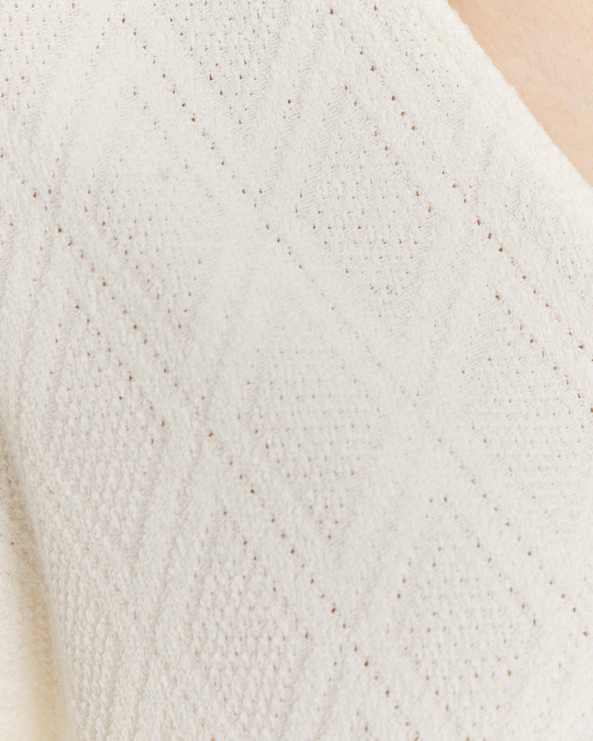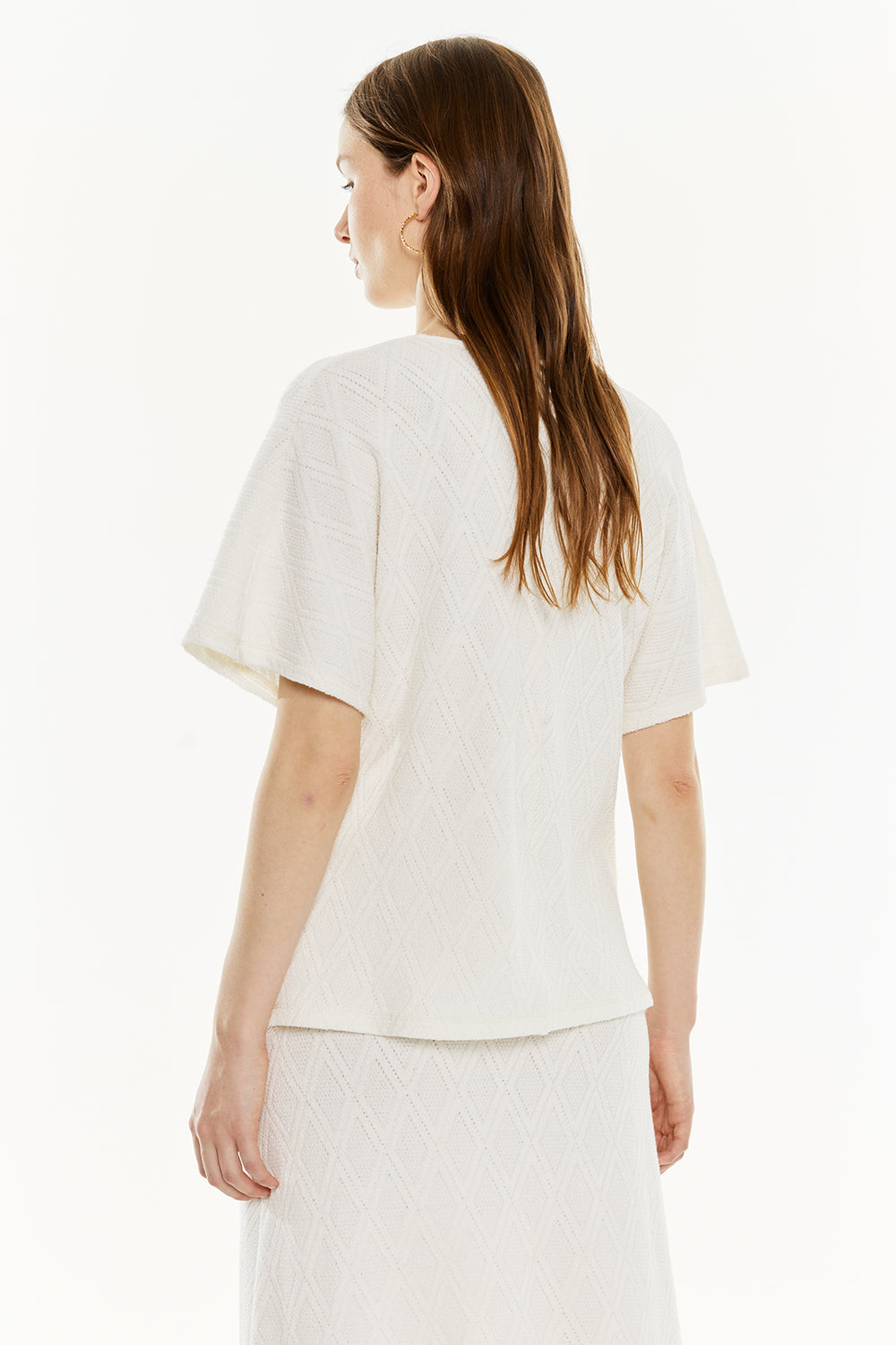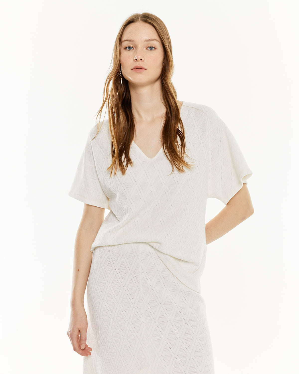 Camiseta de mujer de manga corta, escote en pico y tejido de fantasía. Prenda sostenible.