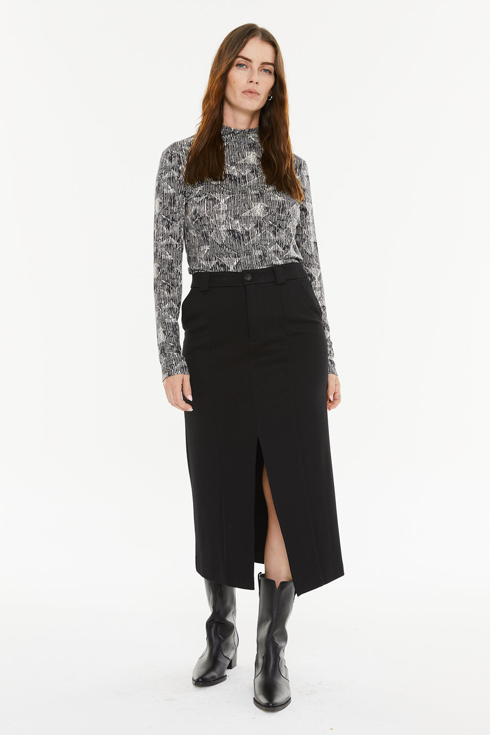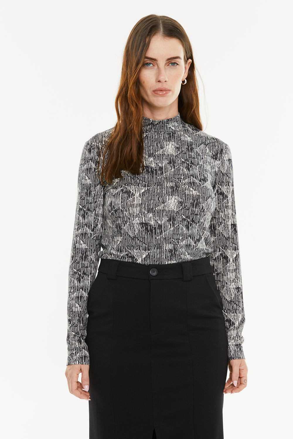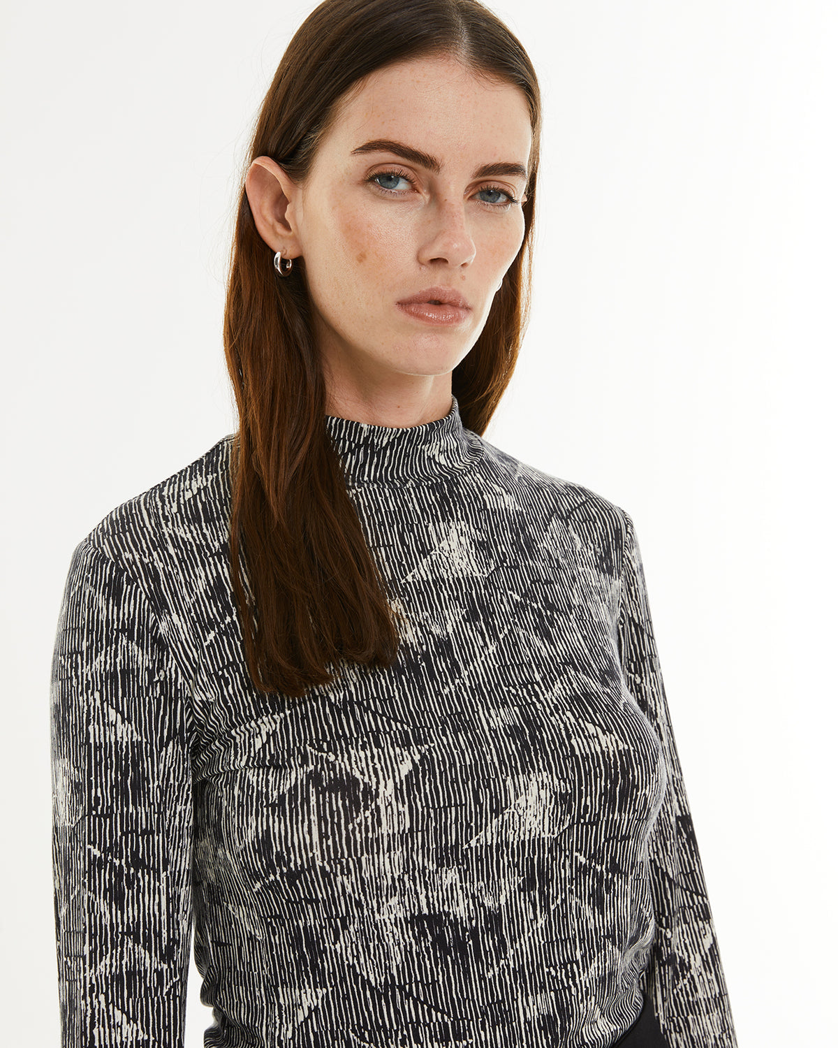 Camiseta de mujer con estampado bicolor y escote Perkins. Prenda sostenible.