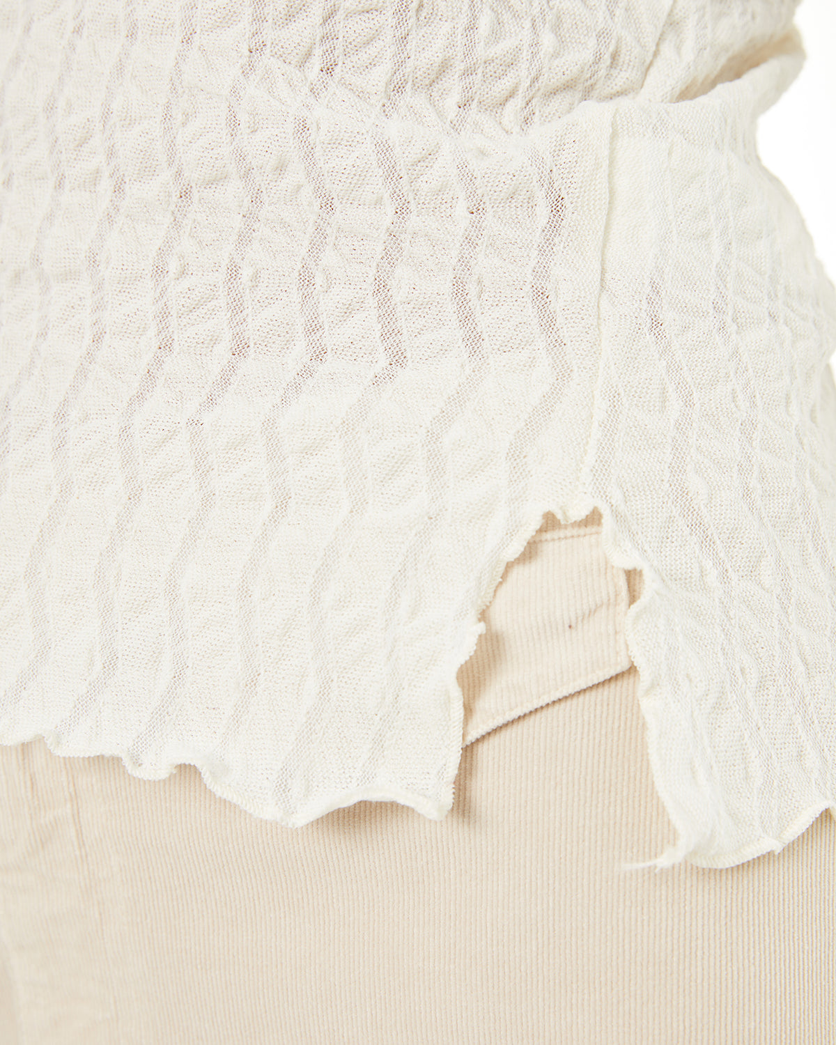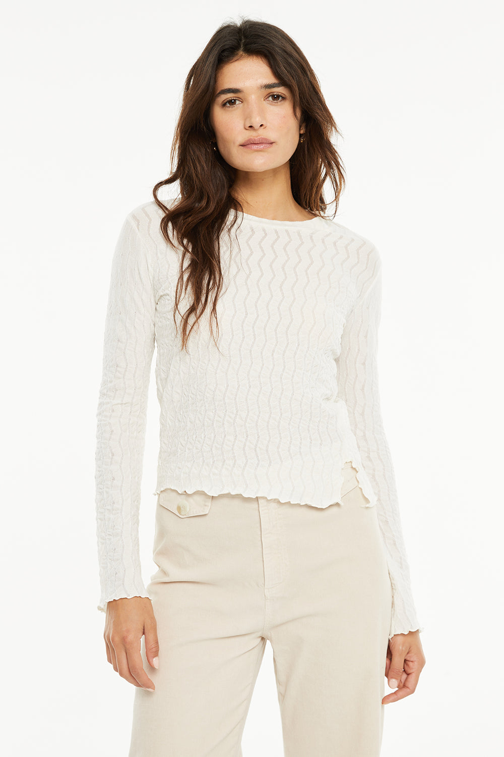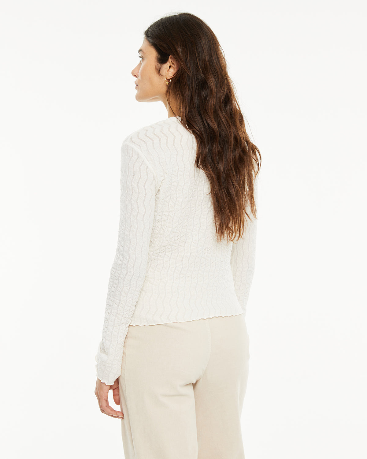Camiseta de mujer de manga larga, con tejido de estructura, escote redondo y detalle de abertura.