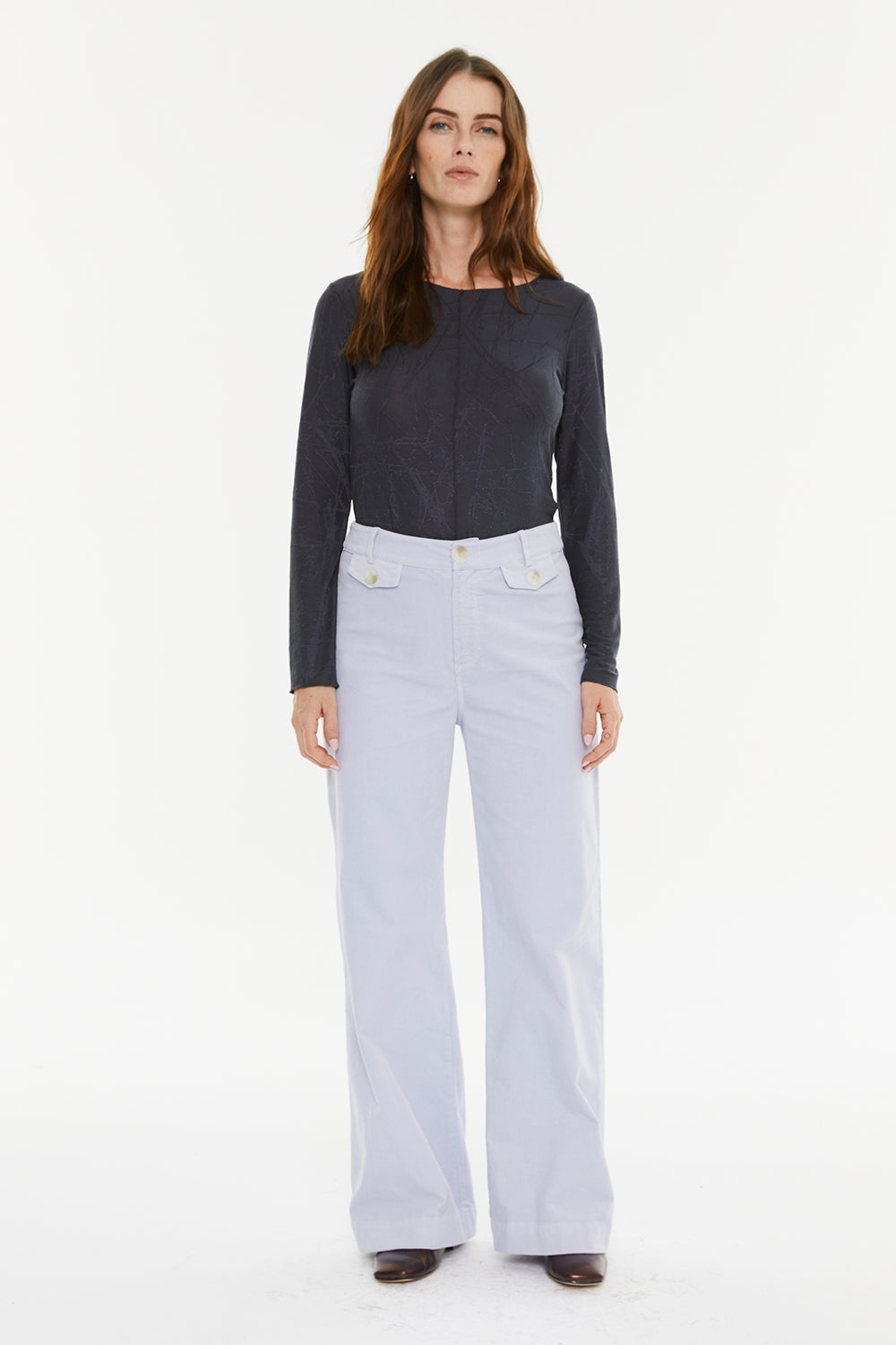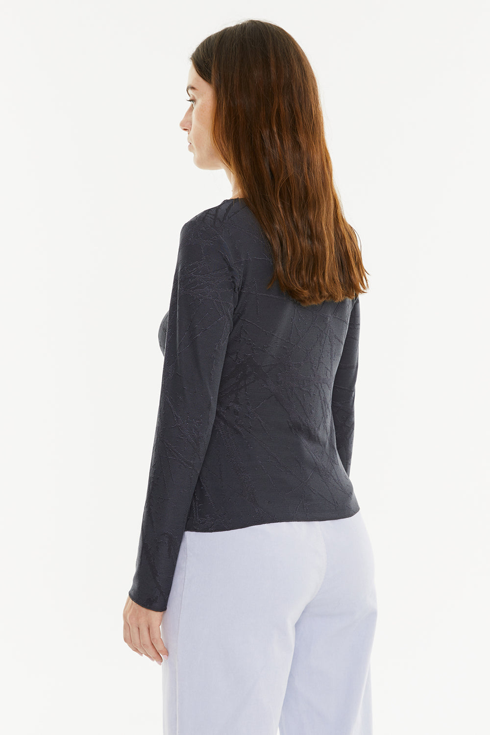 Camiseta de mujer con tejido de jacquard, escote redondo, manga larga y detalle de mini repulgo en los acabados.