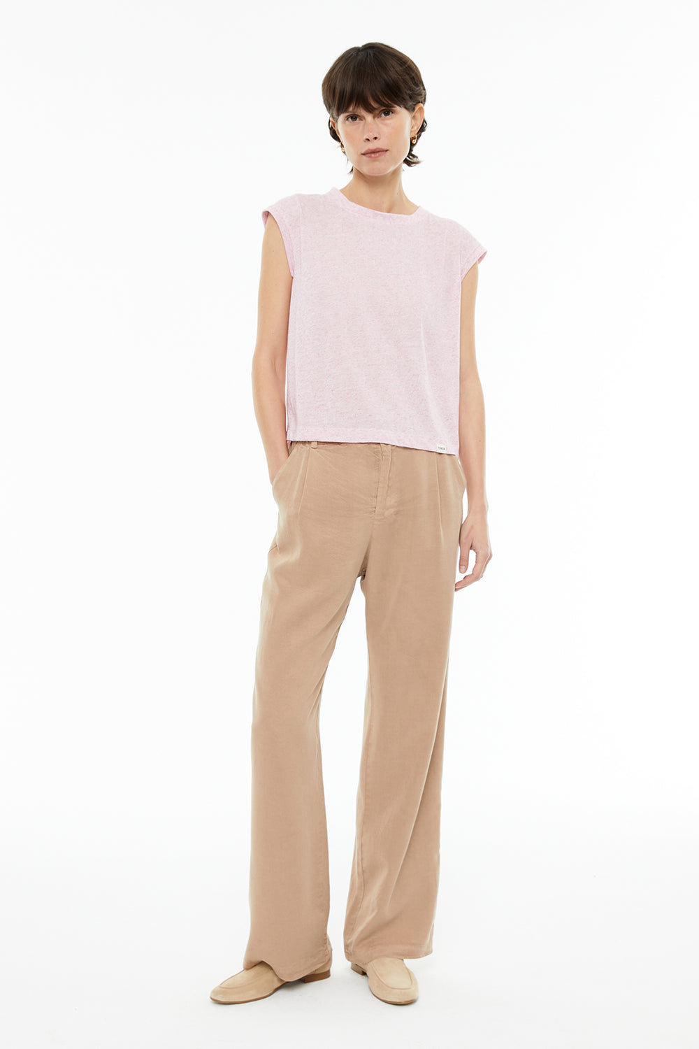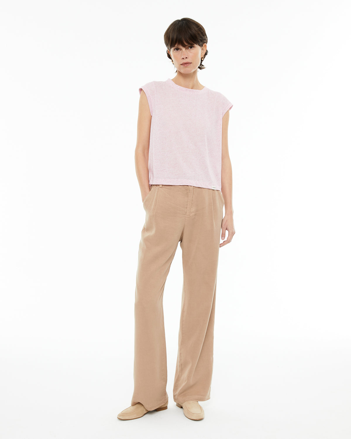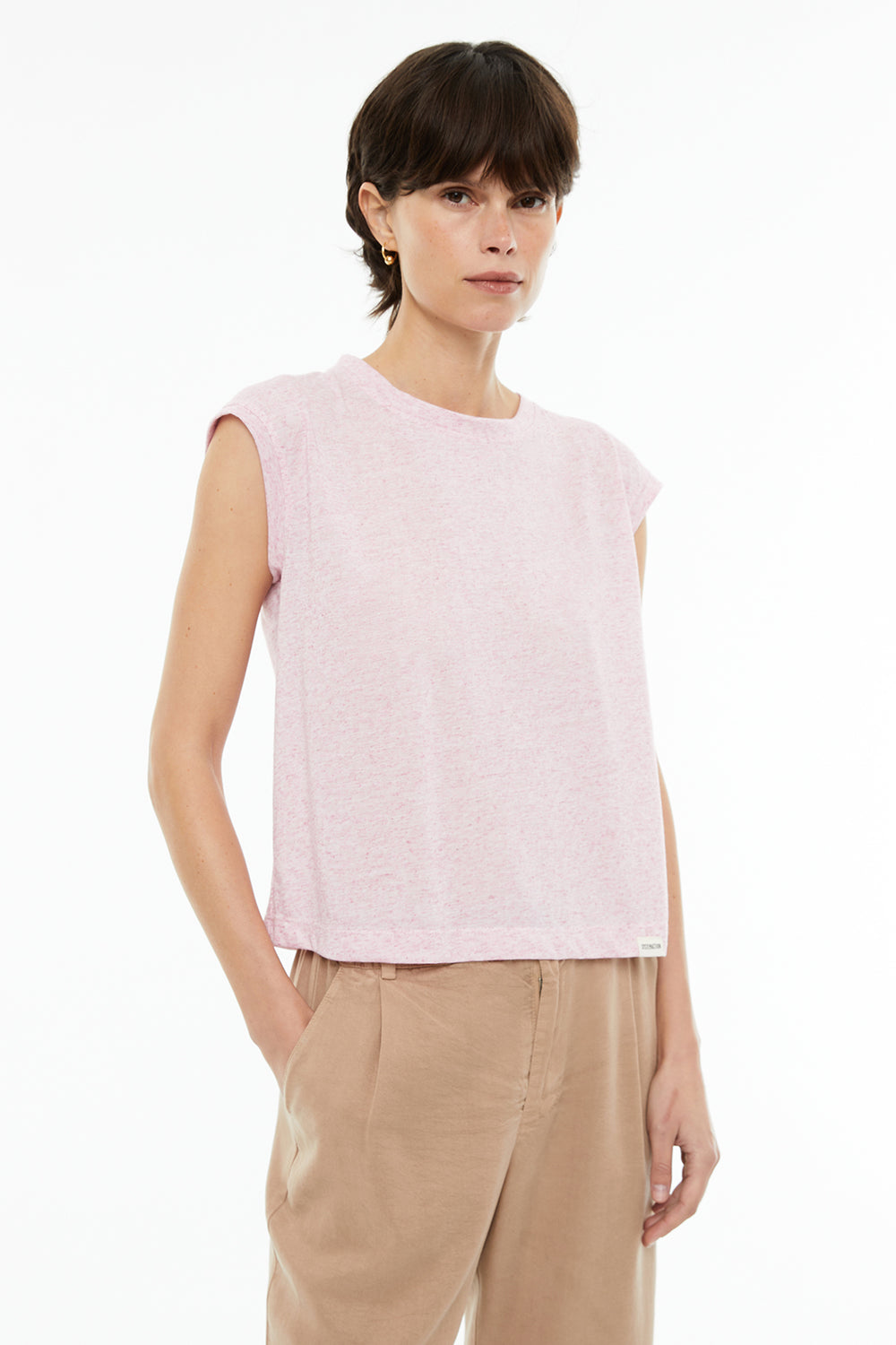 Camiseta de mujer, cuello redondo, sin mangas, con tejido de flamé.